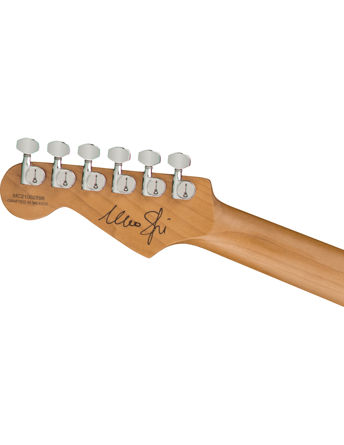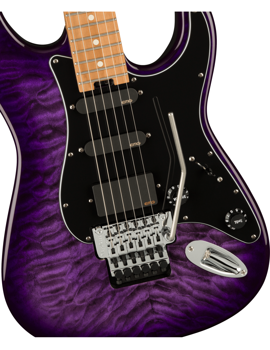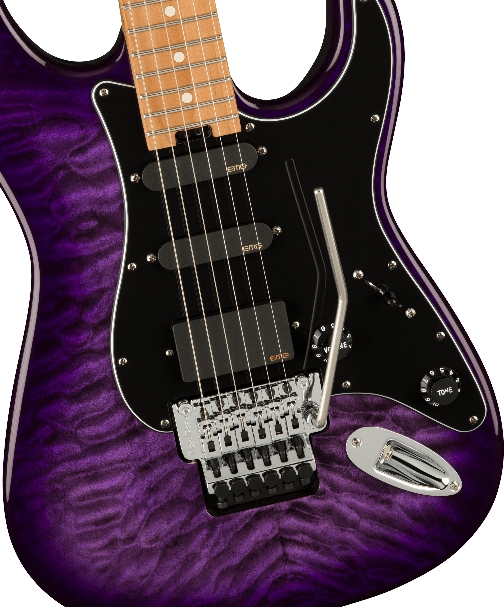 CHARVEL PRO MOD SC1 MARCO SFOGLI SIG. PURPLE BURST est une guitare électrique solid body de style So-Cal 1, modèle Marco Sfogli Signature Pro-Mod avec un corps en Alder (ontano) et une finition brillante, un top en érable Quilt, un manche en érable caramélisé à profil Speed Neck avec bords arrondis et renfort en graphite, un doigté en érable caramélisé à rayon composite 12"-16" avec 22 frettes Jumbo et des incrustations Cream Dots avec points latéraux Luminlay, un sillet Floyd Rose 1000 Series Locking, une tête de guitare Licensed Fender Stratocaster, un matériel chromé, des mécaniques Charvel-Branded pressofuse Strat-Style Skirt, un abaisse-cordes Floyd Rose Retainer Bar et un pont Floyd Rose 1000 Series Double-Locking Tremolo (Recessed). L'électronique active à configuration HSS, consiste en 1 pickup humbucker EMG 89 au pont et 2 pickups single coil EMG SA au centre et au manche, contrôle du volume avec push/pull pour le splitting de la bobine du pickup humbucker, contrôle du ton et sélecteur de pickup à 5 voies.