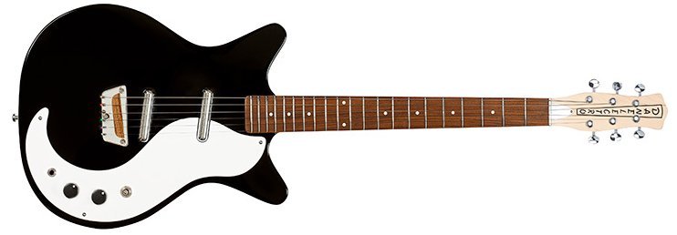 Chitarra elettrica DANELECTRO STOCK 59 colore Black. Le caratteristiche tecniche includono body in pioppo, top in masonite, manico profilo C in acero, tastiera a raggio 14" in palissandro con 21 tasti e intarsi Dots, ponte Wraparound con selletta in legno, configurazione pickup SS con 2 single coil Danelectro Lipsticks.