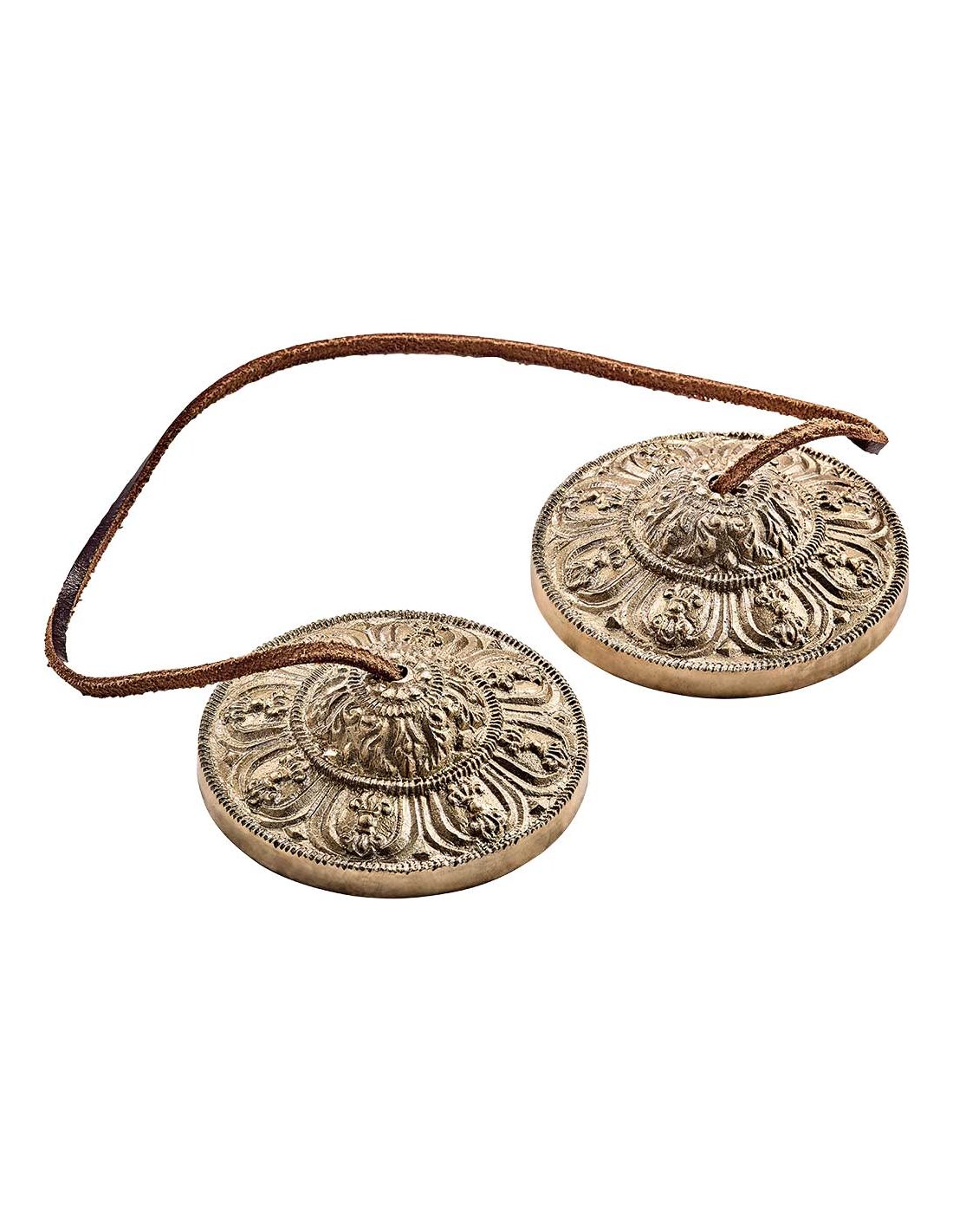 'TINGSHA-OR - Paire de Piattini 3.15'' ORNEMENTAL - Les Thinghsa sont fabriqués artisanalement en Inde dans un alliage spécial de bronze et sont parfaits pour la méditation. Ils incluent également le sac en coton où il est possible de les ranger et de les transporter.'