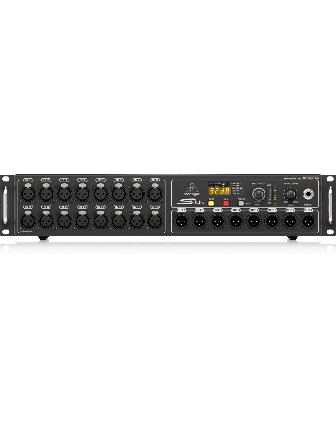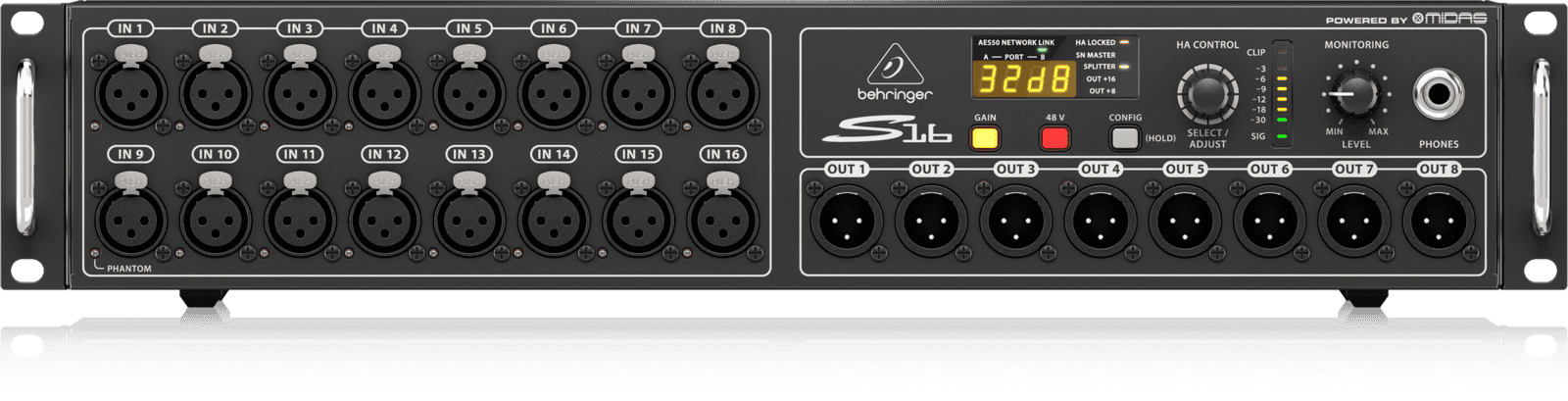 BEHRINGER S16. Boîte de scène numérique avec 16 préamplis micro et 8 sorties XLR équilibrées. Les caractéristiques techniques incluent 16 entrées micro via des connecteurs XLR 3 broches programmables et contrôlables à distance, 8 sorties XLR analogiques servo-équilibrées, ports réseau AES50 dotés de la technologie Klark Teknik Supermac, connexion unique au FOH via un câble réseau CAT-5 avec une capacité de mise en réseau de 100m, affichage avec des indicateurs LED à 7 segments pour le contrôle du signal sur scène, sortie casque assignable à chaque canal pour le monitoring sur scène, doubles sorties ADAT, MIDI In/Out, bouton pour l'alimentation fantôme +48V.