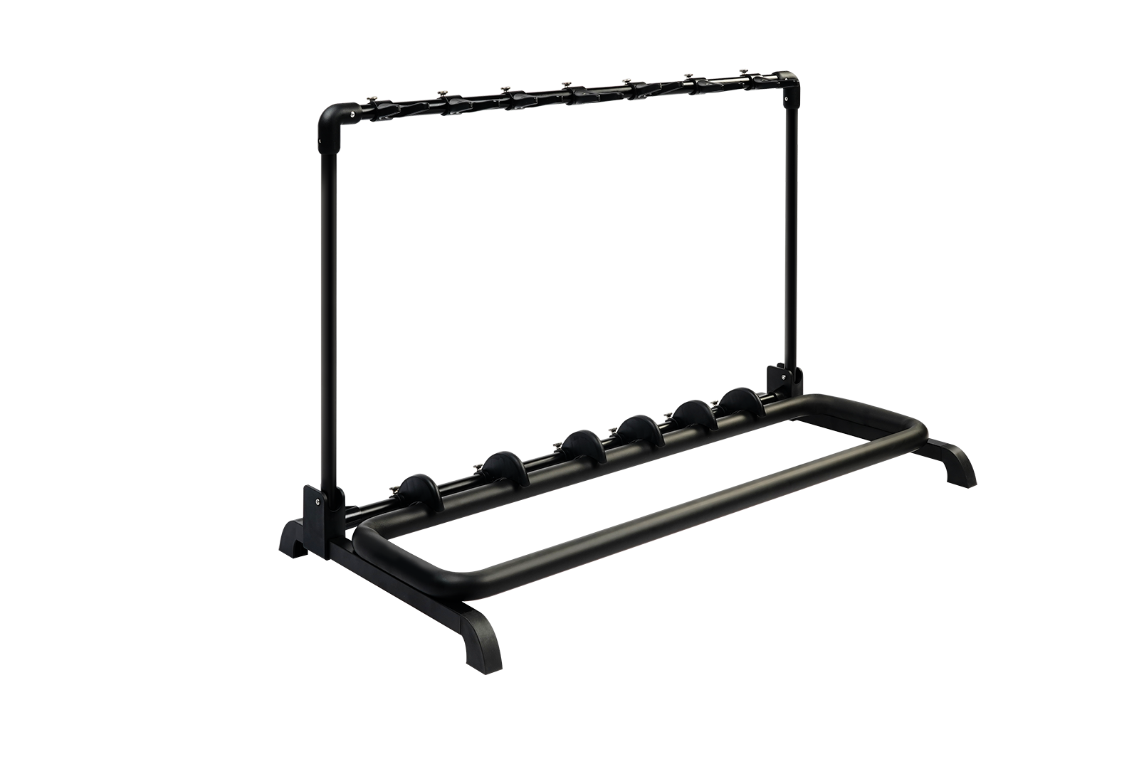 GUITTO PAR JOYO GGS-11 est un support multiple pour guitares/basses, capable d'accueillir 7 instruments, avec une structure en métal, des parties de contact recouvertes de mousse protectrice, des positions pour instruments réglables, un design pliable et une capacité maximale de 30 Kg