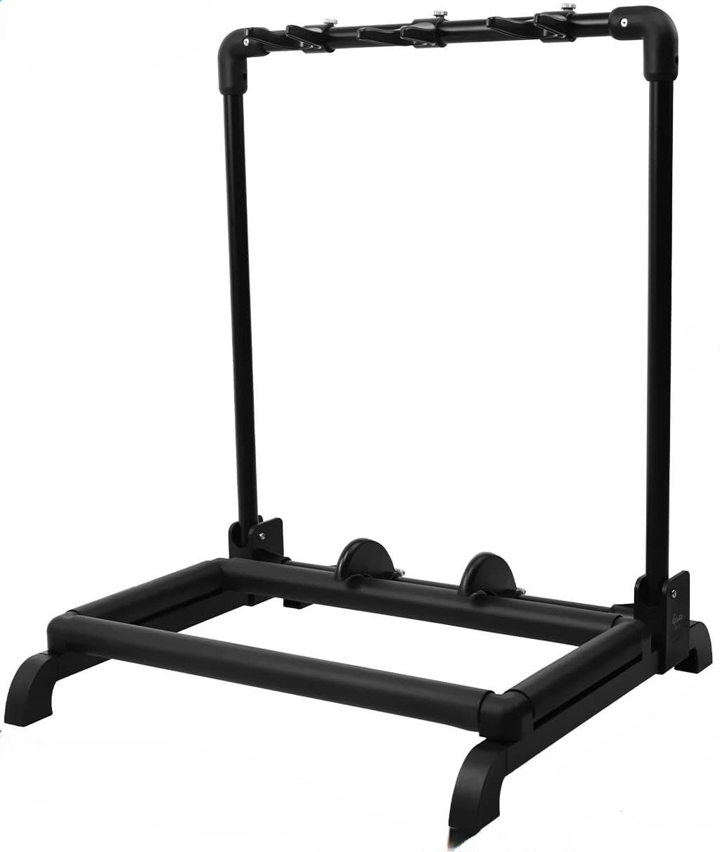 GUITTO PAR JOYO GGS-12 SUPPORT POUR 3 GUITARES est un support multiple pour guitares/basses, capable d'accueillir 3 instruments, avec une structure en métal, des parties de contact recouvertes de mousse protectrice, des positions pour instrument réglables, un design pliable et une charge maximale de 30 Kg
