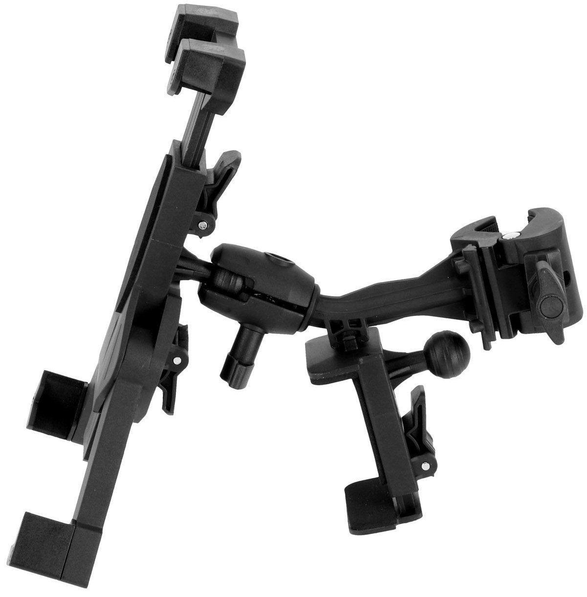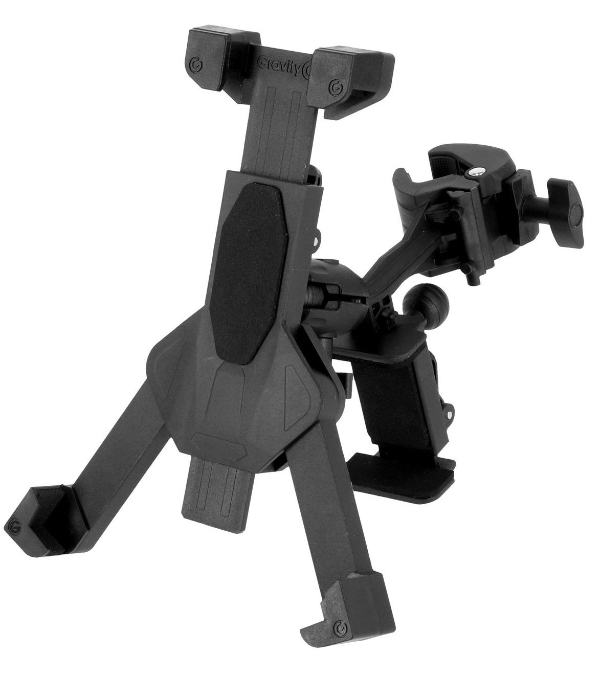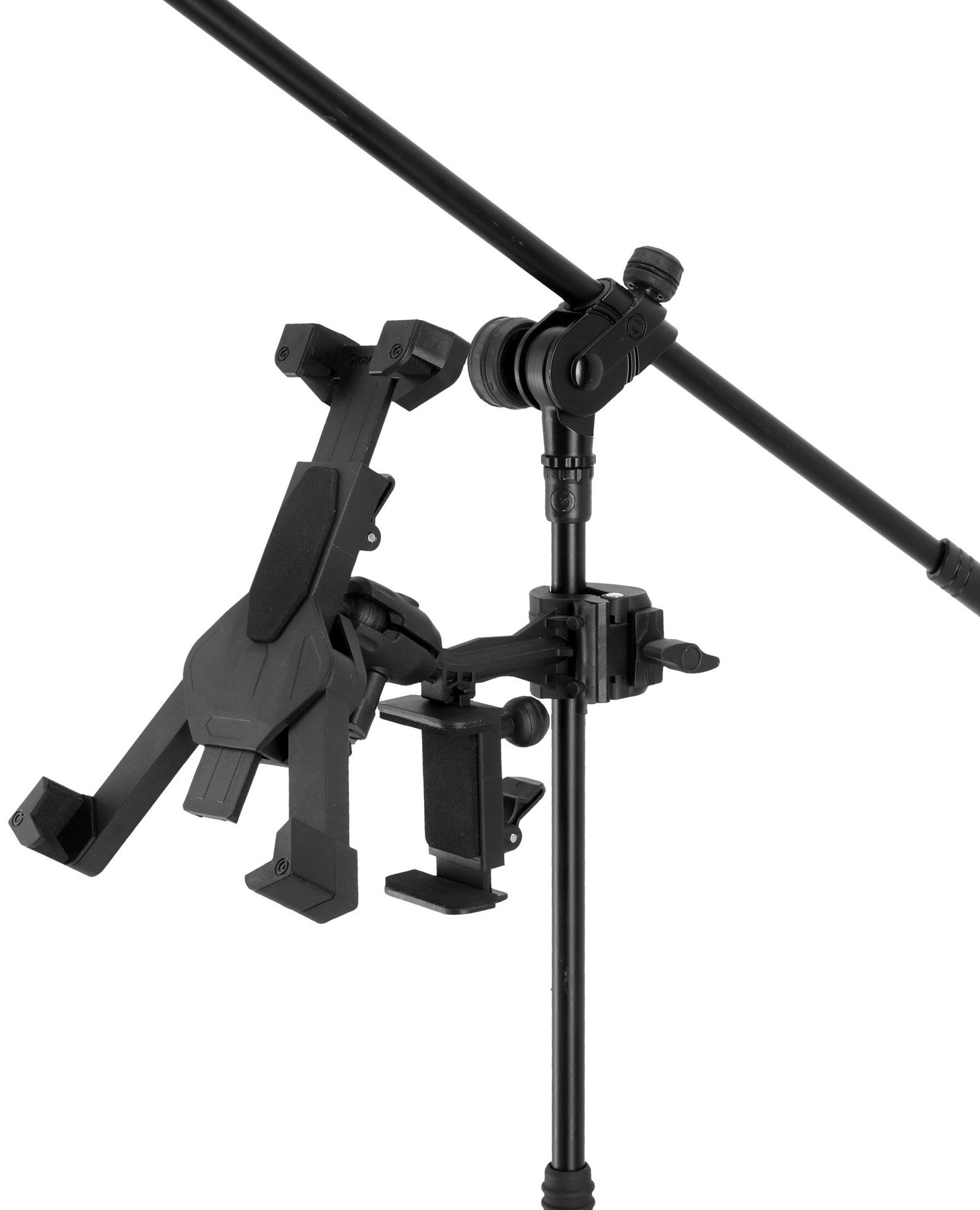 GRAVITY MA T TH01 TABLET HOLDER est un support universel pour tablette pouvant être monté sur un pied de micro avec un attachement à pince, des bras réglables et pliables, un support supplémentaire pour powerbank ou smartphone rotatif avec articulation à boule. Inclut un adaptateur pour montage sur tube carré ou de table, support de montage.