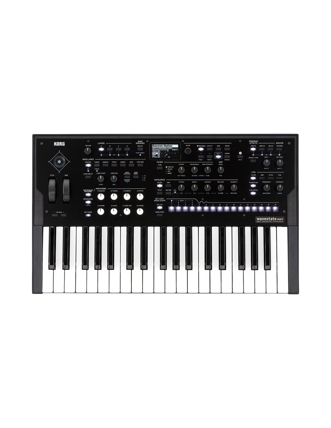wavestate mk II est un synthétiseur multitimbrique à 4 parties (appelées couches) gérables également via des canaux MIDI séparés, assignables à différentes extensions du clavier en Split et/ou Layer. Chaque couche dispose d’une chaîne de traitement indépendante, avec filtre multimode, enveloppes, modulations, effets et un arpégiateur dédié. wavestate mk II repose sur le système de synthèse avancé WaveSequencing 2.0 caractérisé par des sons évolutifs et d’atmosphère, capables de stimuler et de satisfaire les besoins timbrales des nouvelles générations de musiciens, producteurs et compositeurs. Grâce à la capacité offerte par cette technologie de séparer, traiter et moduler séparément des paramètres tels que la vitesse du temps, la séquence des échantillons et la fréquence (Pitch), ce synthétiseur avancé peut générer des timbres cinématiques, naturels et remarquablement innovants. Korg Wavestate mk II va bien au-delà de la nostalgique réédition de la Wavestation originale, c’est un projet entièrement nouveau inspiré par des sources sonores telles que des synthétiseurs modulaires, des Groove boxes et des générateurs algorithmiques.
