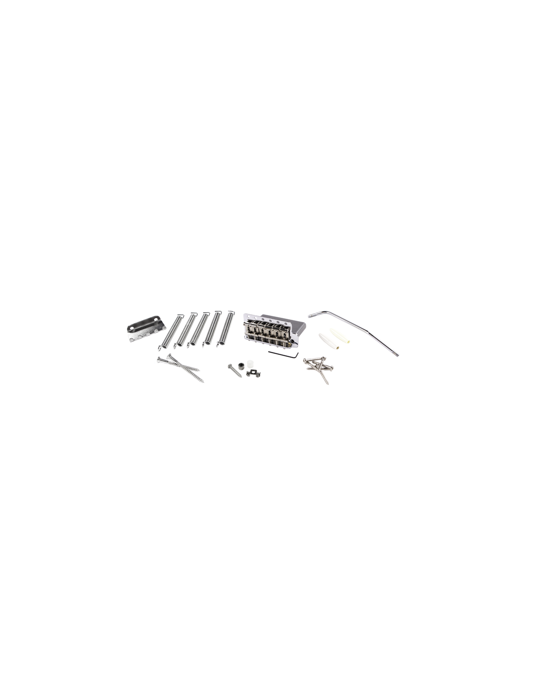 FENDER AMERICAN VINTAGE TREMOLO ASSEMBLY est un kit d'assemblage pour le pont Tremolo Fender Stratocaster Vintage, constitué de 6 selletes pliées avec vis et ressorts, plaque et ressorts du tremolo, levier de tremolo avec pointe blanche de style vintage et clé Allen de réglage.