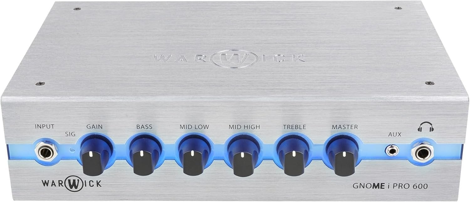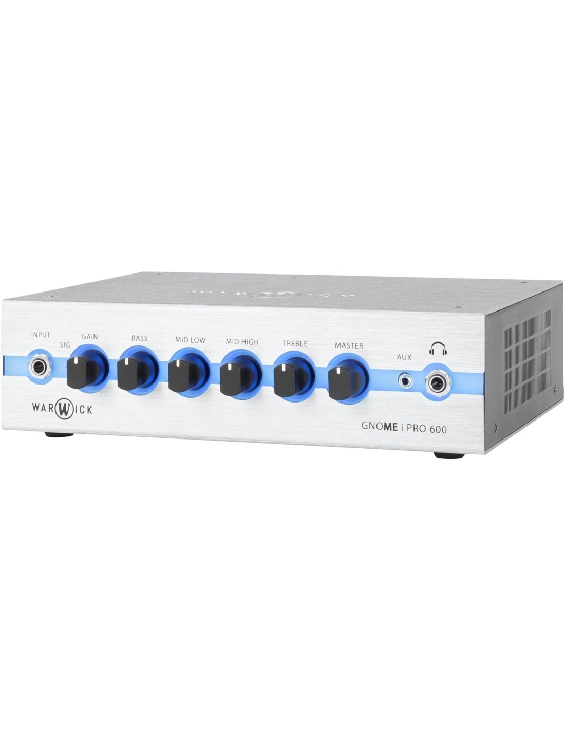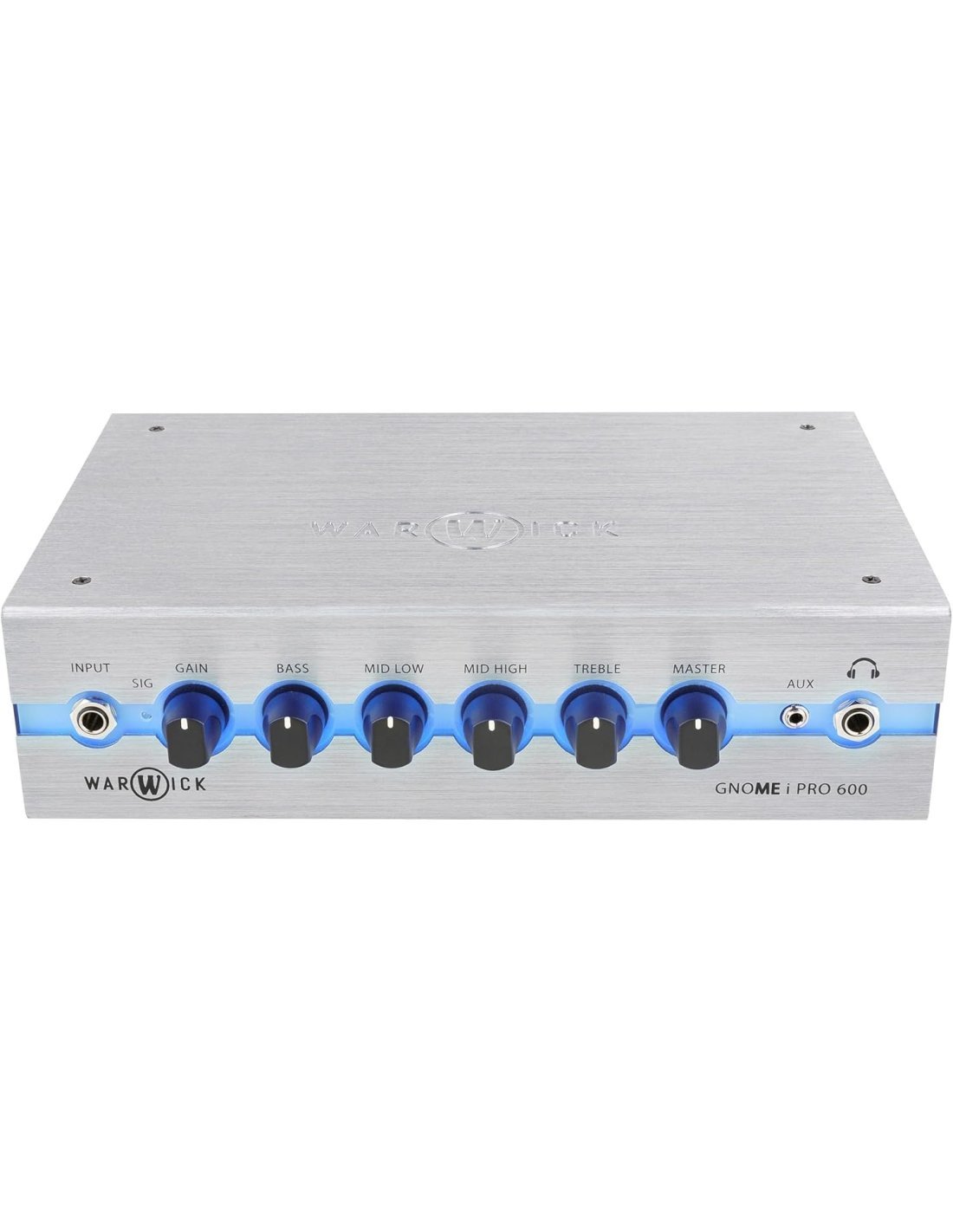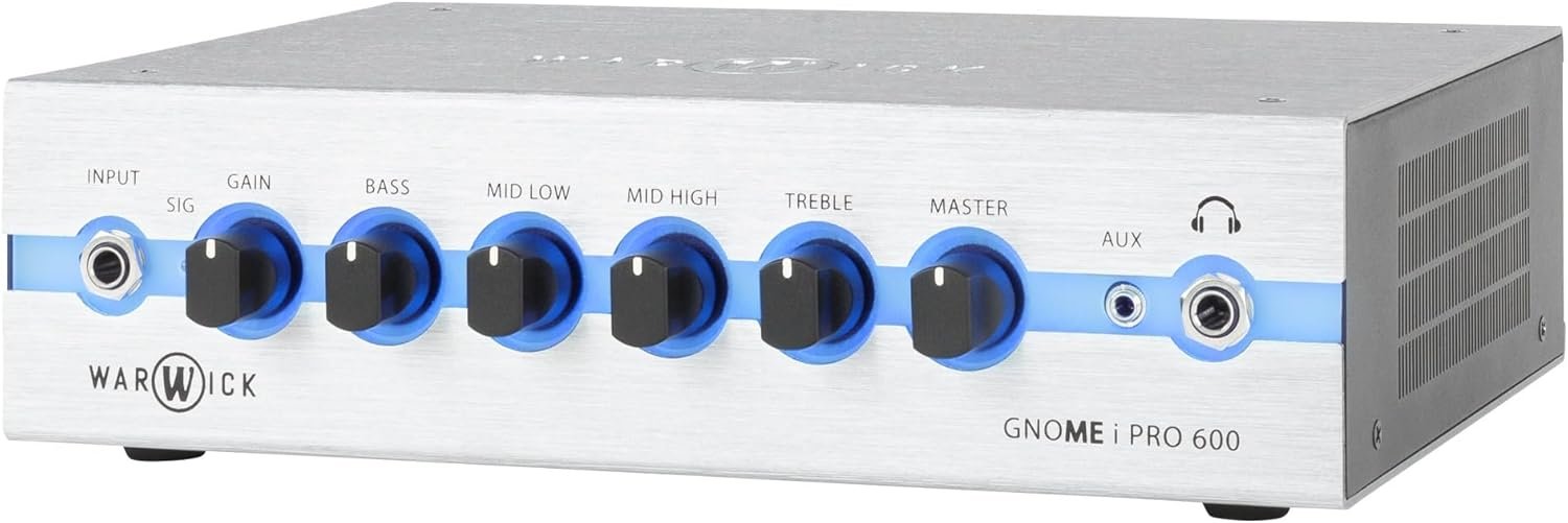 WARWICK GNOME i PRO 6 V2 600 WATT est une tête d'ampli basse compacte à état solide avec 600 W de puissance en classe D à 4 Ohm et 350 W à 8 Ohm. Les caractéristiques techniques incluent une interface audio USB intégrée pour des enregistrements directs sur Daw, des contrôles Gain, Master, Eq à 4 bandes Bass/Mid High/Mid Low/Treble, une entrée Aux via jack 3,5mm TRS pour des sources audio, une sortie casque via jack 6,3mm. Sur le panneau arrière, elle présente une sortie D.I. Out équilibrée via XLR avec bouton Ground Lift, FX send/return sur connecteurs jack 6,3mm, sorties haut-parleur sur connecteurs Twist Lock et sortie USB-B out.