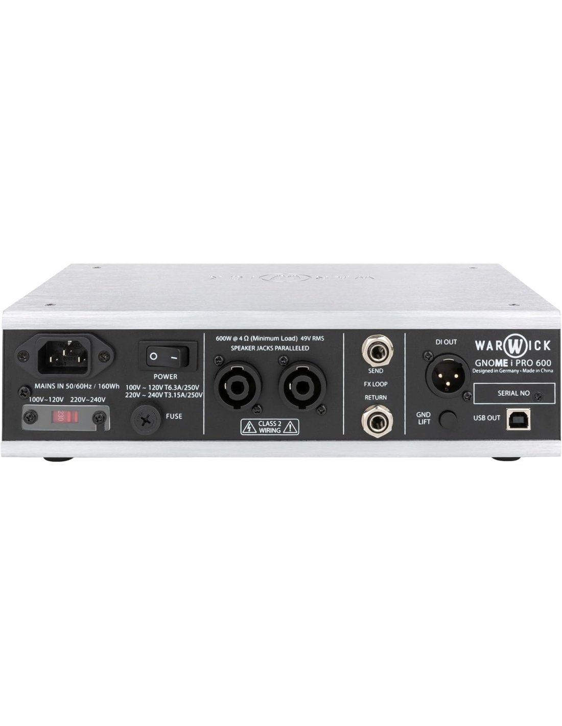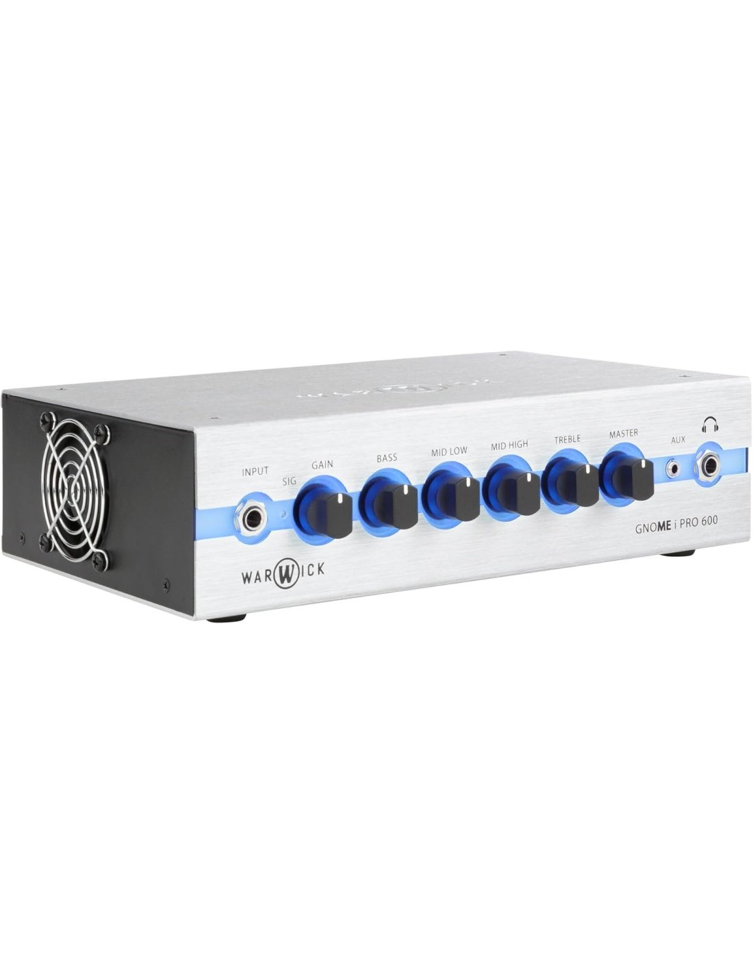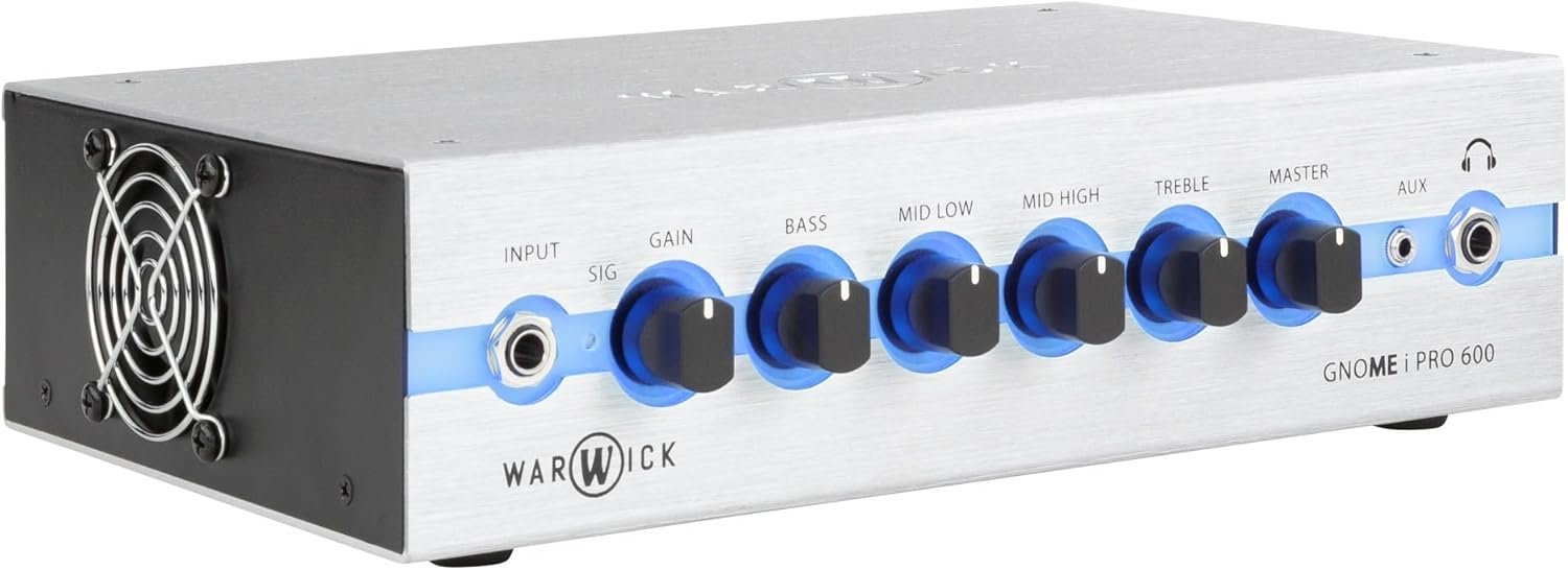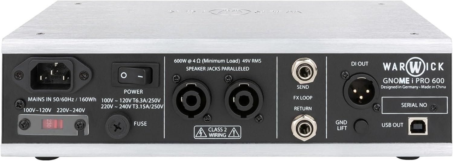 WARWICK GNOME i PRO 6 V2 600 WATT est une tête d'ampli basse compacte à état solide avec 600 W de puissance en classe D à 4 Ohm et 350 W à 8 Ohm. Les caractéristiques techniques incluent une interface audio USB intégrée pour des enregistrements directs sur Daw, des contrôles Gain, Master, Eq à 4 bandes Bass/Mid High/Mid Low/Treble, une entrée Aux via jack 3,5mm TRS pour des sources audio, une sortie casque via jack 6,3mm. Sur le panneau arrière, elle présente une sortie D.I. Out équilibrée via XLR avec bouton Ground Lift, FX send/return sur connecteurs jack 6,3mm, sorties haut-parleur sur connecteurs Twist Lock et sortie USB-B out.
