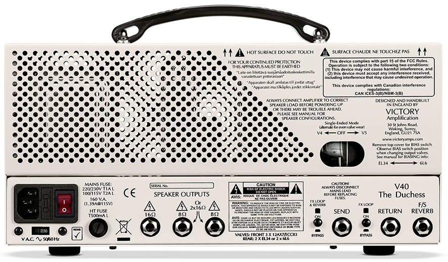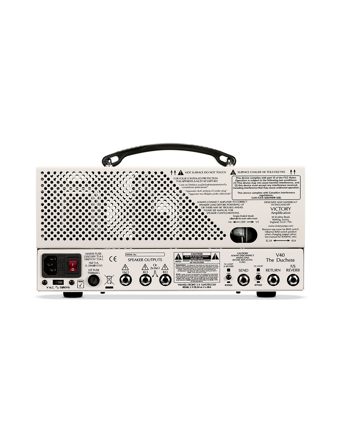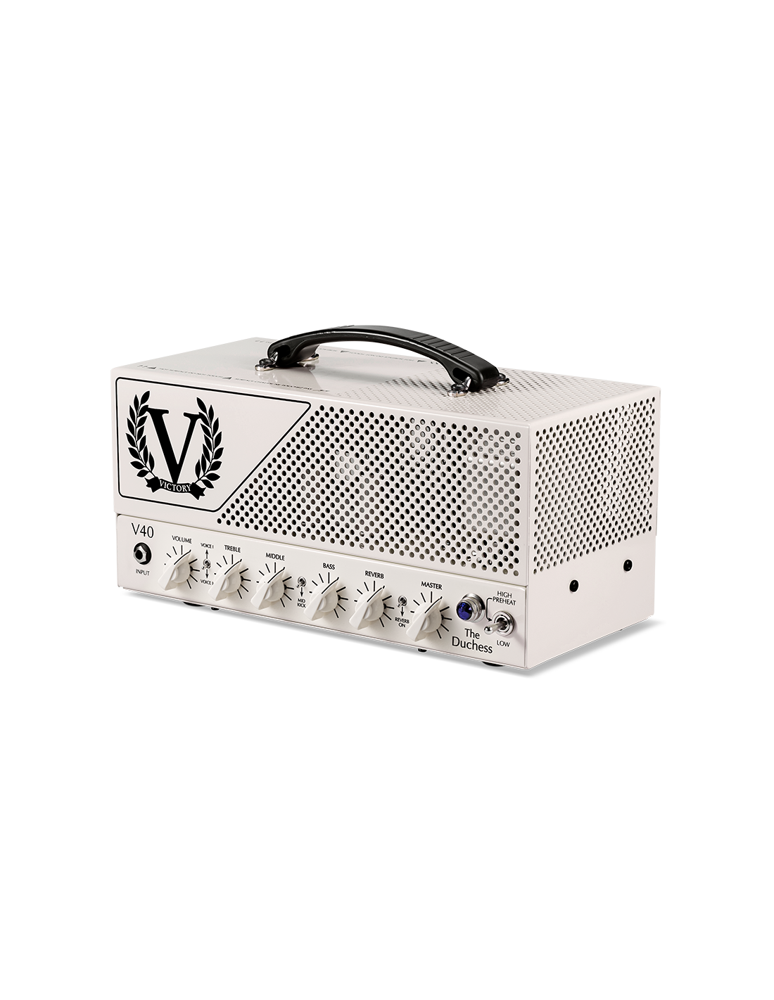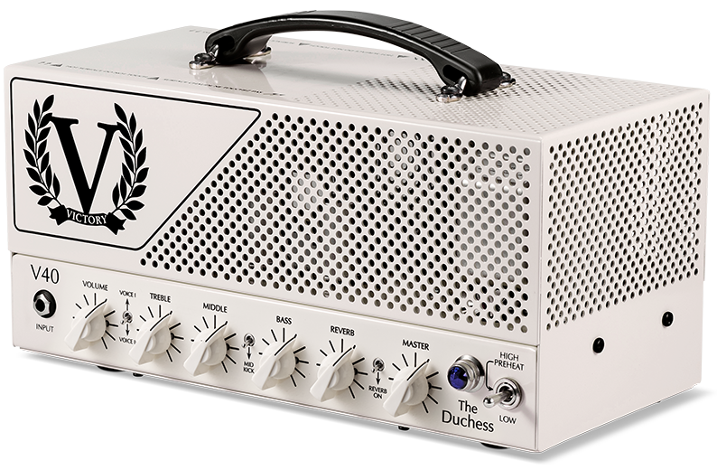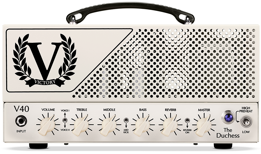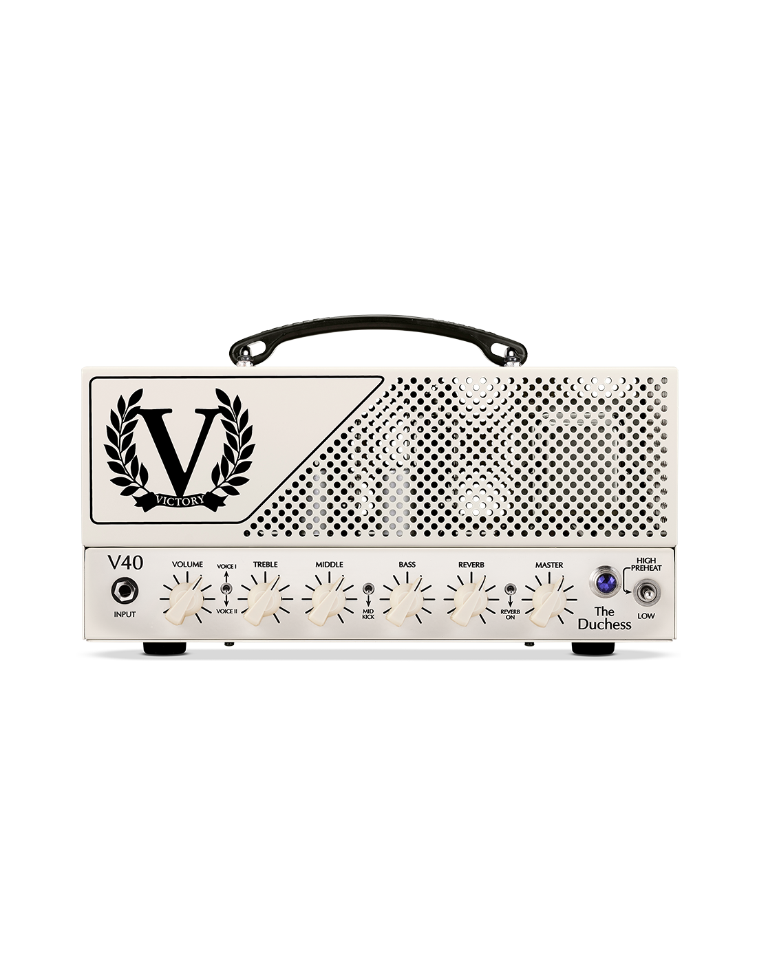 Tête pour Guitare Électrique Victory V40 The Duchess 40W Tête à Lampes Artisanale. La Victory V40 The Duchess 40W Tête à Lampes Artisanale est une tête à lampes pour guitare électrique de 40 watts avec 3 lampes 12AX7, 2 lampes EL34, contrôles Volume, commutateur Voice I/II, Aigu, Medium, commutateur Mid Kick, Grave, Reverb, commutateur Reverb On, Master, boucle d'effets avec hard-bypass, mode monopolaire (1.5W, 0.5W).