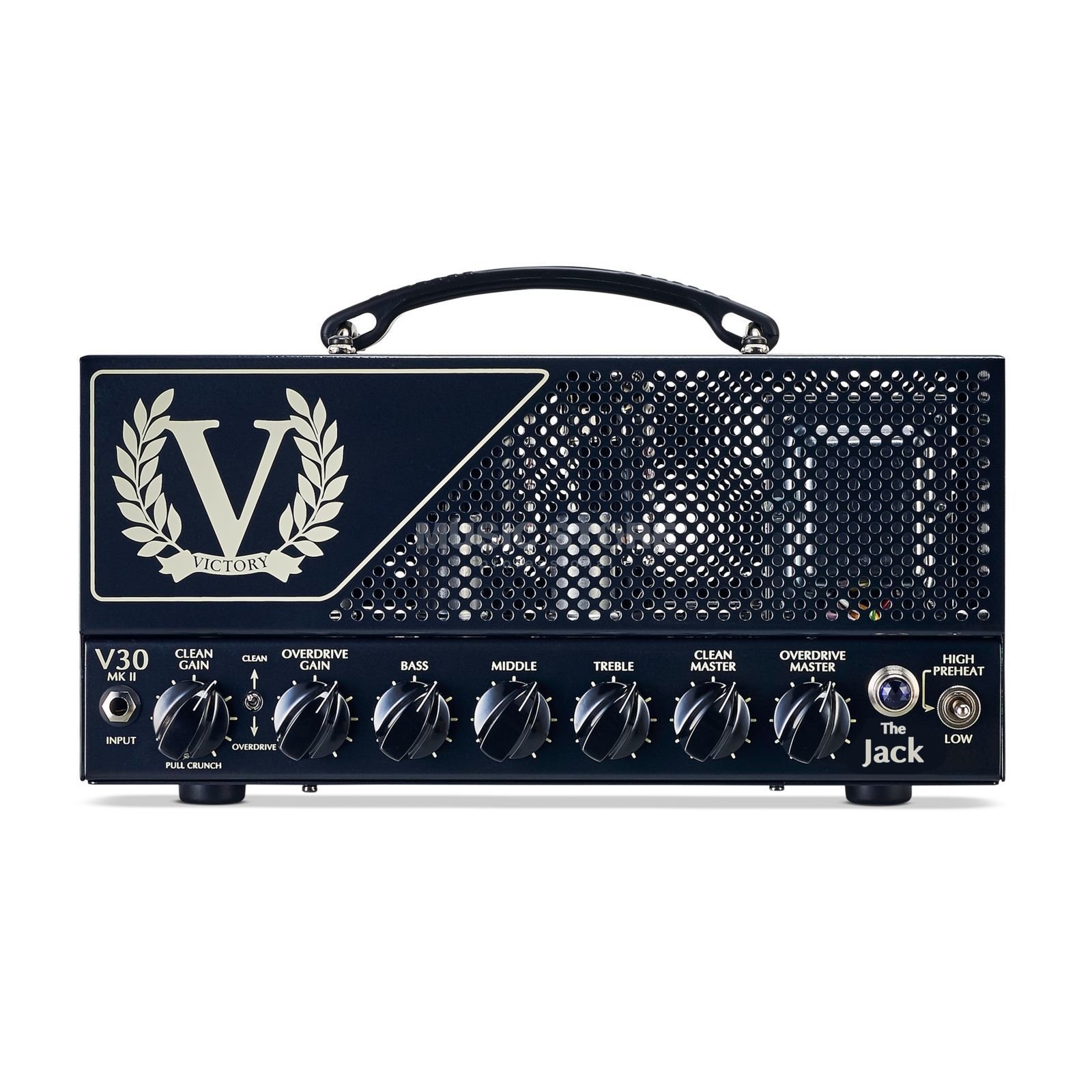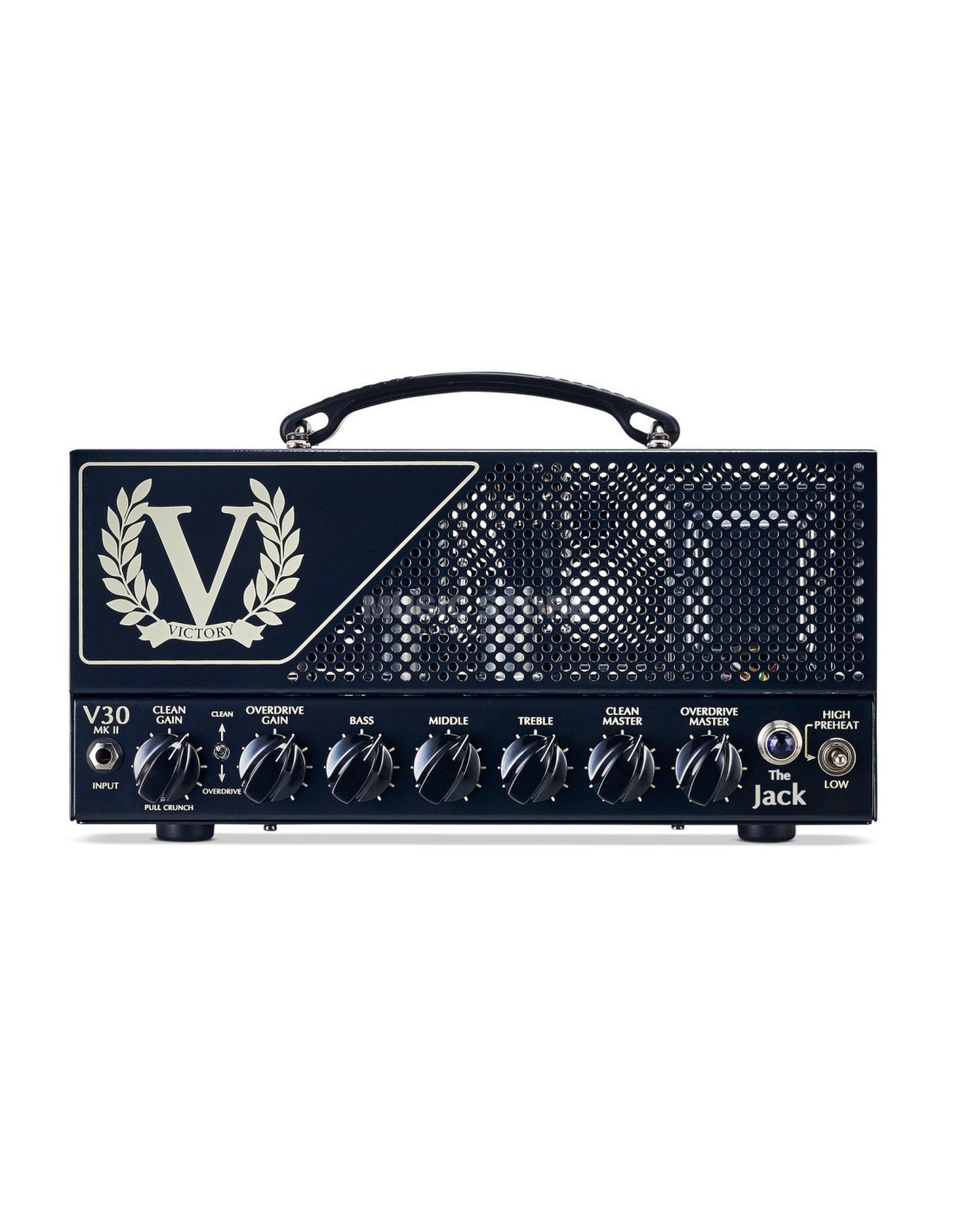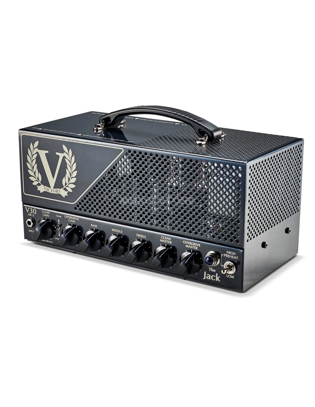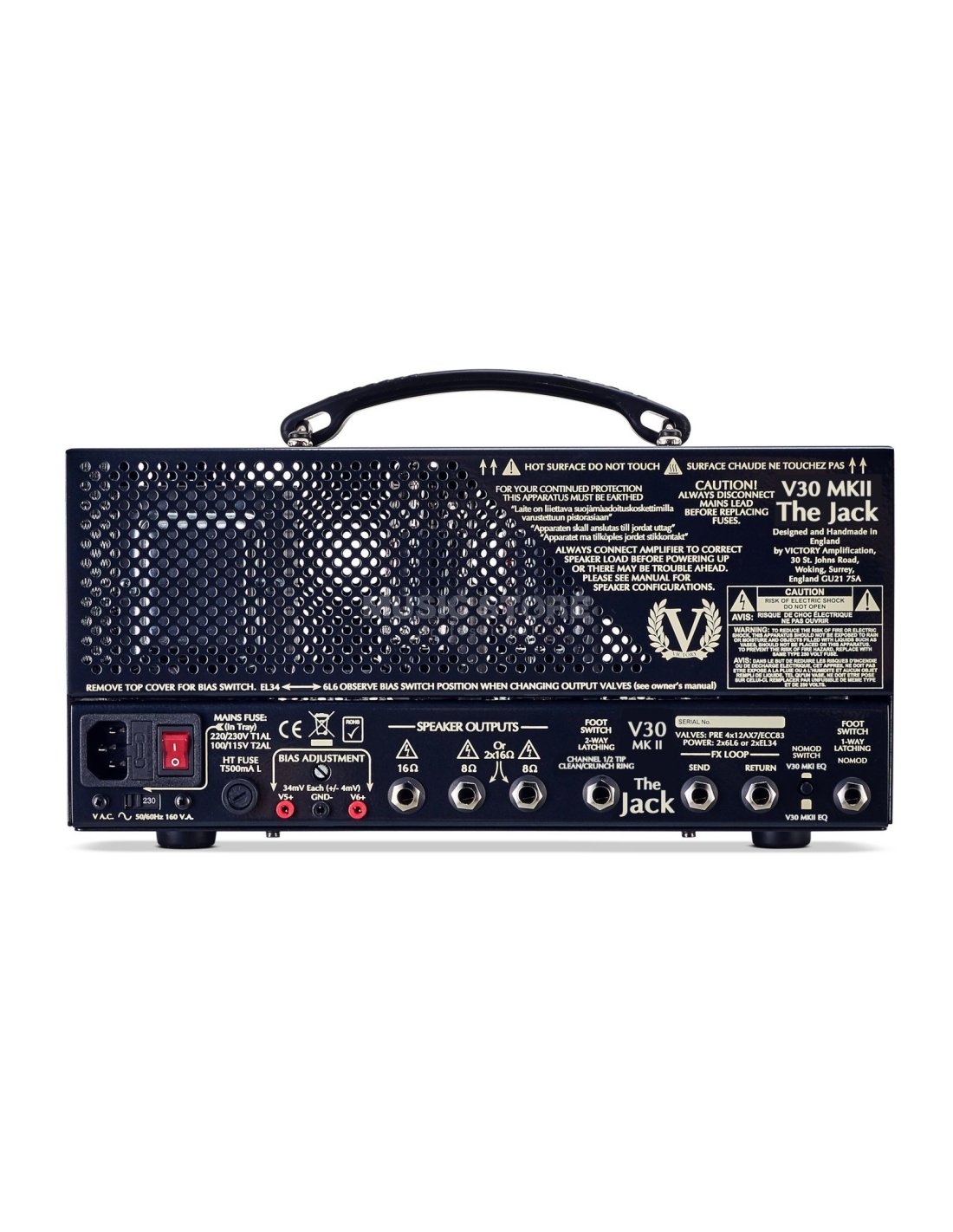 VICTORY V30 MKII THE JACK est une tête d'ampli à lampes Launchbox à 2 canaux pour guitare électrique avec 42W de puissance réduisible à 7W et des circuits inspirés et développés avec le guitariste Guthrie Govan. Les caractéristiques techniques incluent un étage de puissance avec 2 lampes 6L6, un préamplificateur avec 4 lampes 12AX7, un canal Clean avec des contrôles Gain, Master et push/pull sur le contrôle Gain pour activer la mode Crunch, un canal Overdrive avec des contrôles de Gain et Master, un Eq à 3 bandes Bass/Middle/Treble pour les deux canaux, un interrupteur Momod à l'arrière pour commuter l'Eq des amplificateurs Victory Countess MKI et Countess MKII, un commutateur de plage BIAS pour le passage aux lampes EL34. Il présente également 2 sorties haut-parleur de 8 Ohm et 1 de 16 Ohm, FX Loop Send/Return, 2 entrées footswitch.
