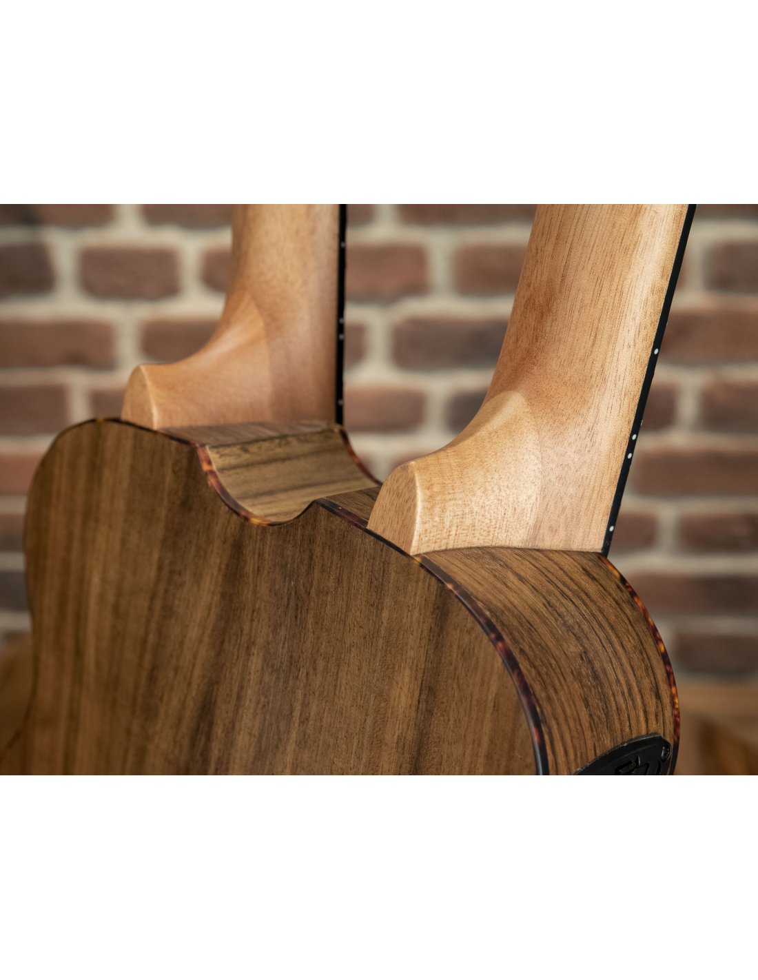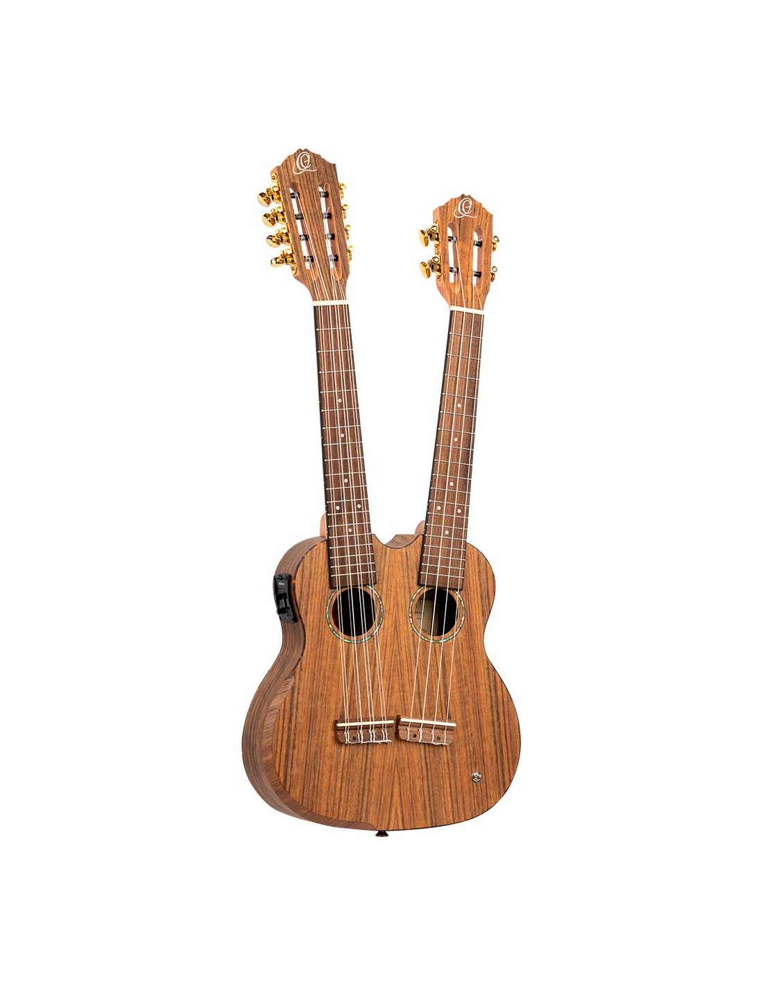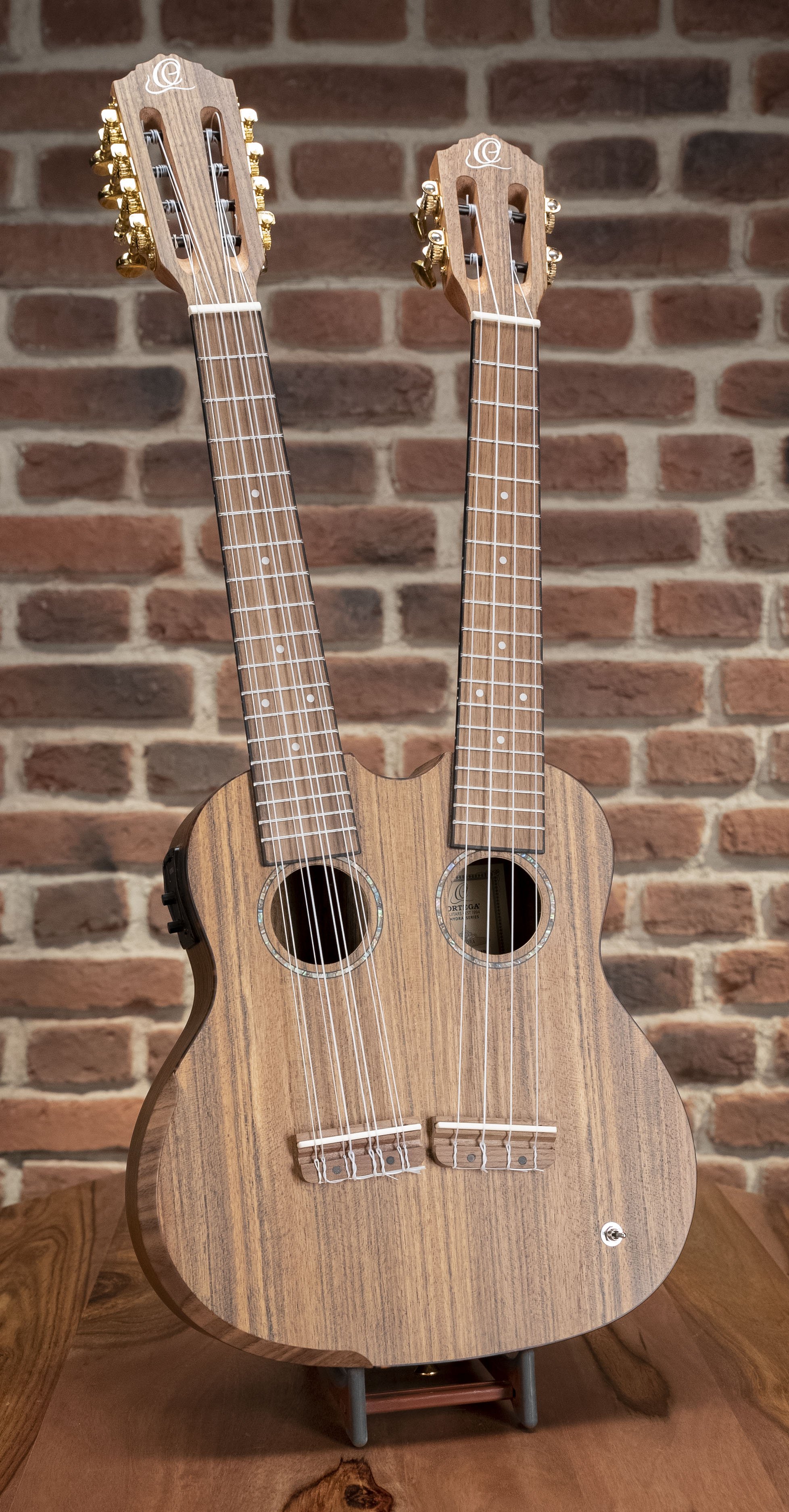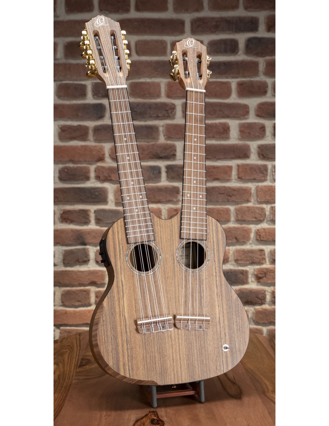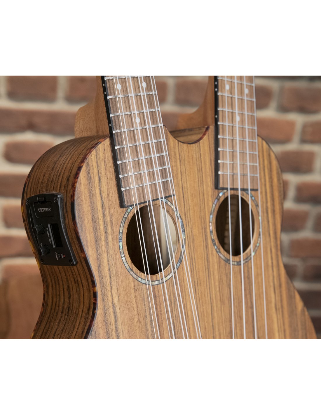 Ukulele ténor électro-acoustique à double manche HYDRA Custom Built Series. Un manche monte 4 cordes et l'autre 8. Corps et table en ovangkol, manches en acajou, ponts, binding et pickguard en noyer. Finition naturelle à pores ouverts. Mécaniques dorées. Électronique Ortega avec sélecteur à 3 voies (4 cordes, 8 cordes ou 4+8 cordes). Monte des cordes Ortega UWNY-4-TE et UWNY-8-TE. Sac spécial inclus.