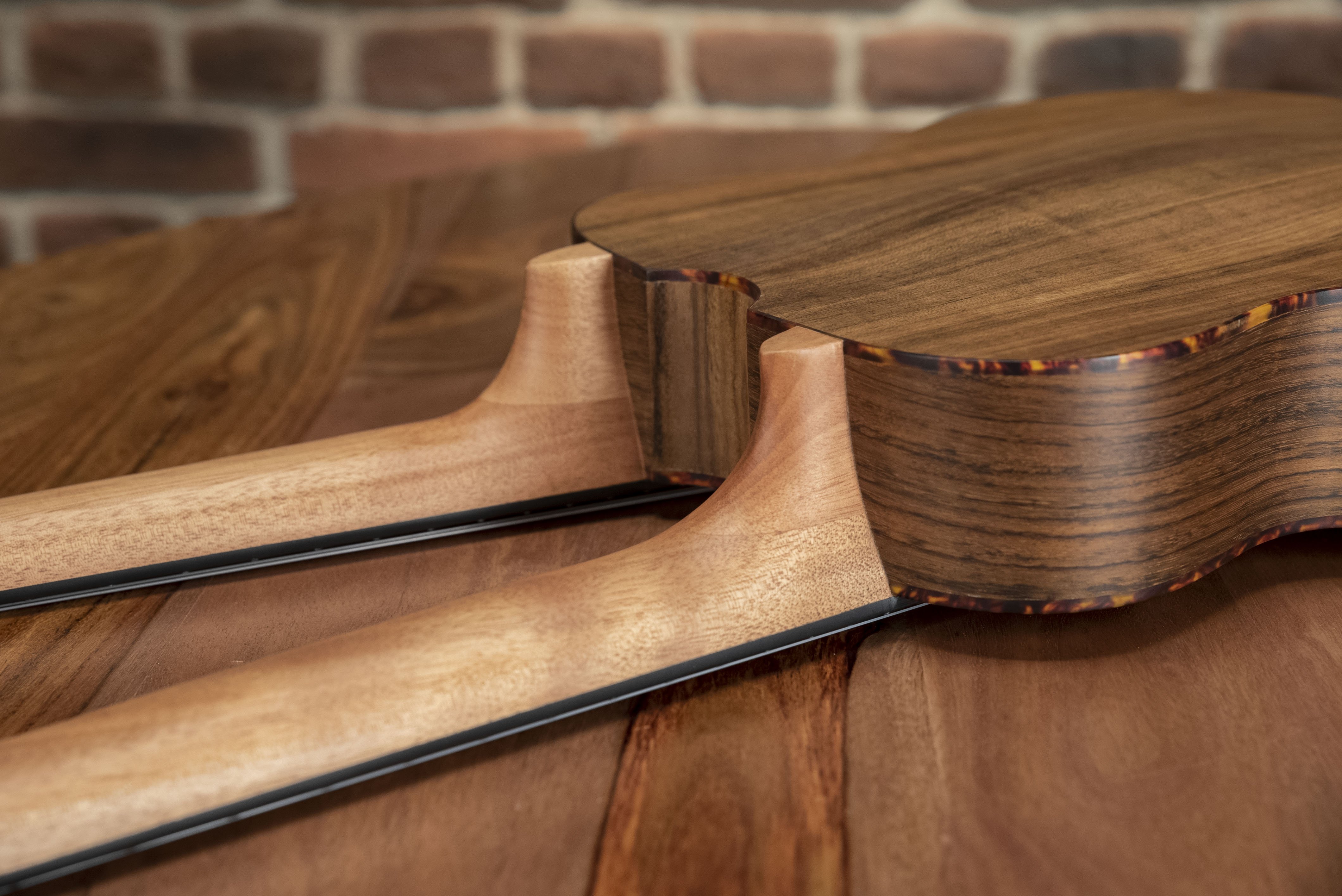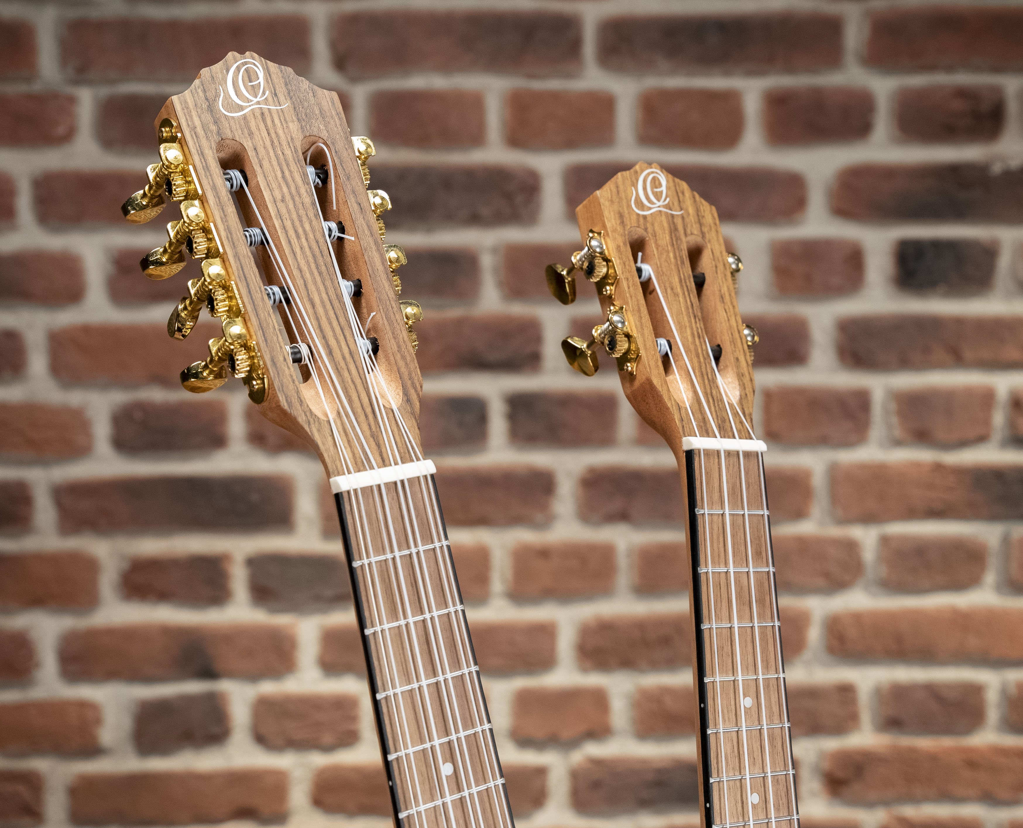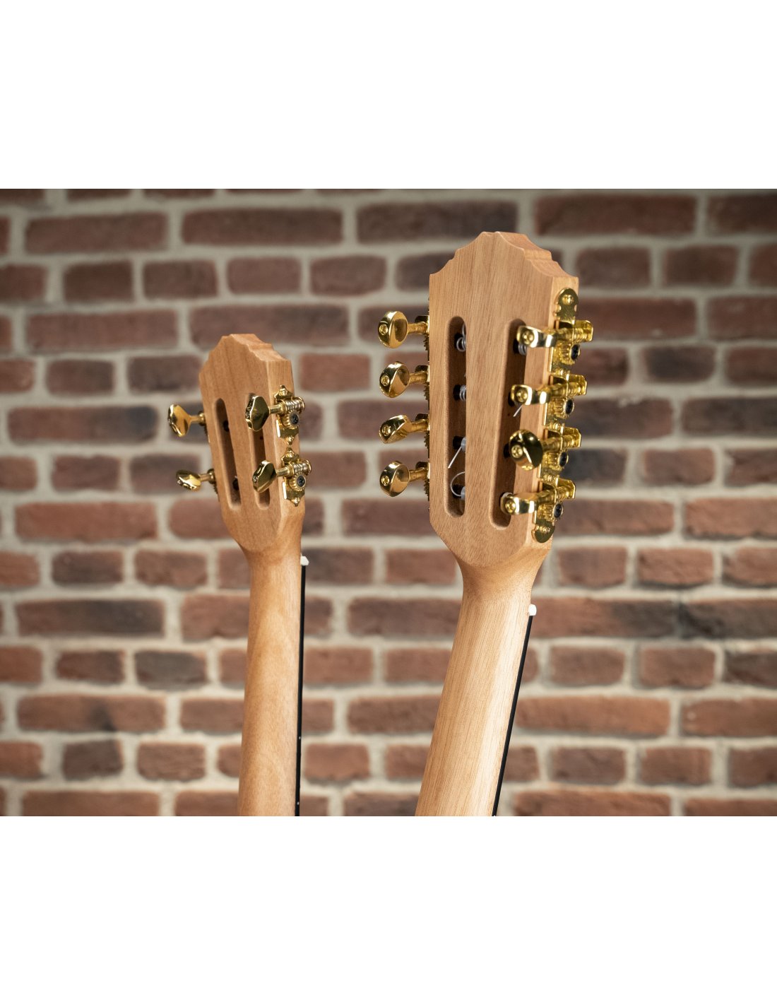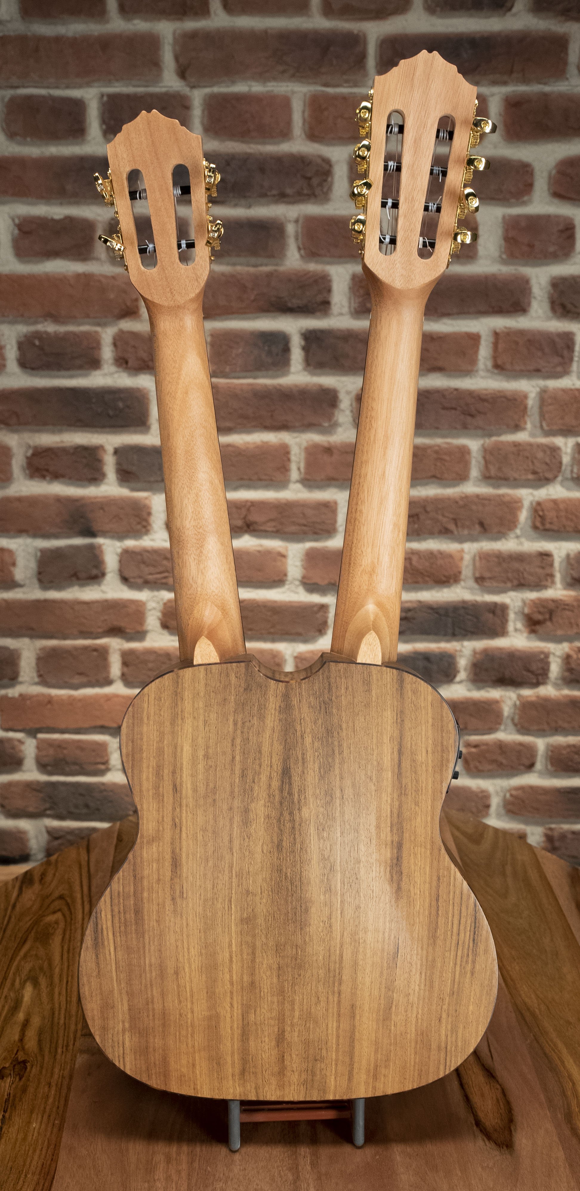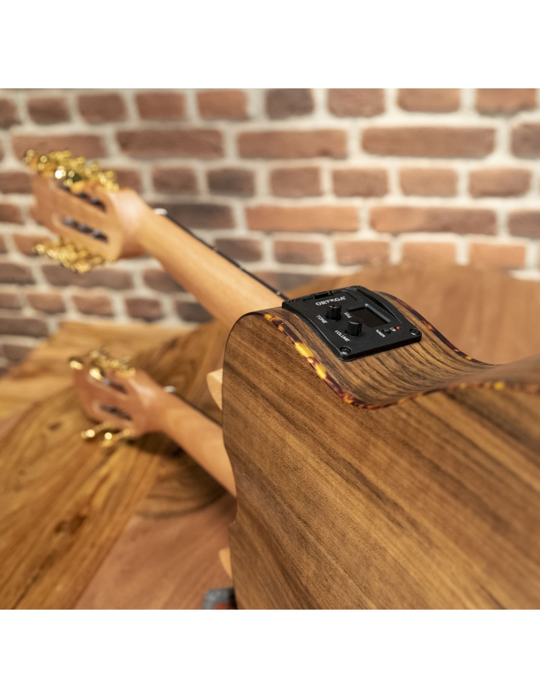 Ukulele ténor électro-acoustique à double manche HYDRA Custom Built Series. Un manche monte 4 cordes et l'autre 8. Corps et table en ovangkol, manches en acajou, ponts, binding et pickguard en noyer. Finition naturelle à pores ouverts. Mécaniques dorées. Électronique Ortega avec sélecteur à 3 voies (4 cordes, 8 cordes ou 4+8 cordes). Monte des cordes Ortega UWNY-4-TE et UWNY-8-TE. Sac spécial inclus.