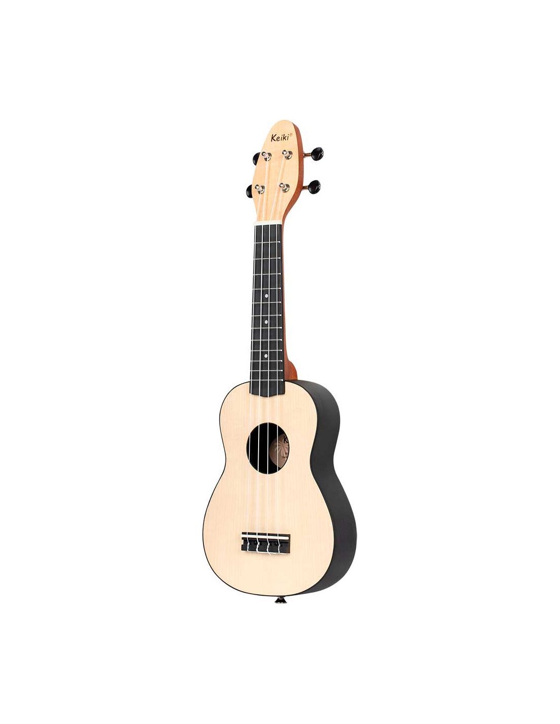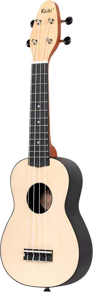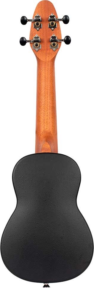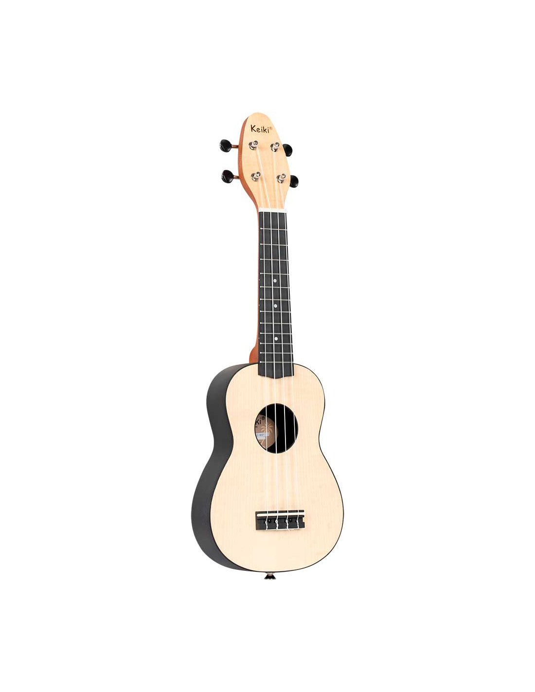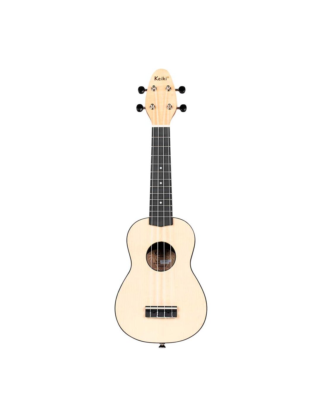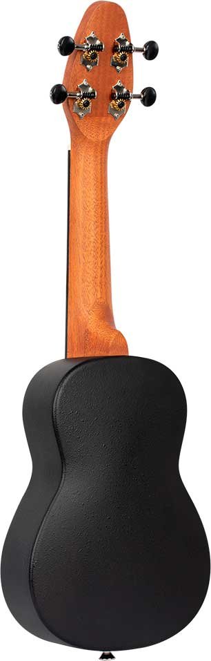 Pack ukulélé soprano + accordeur + sangle + médiators + sac de transport. Ukulélé avec chevalet, touche et corps courbé en fibre. Table en bois d'érable.