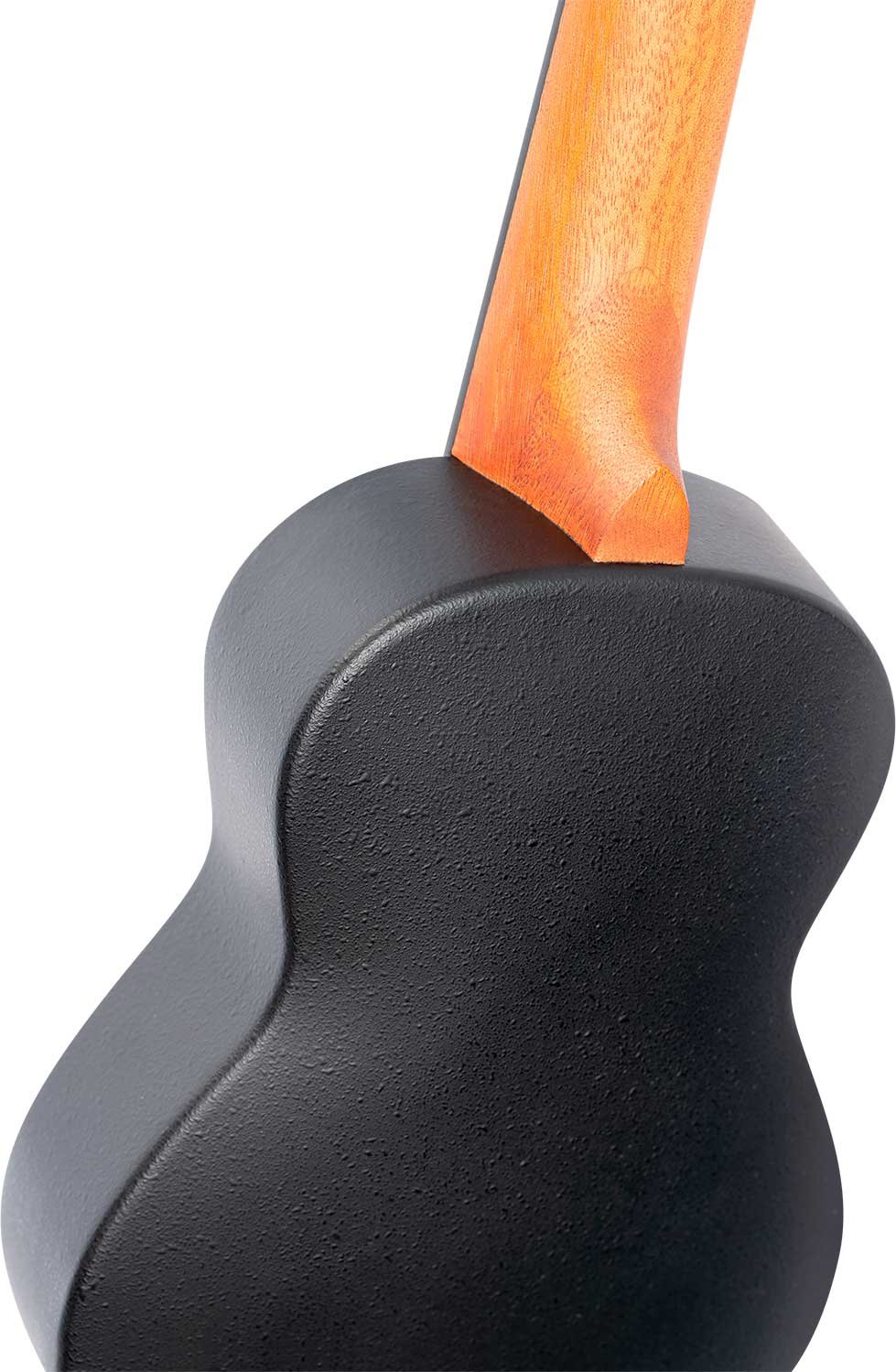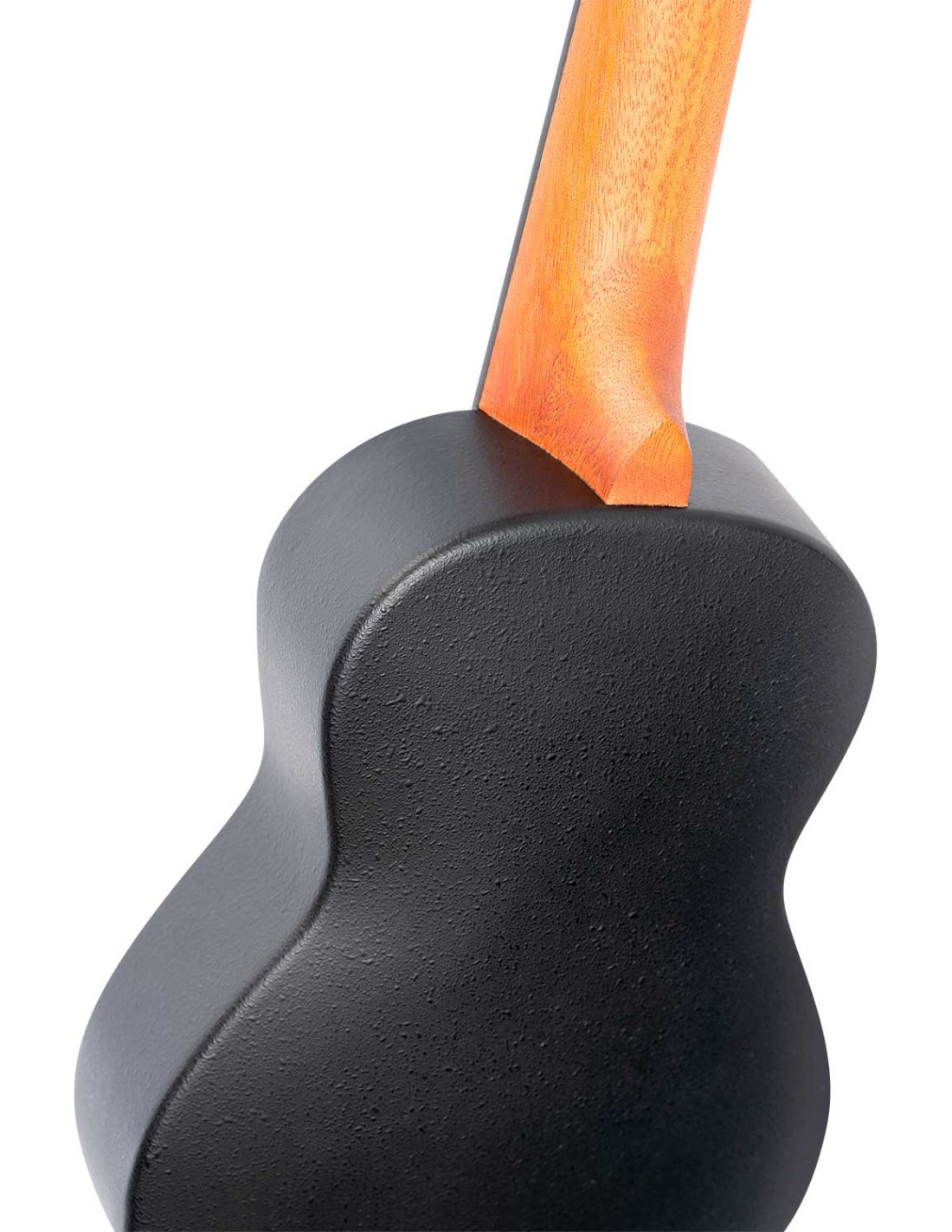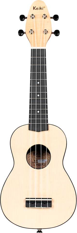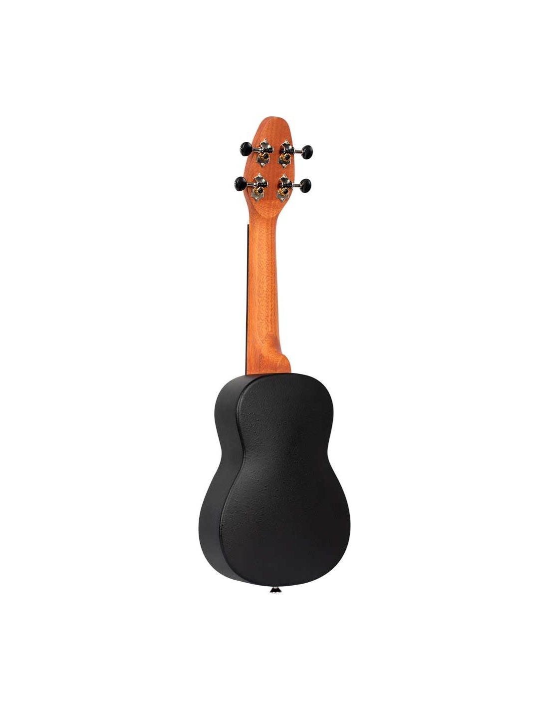 Pack ukulélé soprano + accordeur + sangle + médiators + sac de transport. Ukulélé avec chevalet, touche et corps courbé en fibre. Table en bois d'érable.