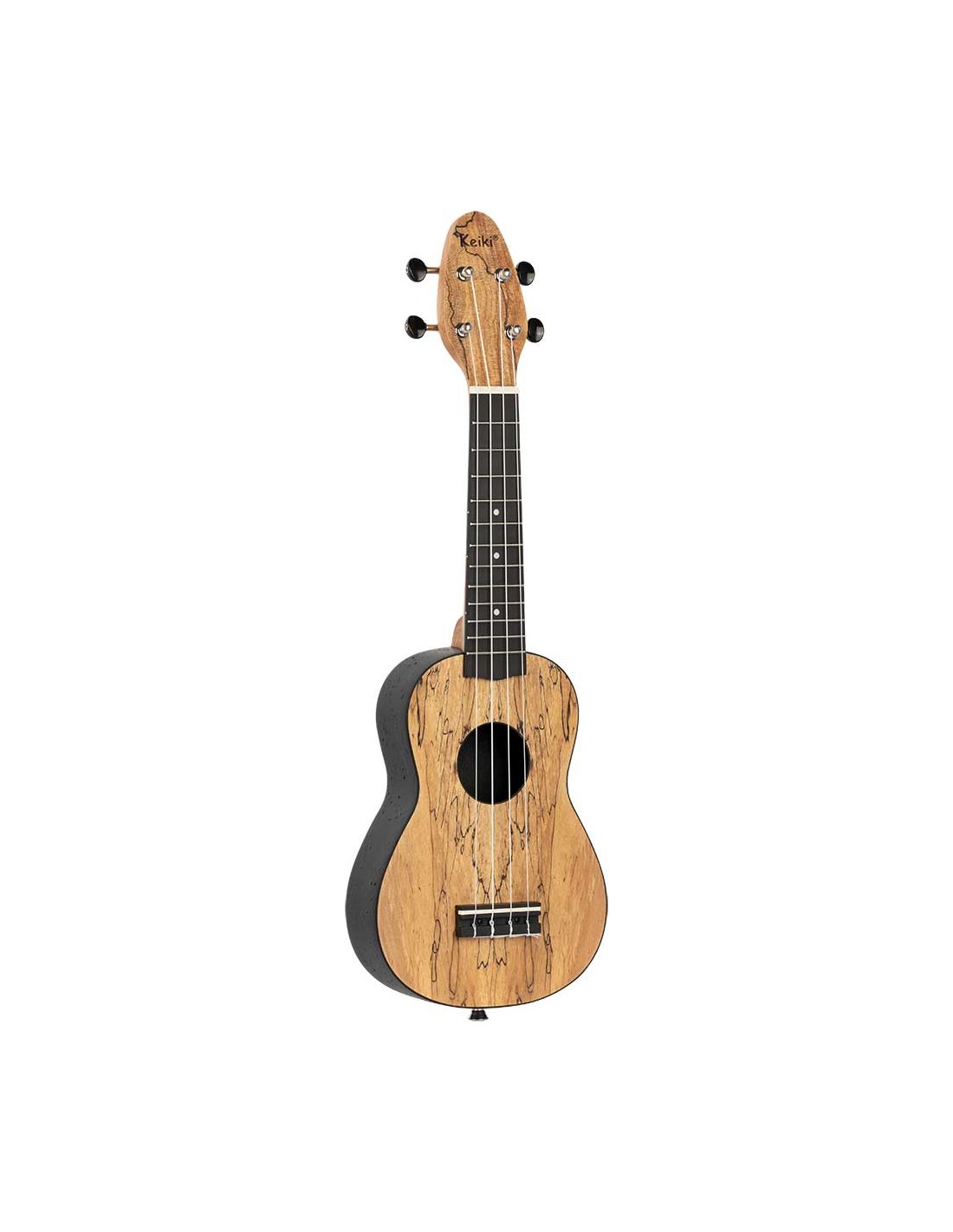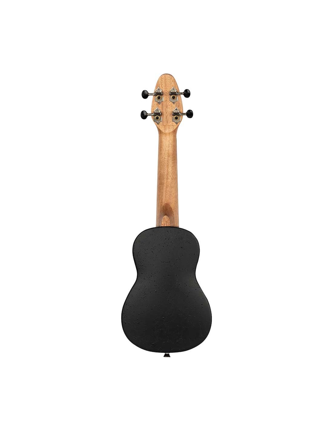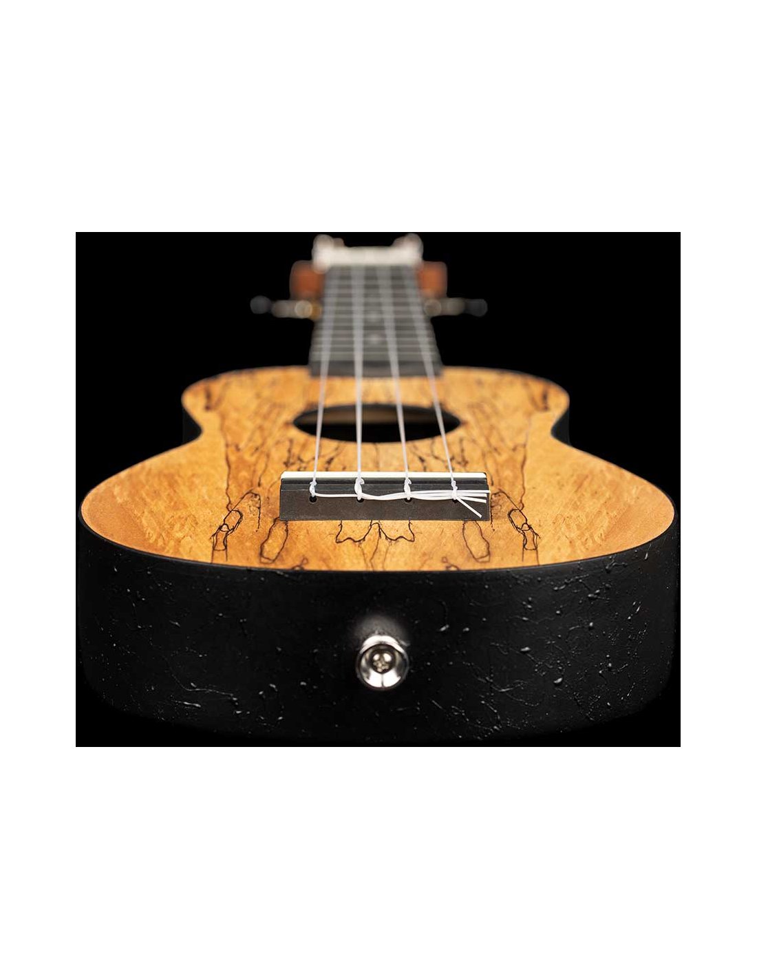 Pack de ukulélé soprano + accordeur + sangle + médiators + sac de transport. Ukulélé avec chevalet, touche et corps courbé en fibre. Table en bois d'érable spalted.