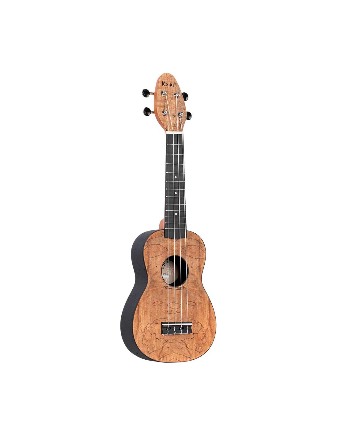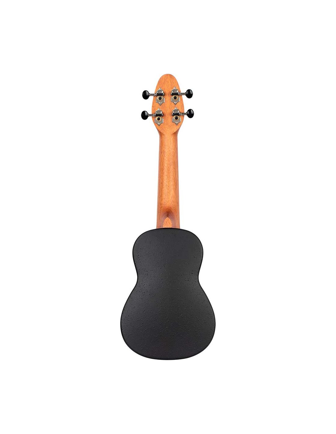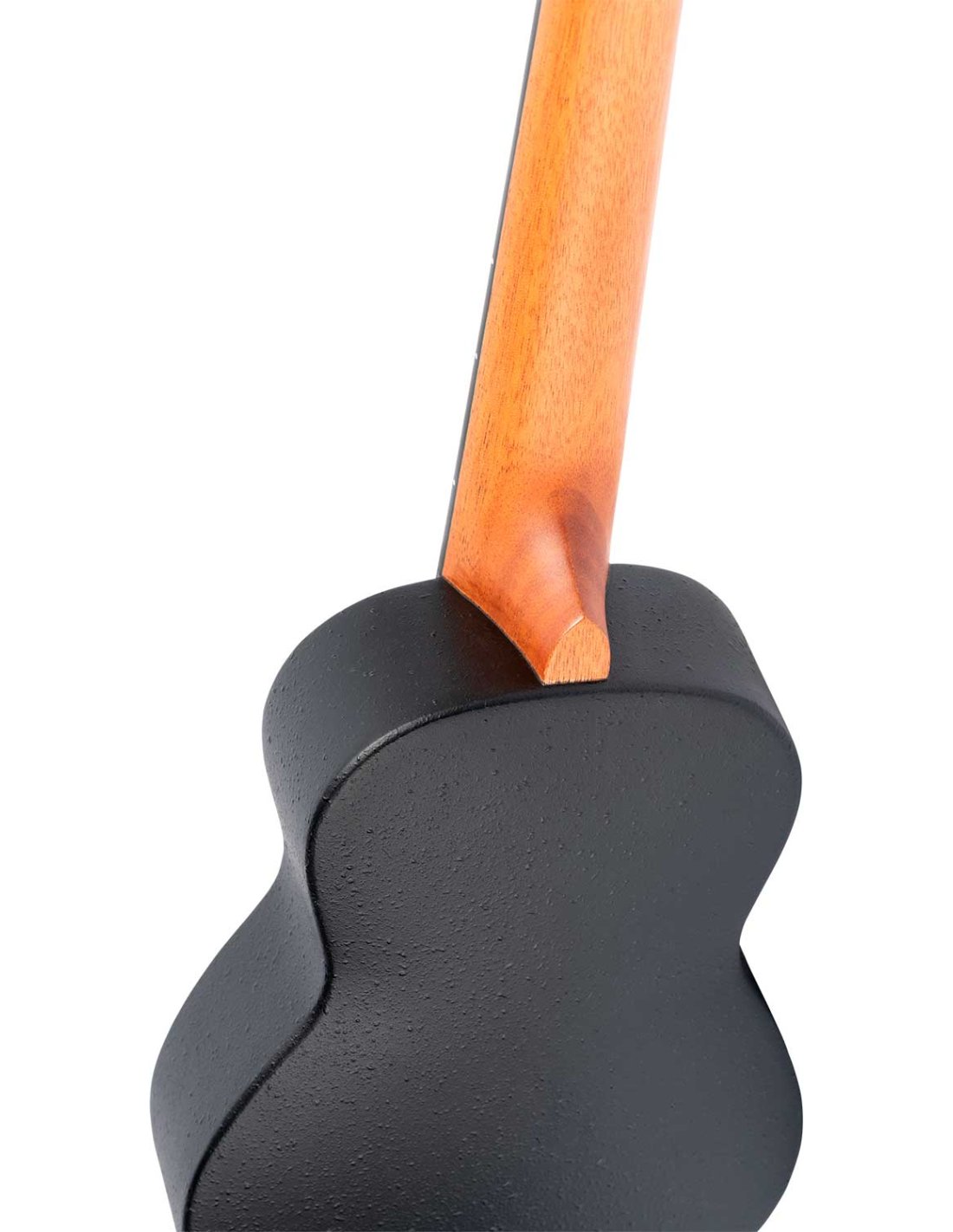 Pack de ukulélé soprano MANCINO + accordeur + sangle + médiators + sac de transport. Ukulélé avec chevalet, touche et corps courbé en fibre. Table en bois d'érable spalted.