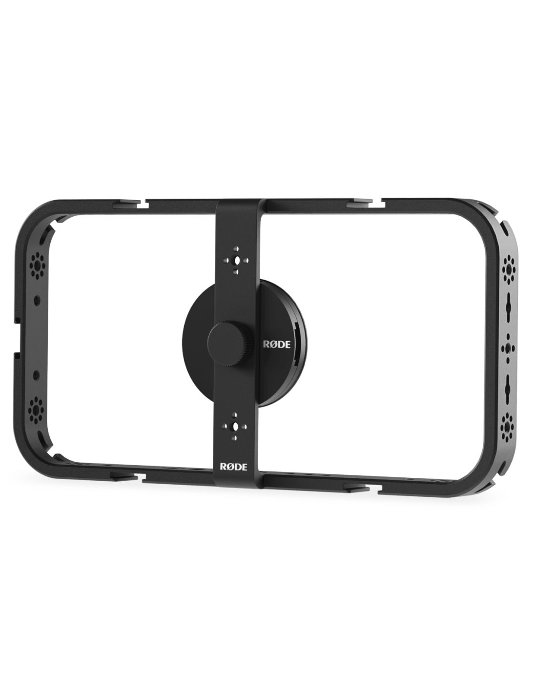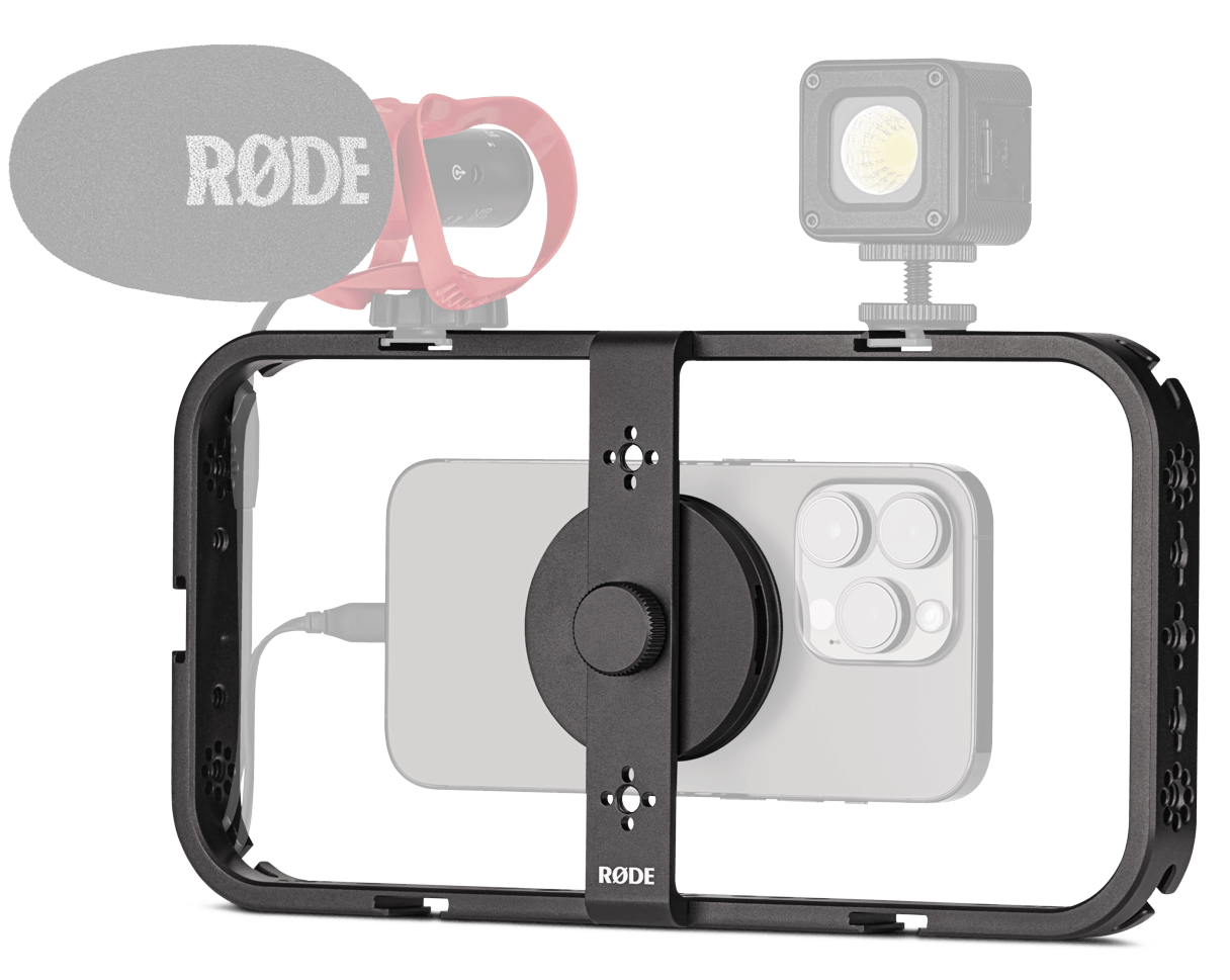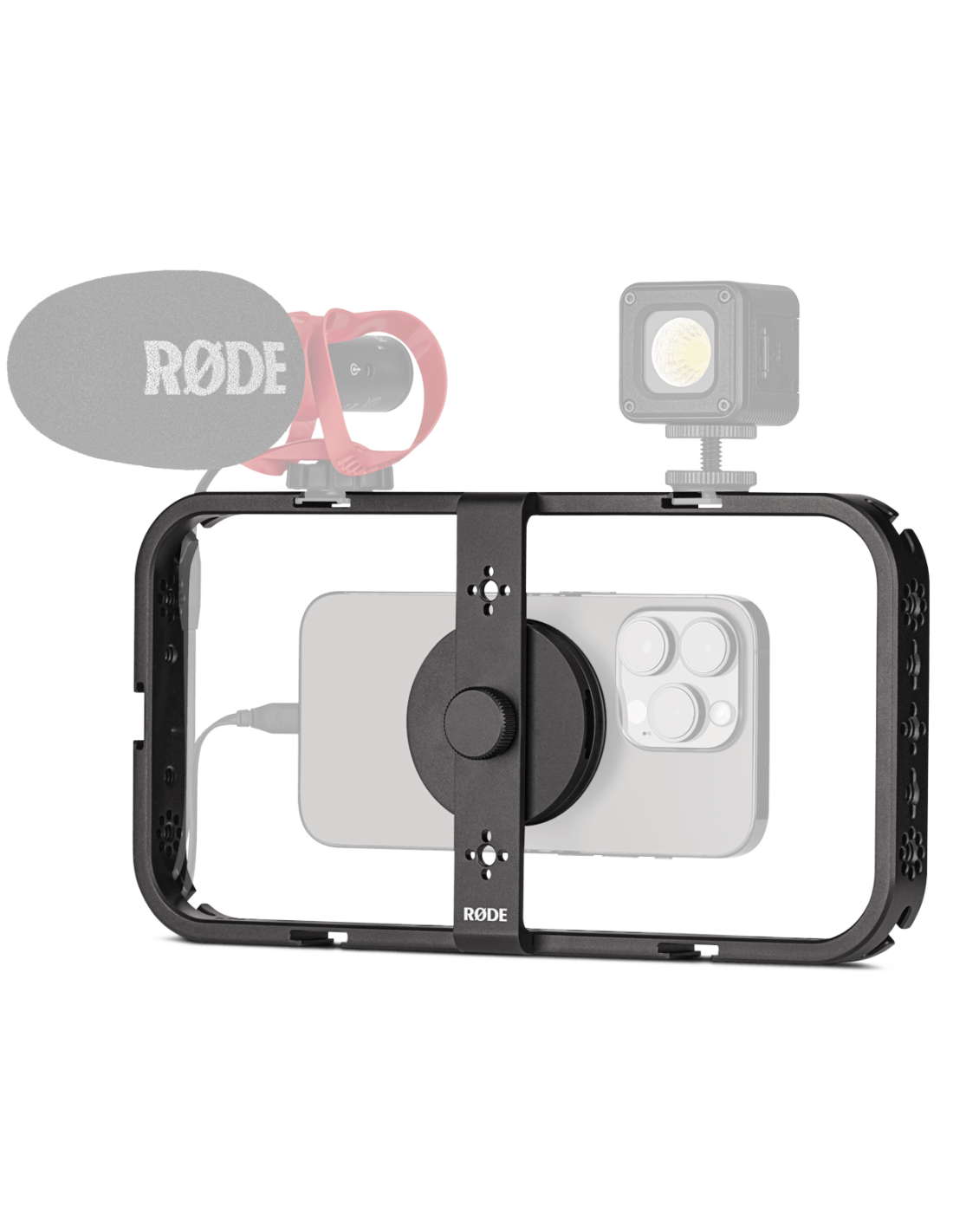 RODE PHONE CAGE è una gabbia magnetica in alluminio per IPhone MagSafe o altri smartphone con custodia compatibile con MagSafe, per riprese video cinematografiche. Le caratteristiche tecniche includono, 4 slot per la gestione dei cavi integrati, 5 supporti a slitta per il fissaggio di microfoni e luci, filettature da 1/4" e 3/8" per l'uso con treppiedi, maniglie e altri accessori, 33 filettature di montaggio totali, supporto per ARRI locking-pin.
