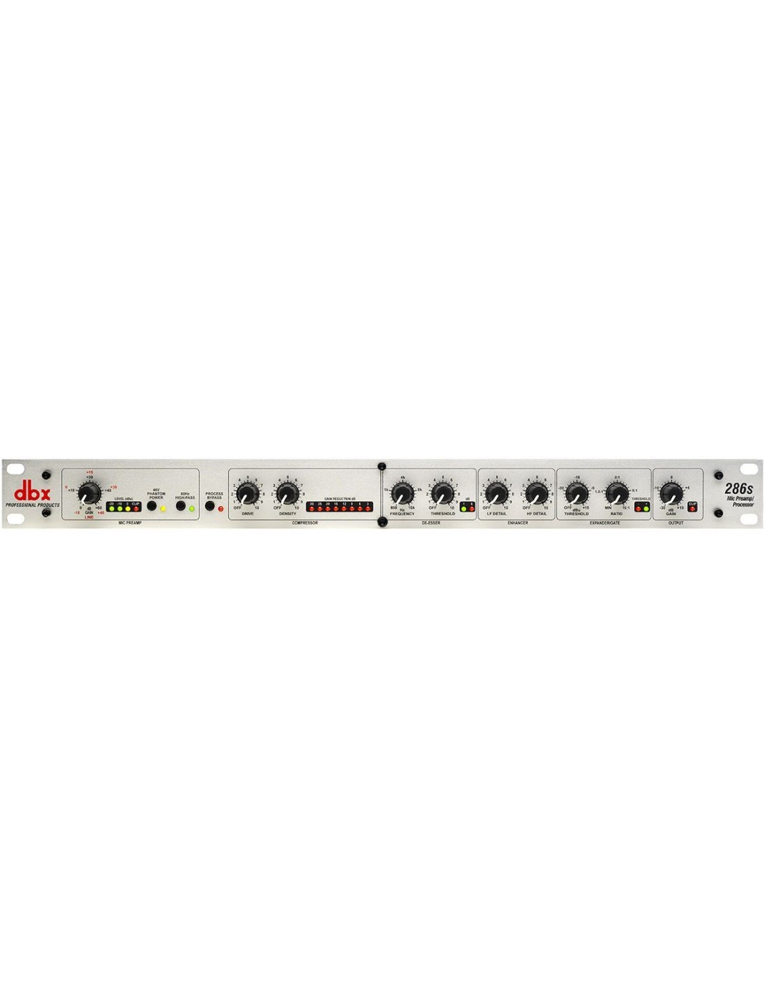 DBX 286S. Processore Channel strip con preamplificatore microfonico monocanale con Input microfonico XLR e strumento TRS e 4 processori di dinamica utilizzabili separatamente o in simultanea. Le caratteristiche tecniche includono preamplificatore microfonico con guadagno regolabile da +0/+60 dB, alimentazione phantom + 48V commutabile, filtro passa-alto da 80Hz e Led meter a 4 segmenti. Tra i 4 processori di dinamica presenti troviamo il compressore brevettato dbx OverEasy®, De-Esser sintonizzabile in frequenza, Enhancer HF Detail e un Expander/Gate adattivo con Led di stato e misurazione.