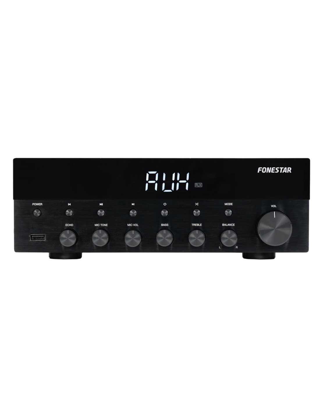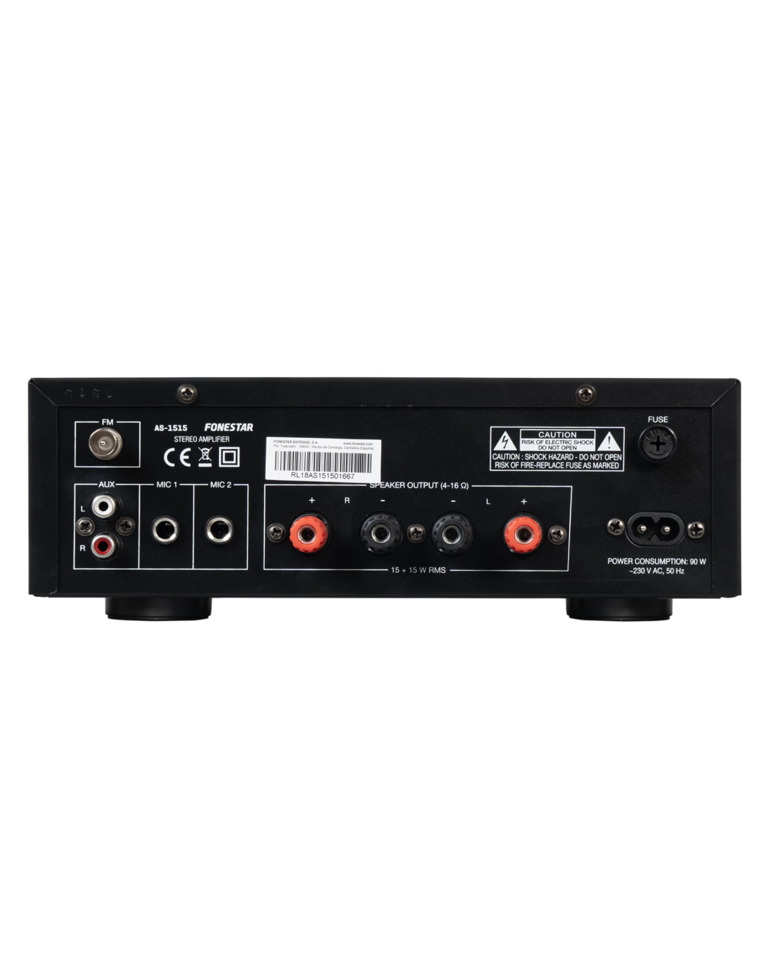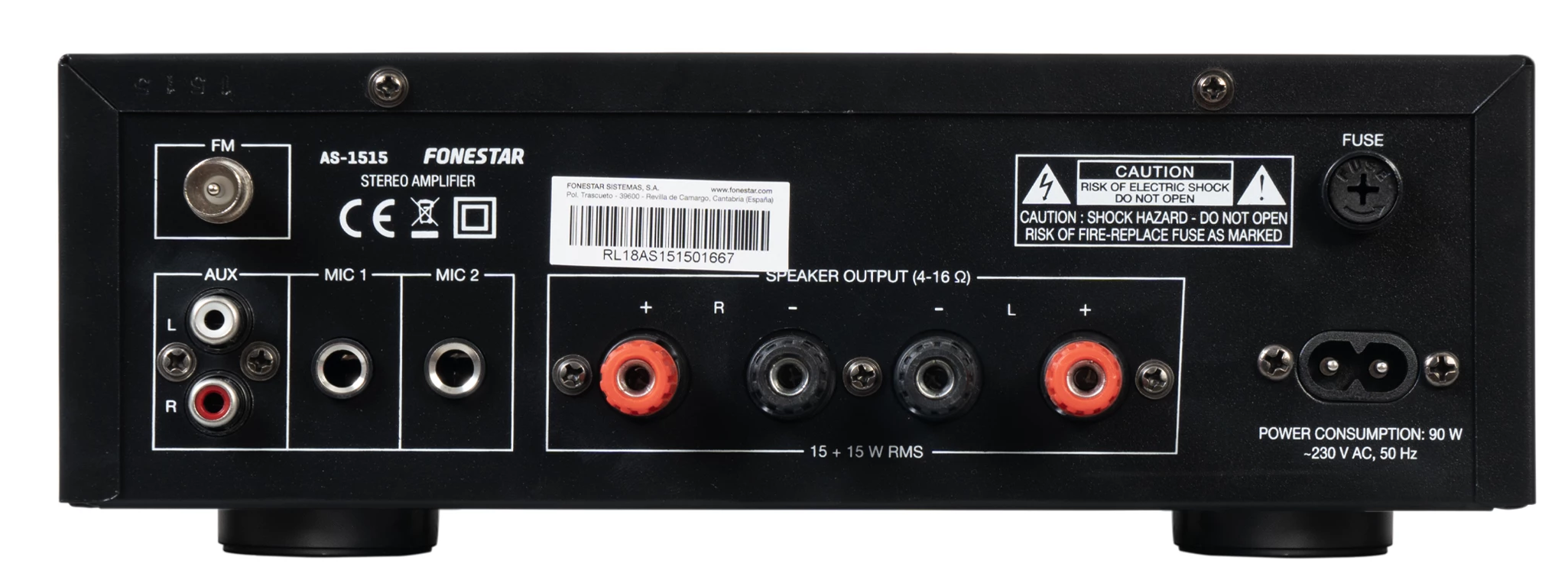 FONESTAR AS-1515 è un amplificatore stereo Hi-Fi da installazione con potenza di 15 + 15 W RMS a 4 Ohm, lettore Bluetooth, USB e radio FM. Le caratteristiche tecniche includono Display LCD di visualizzazione, ricevitore Bluetooth 5.0., lettore USB, Radio FM, comandi per Eq a 2 bande, Balance L/R, Volume Mic, Tono Mic, Echo, ingressi Mic per possibilità di karaoke, 1 aux, 2 x RCA, telecomando per controllo remoto, Output 4-16 Ohm