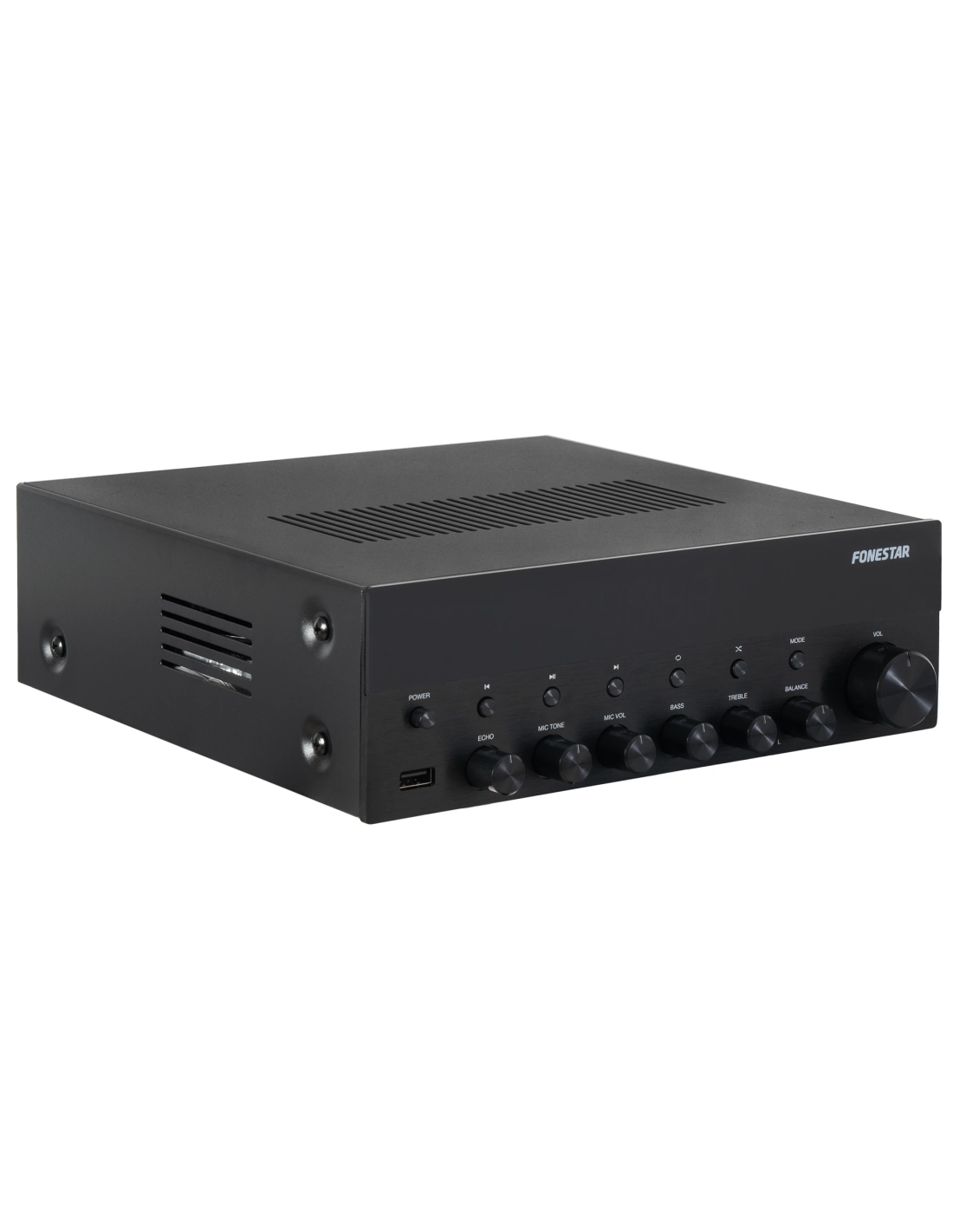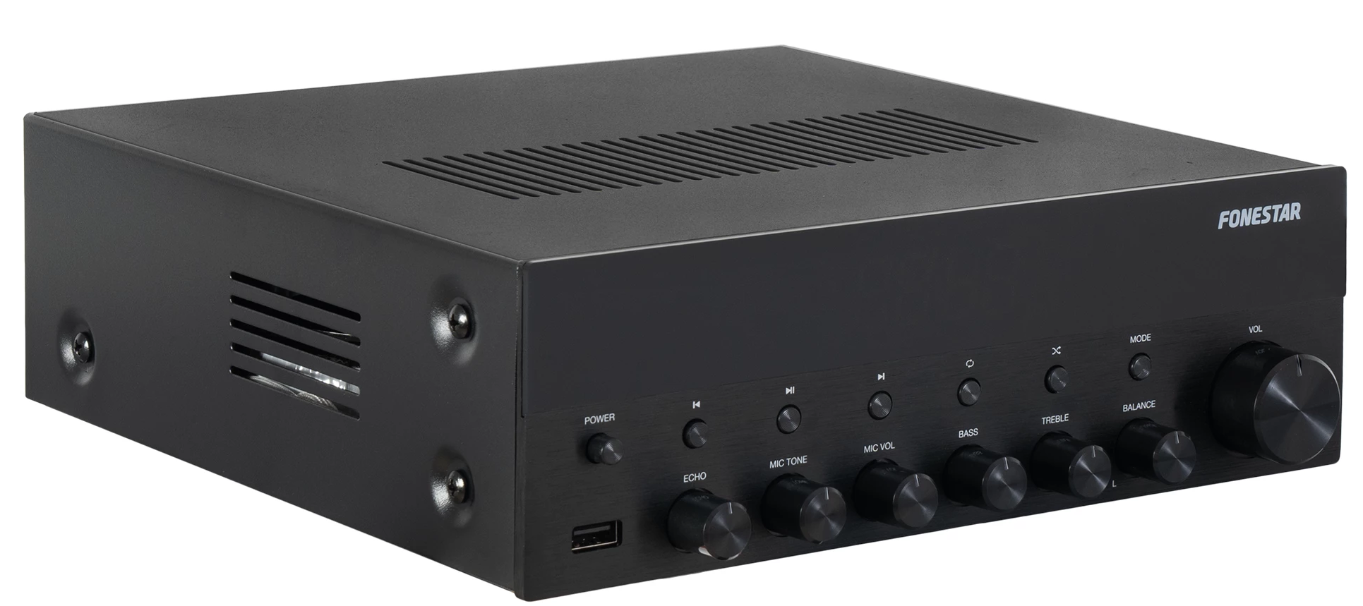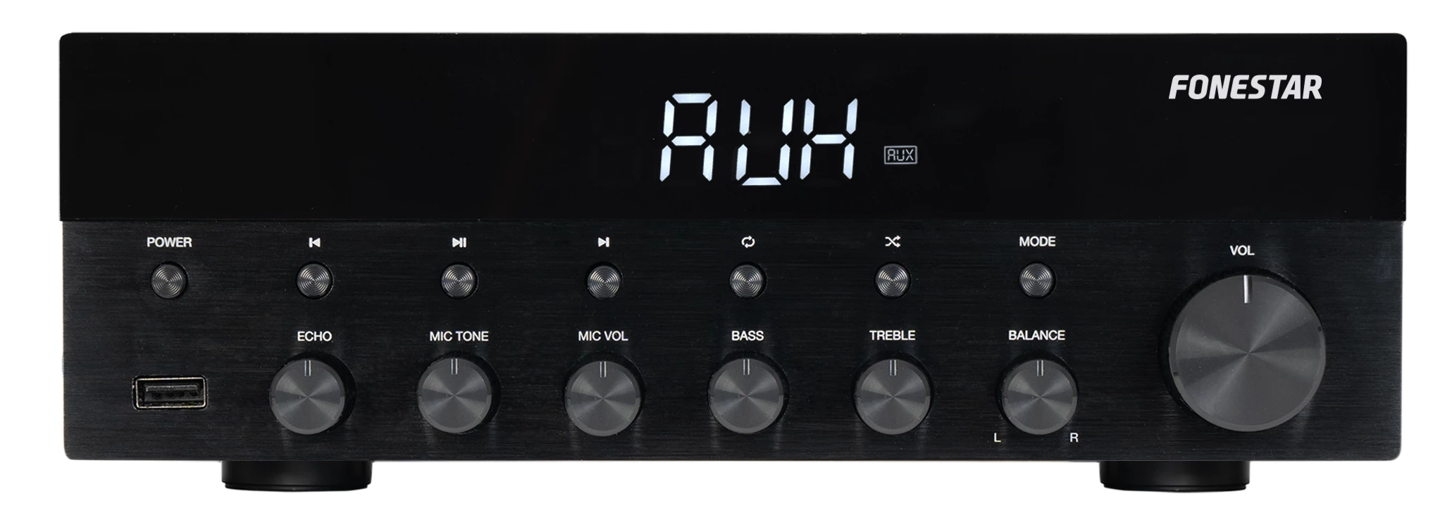 FONESTAR AS-1515 è un amplificatore stereo Hi-Fi da installazione con potenza di 15 + 15 W RMS a 4 Ohm, lettore Bluetooth, USB e radio FM. Le caratteristiche tecniche includono Display LCD di visualizzazione, ricevitore Bluetooth 5.0., lettore USB, Radio FM, comandi per Eq a 2 bande, Balance L/R, Volume Mic, Tono Mic, Echo, ingressi Mic per possibilità di karaoke, 1 aux, 2 x RCA, telecomando per controllo remoto, Output 4-16 Ohm