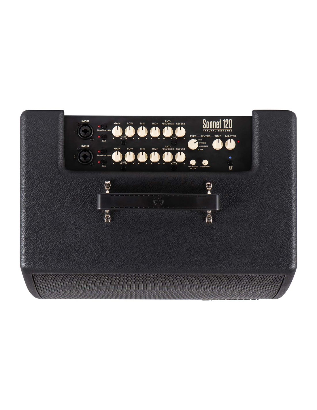 Sonnet 120 Black è il combo prendi-e-vai ideale. Questo amplificatore con finitura in nero, leggero e compatto con una potenza di 120W (1x8”+tweeter) è perfetto per i tuoi concerti acustici. Con ingressi microfono e strumento dotati di EQ e Riverbero indipendenti, effetti qualità studio: Hall e Plate, High Pass Filter, Brilliance Control, USB audio out, XLR DI mix output, MP3/Line in, audio Bluetooth, ingresso footswitch per mute e controllo effetti, e stand posteriore inclinabile.