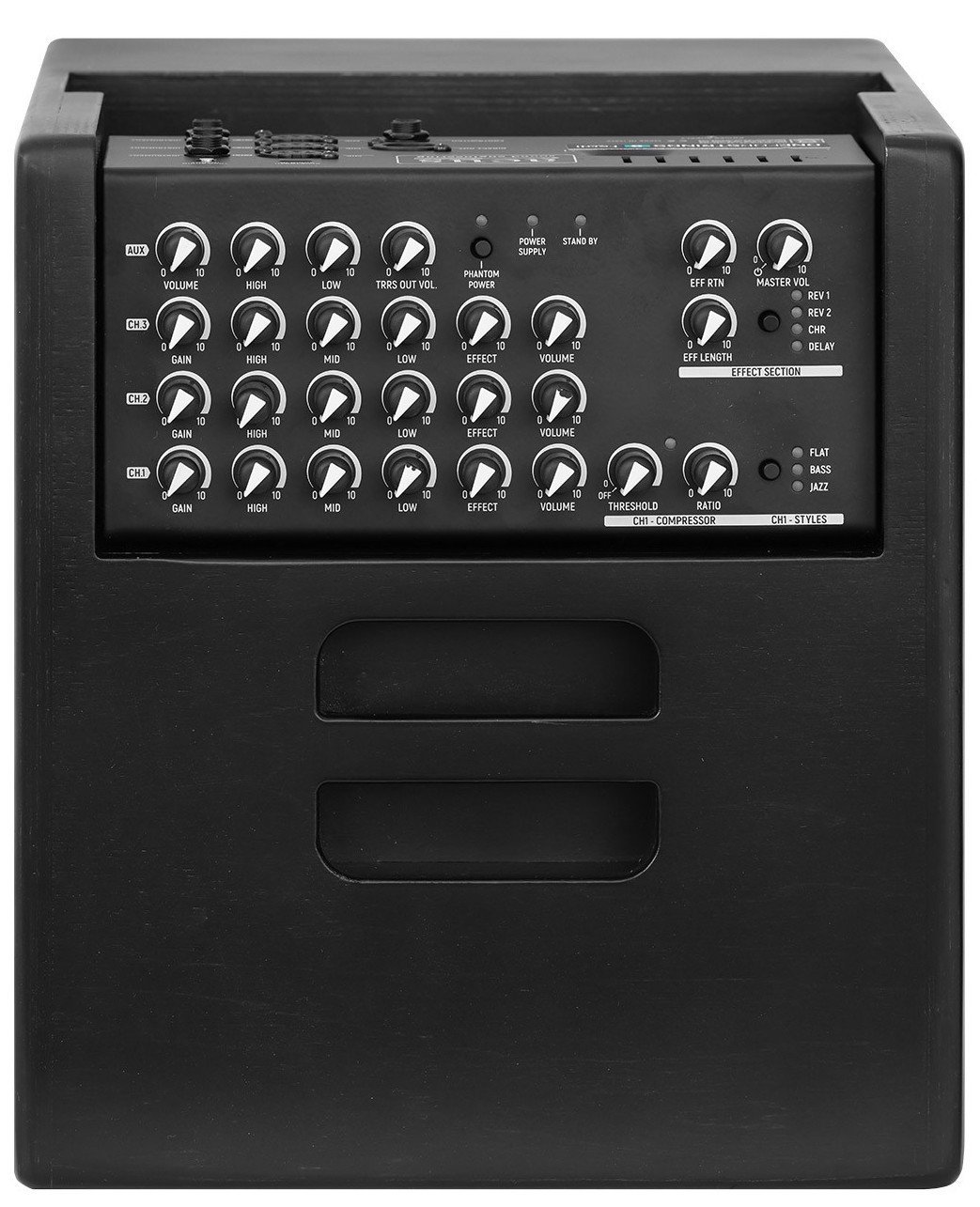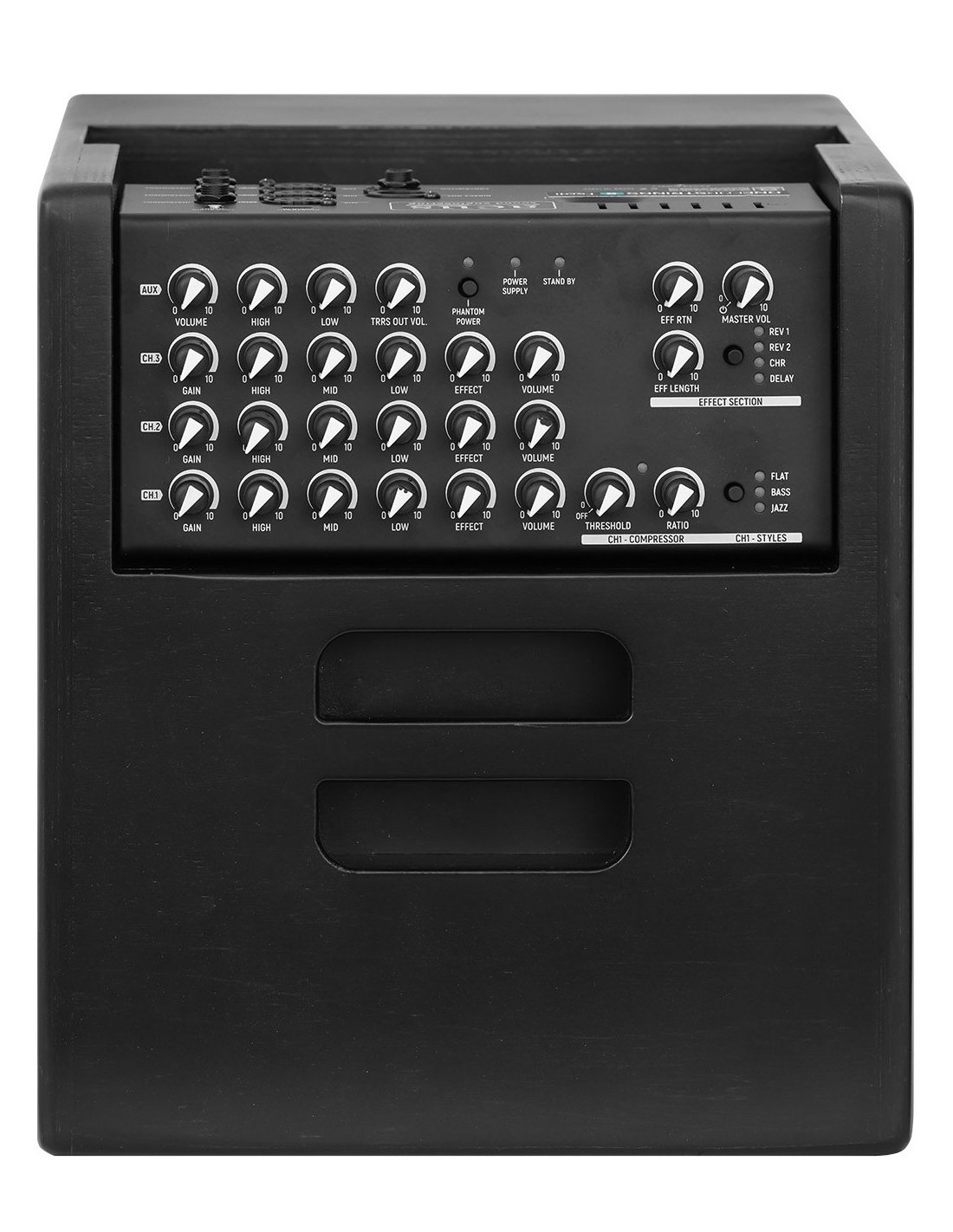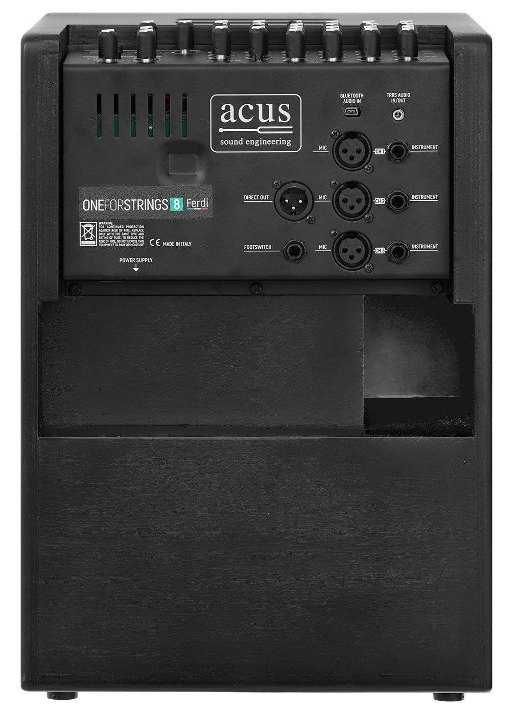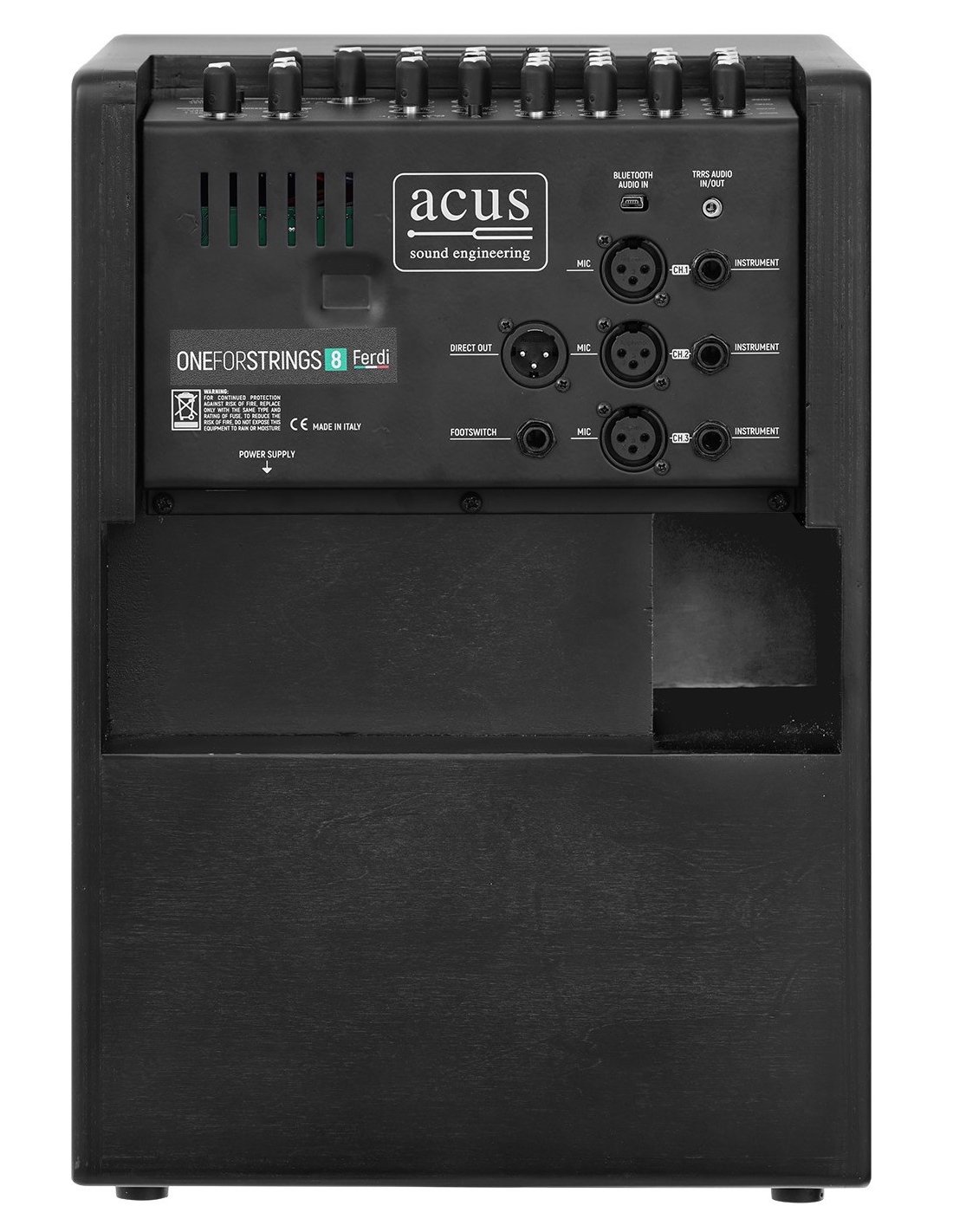 ACUS ONE FOR STRINGS 8 FERDI BLACK è un amplificatore per chitarra acustica e classica con 140W di potenza RMS e 3 canali con sezione Aux. Le caratteristiche tecniche includono, amplificazione a 2 vie tramite woofer da 8" e Tweeter a cupola con driver a compressione da 1", chassis in multistrato con bass reflex, 3 canali Mic/Line su XLR e jack 6,3mm con controlli per Gain, Eq a 3 bande (High, Mid, Low), controllo Volume effetti e Volume master, canale 1 con compressore integrato con controlli Threshold e Ratio e switch per 3 eq preset (Flat, Bass, Jazz), sezione Aux con controlli Volume, Eq a 2 bande High/Low, Volume Stereo Out, switch phantom, sezione Effetti con 3 controlli per Eff Lenght, Eff Return e Master volume e 4 effetti digitali integrati di cui 2 Riverberi, Chorus e Delay