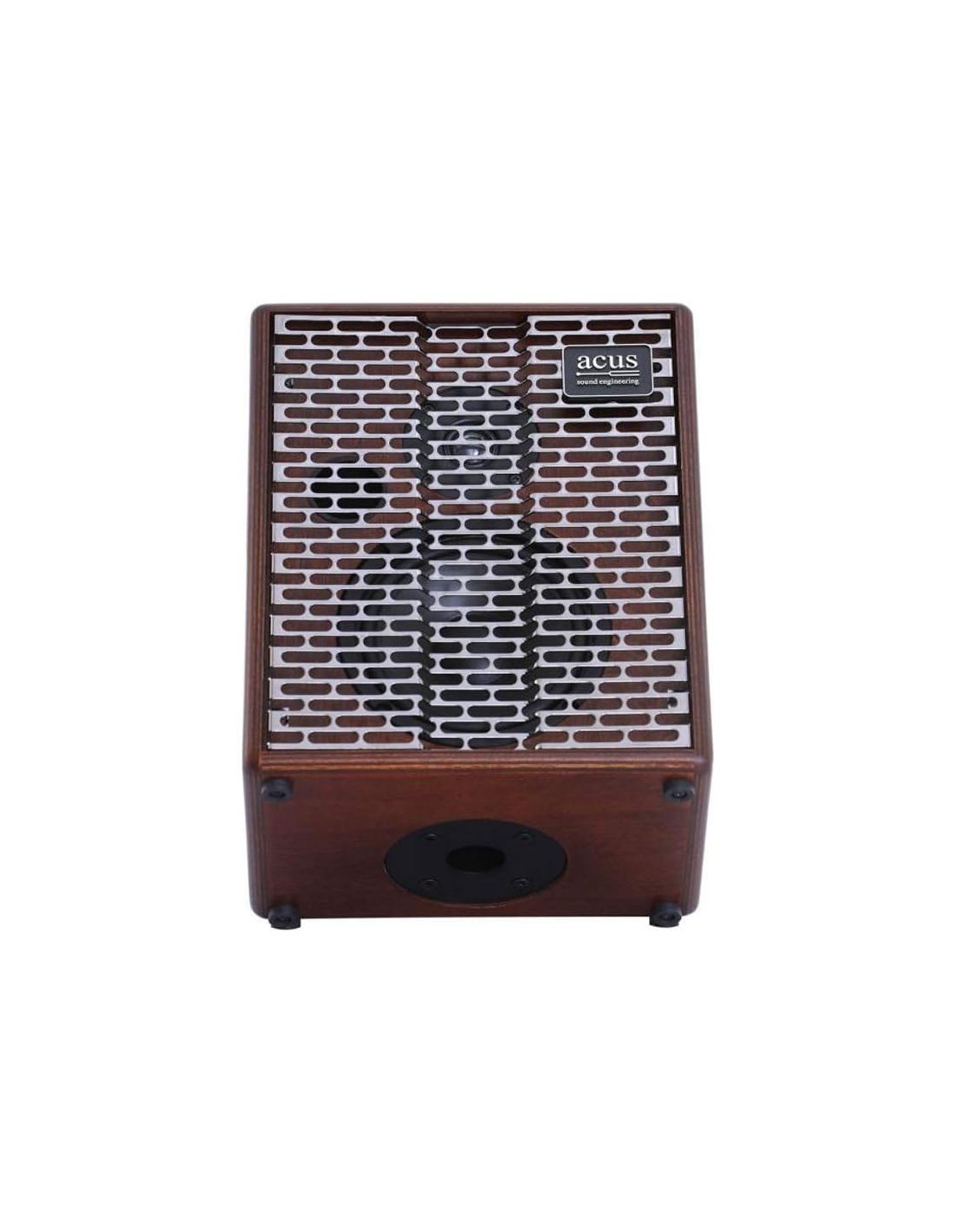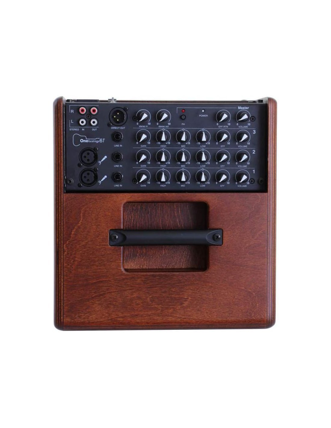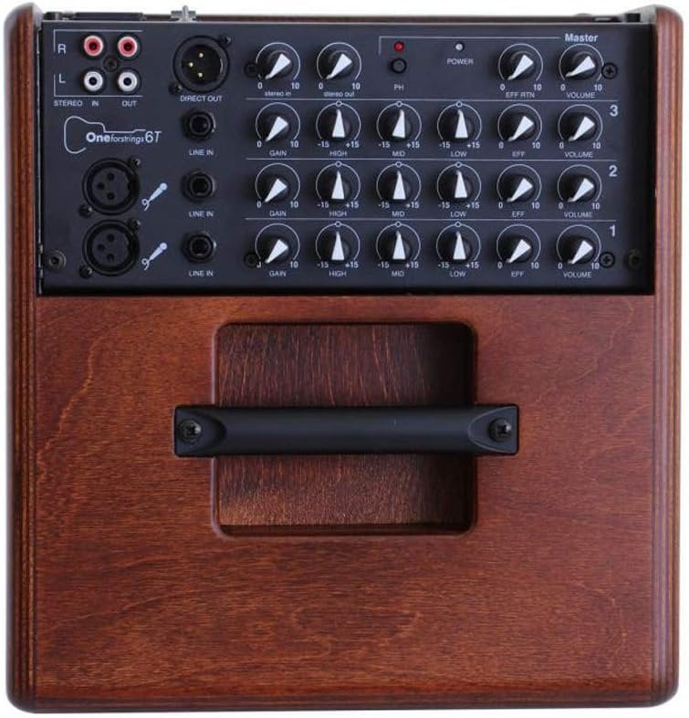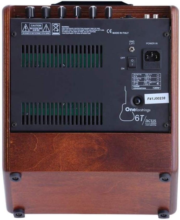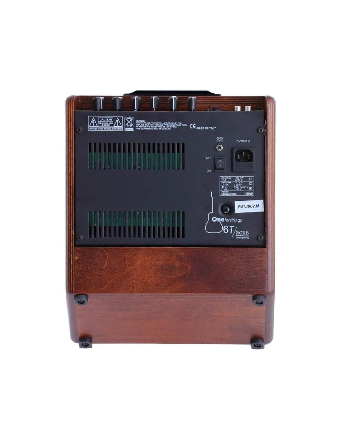 ACUS ONE FOR STRINGS 6T SIMON WOOD è un amplificatore per chitarra acustica e classica con 130W di potenza RMS e 3 canali. Le caratteristiche tecniche includono, amplificazione a 2 vie tramite woofer da 6" e Tweeter con driver a compressione, chassis in multistrato con bass reflex, 3 ingressi di cui 2 Mic/Line su XLR e jack 6,3mm e 1 Line, con controlli per Gain, Eq a 3 bande (High, Mid, Low), controllo Volume effetti e Volume master, sezione Master con controlli Volume Stereo In, Volume stereo Out, switch Phantom, Return effetti e Master volume, Direct Out bilanciata elettronicamente su XLR, ingresso e uscita stereo RCA