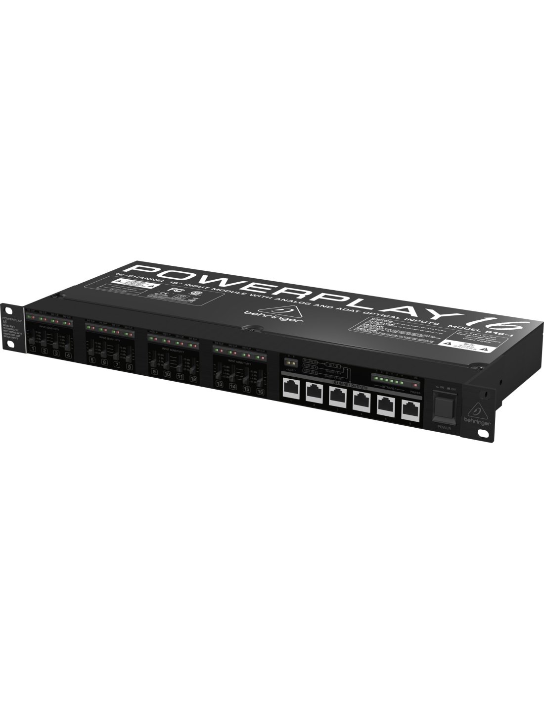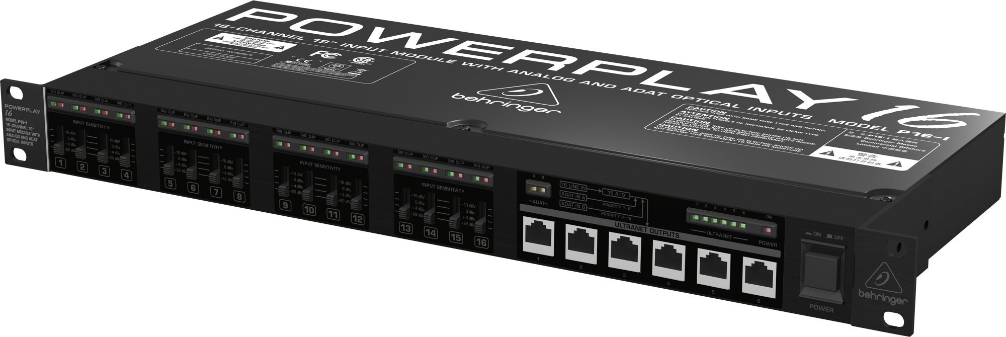 Il Behringer Powerplay P16I è un input module a 16 canali con input analogici e ottici ADAT. Il Behringer Powerplay P16I è provvisto di 16 canali con ingressi TRS bilanciati, convertitori A/D a 24-bit di risoluzione, uno switch per il gain a 4 stadi per ogni canale e supporto digitale per sample rate di 44.1 e 48 kHz.