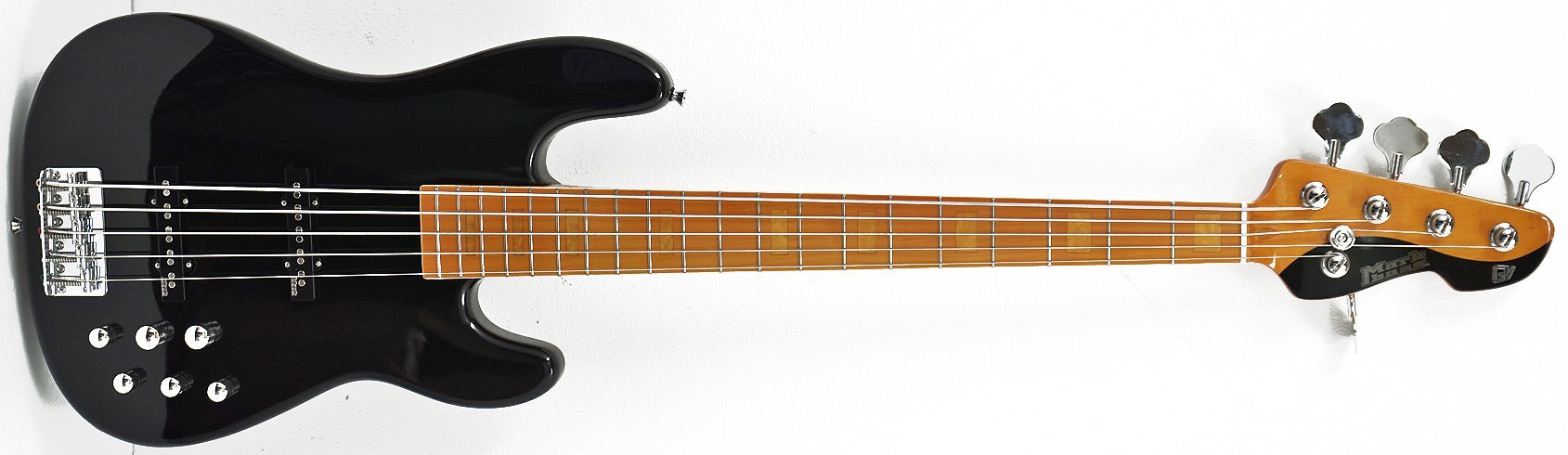 MARK BASS GV 5 GLOXY VALUE BLACK CR MP è un basso elettrico a 5 corde serie GV5 Gloxy con corpo in tiglio formato P-Style, manico monoblocco in acero bolt-on a profilo Comfort C shape, tastiera in acero tostato a raggio 9,5" con 20 tasti Medium, intarsi Blocks, capotasto in osso, hardware cromato, meccaniche Open-Gear e ponte Standard 5 sellette. L'elettronica attiva/passiva consiste in 2 pickup Single-Coil Markbass JJ Style e un Preamp Mark Bass Instrument Pre con controlli 2x Volume, Tono (push pull), Bass, Middle, Treble e switch attivo/passivo.
