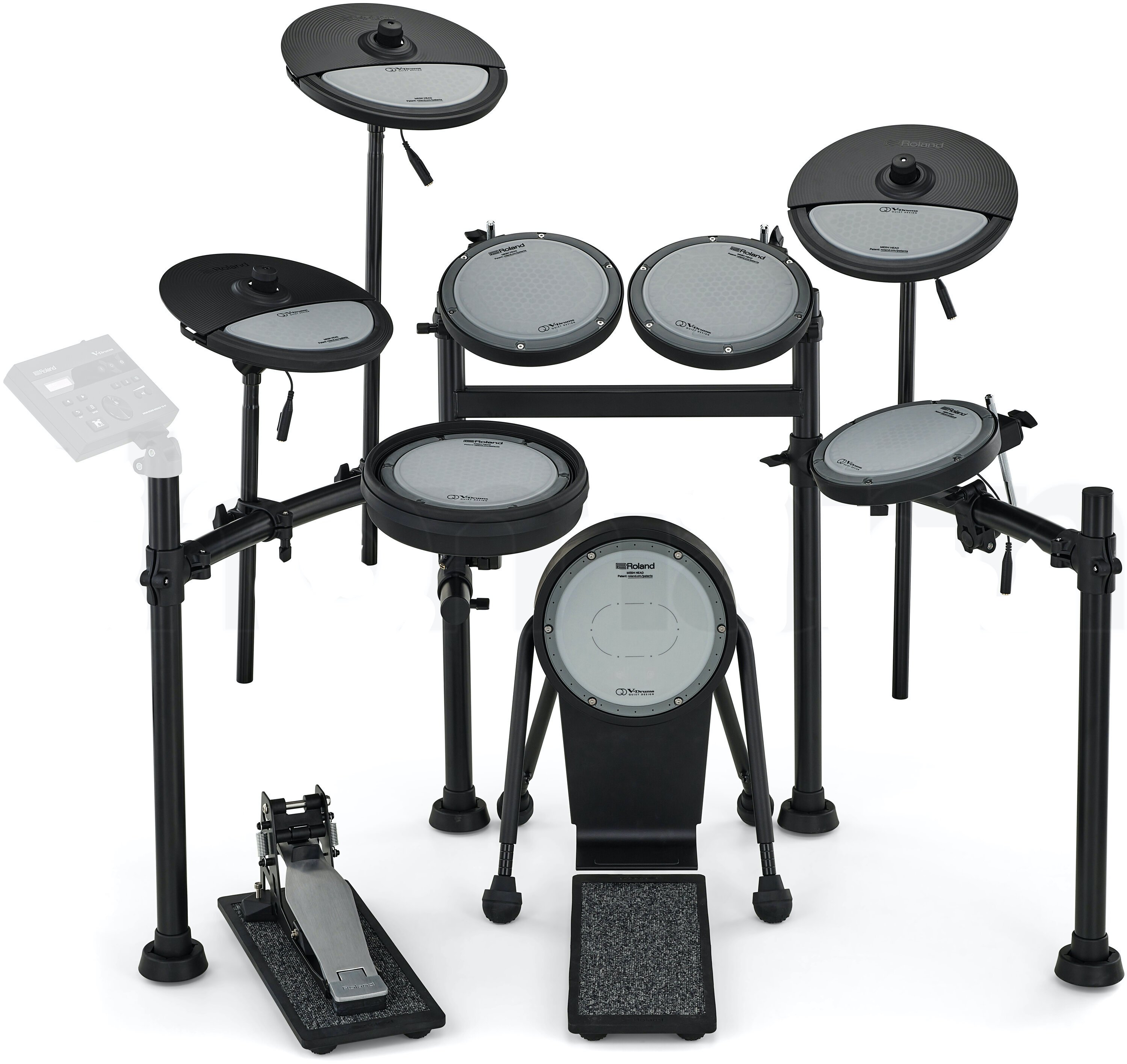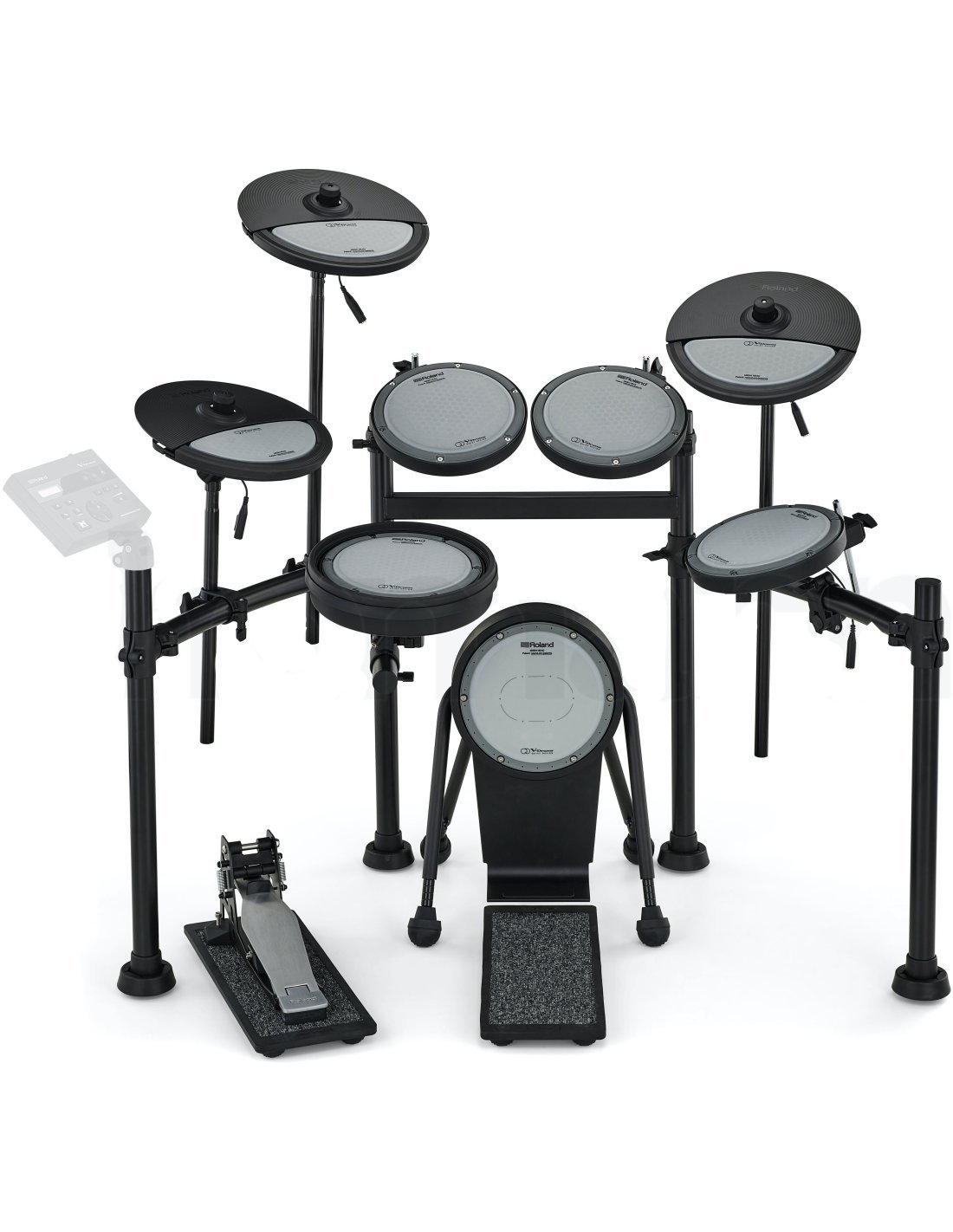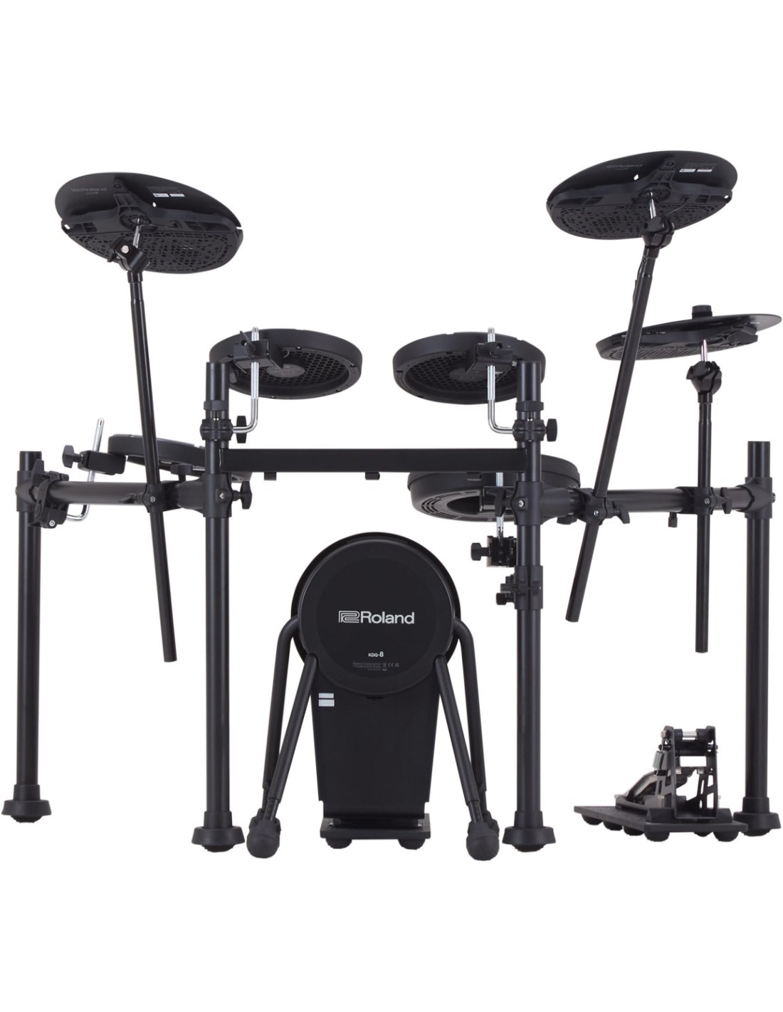 ROLAND VQD106 PAD KIT è un kit di batteria elettronica serie Roland V-Drums senza modulo sonoro e cavi, completa di 5 pezzi, pad hi-hat e set di piatti. Le caratteristiche tecniche includono kick: KDQ-8, rullante: PDQ-8S, Hi-hat: CYQ-12, pedale di controllo hi-hat: FD-9, tom: PDQ-8 x 3 *2, crash: CYQ-12, ride: CYQ-12, base del pedale Kick: NEQ-K, base del pedale hi-hat: NEQ-H, struttura rack a 4 montanti. Non include modulo sonoro e cavi di connessione