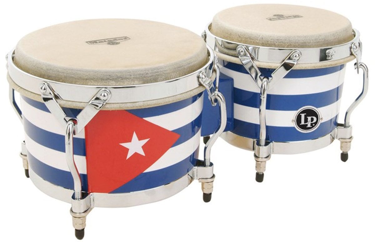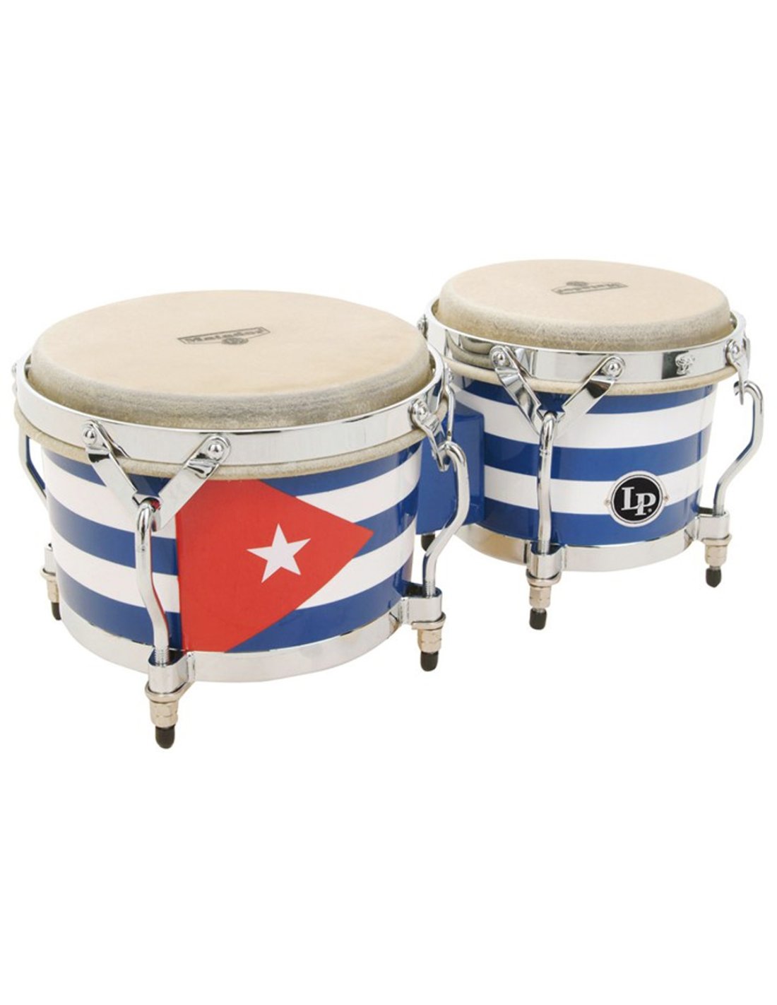 LP M201-QBA. Bongos misure 8 5/8" e 7 1/4" in quercia Siam con pelli naturali Rawhide selezionate, hardware cromati e finitura Cuban Flag.
