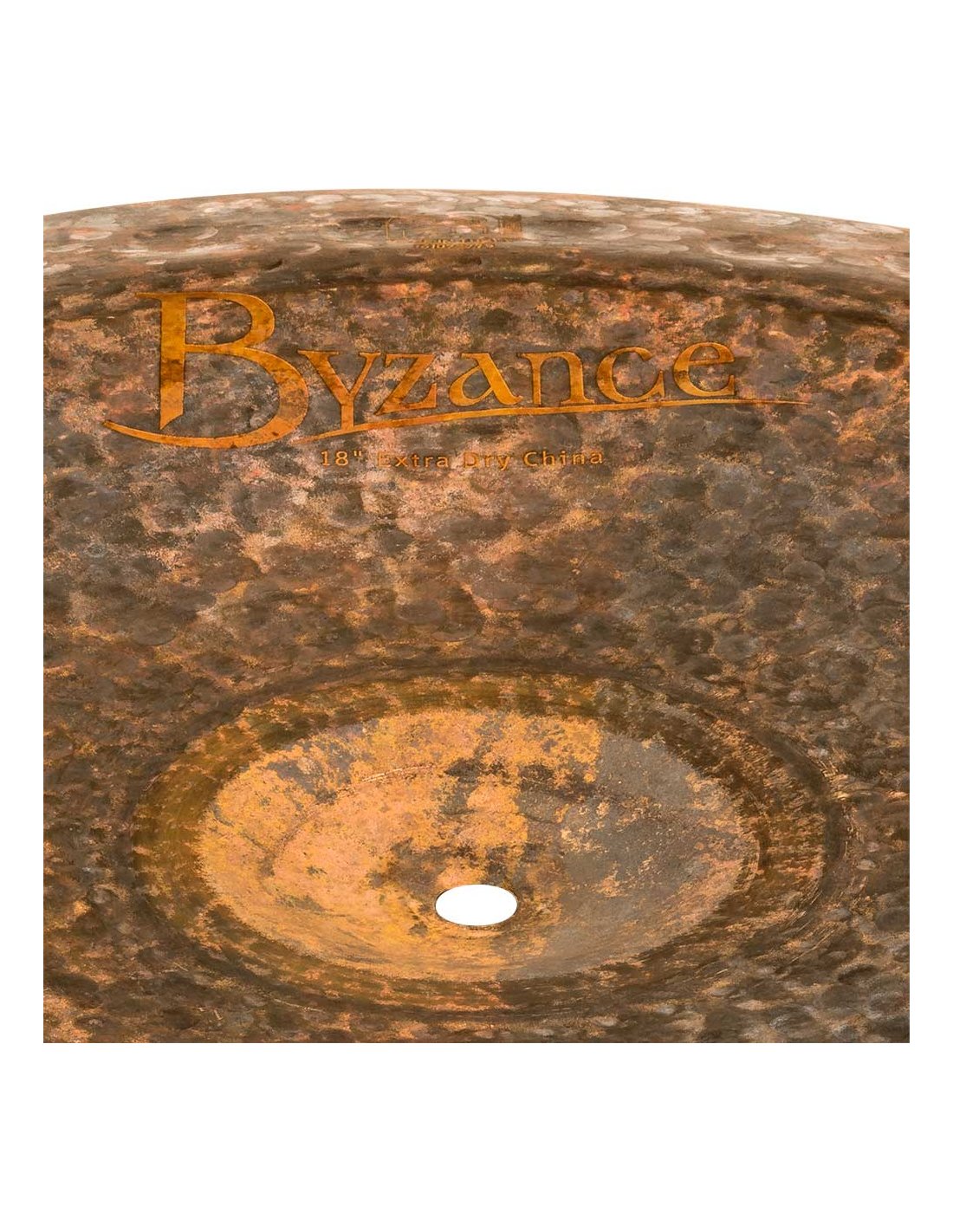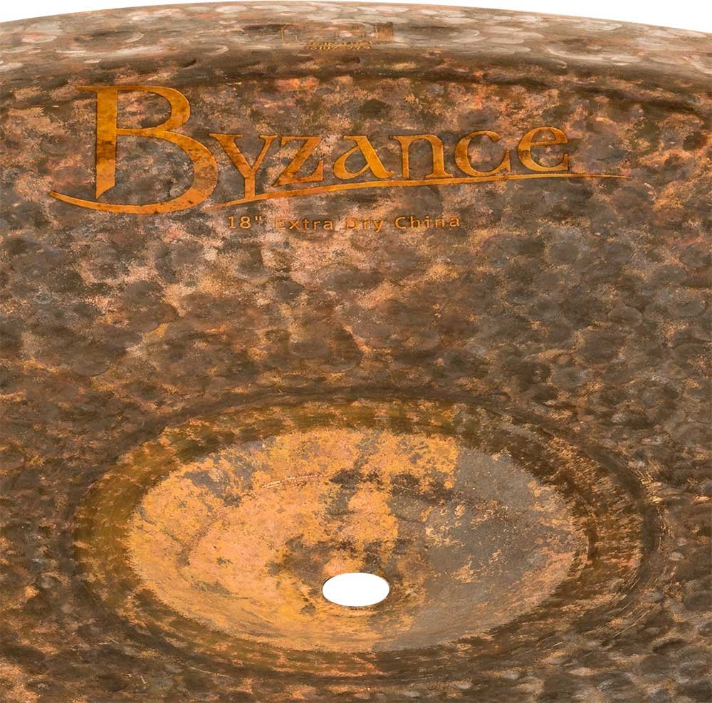 'China 18'', Serie Byzance Extra Dry. I piatti della serie Byzance Extra Dry sono prodotti artigianalmente nella nostra fabbrica in Turchia dalle mani di specialisti e rispettando la tradizione in tutto il processo. Tutti i piatti sono realizzati con dischi in lega di bronzo B20. Diverse tecniche sono coinvolte nel processo, sia la martellatura che la tornitura. La finitura superiore non tornita e la finitura martellata di diametro maggiore insieme al fondo completamente tornito del piatto rendono la serie unica. Con un suono esplosivo, un po' trash e con poco sustain. Questi piatti hanno creato un nuovo universo sonoro completamente unico.