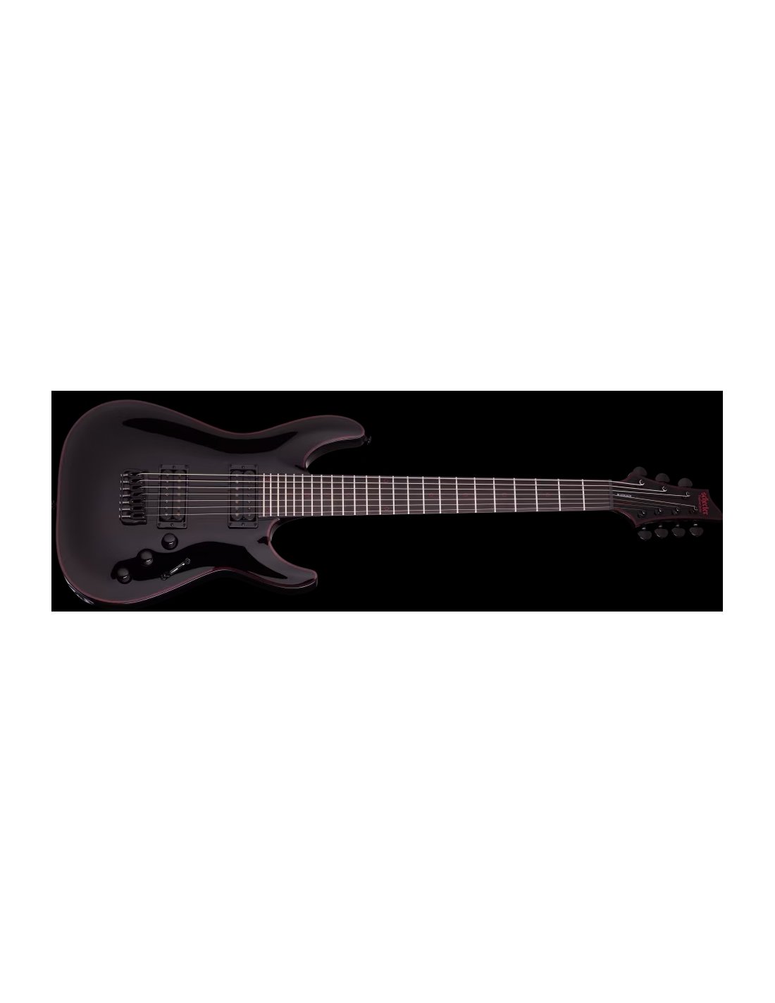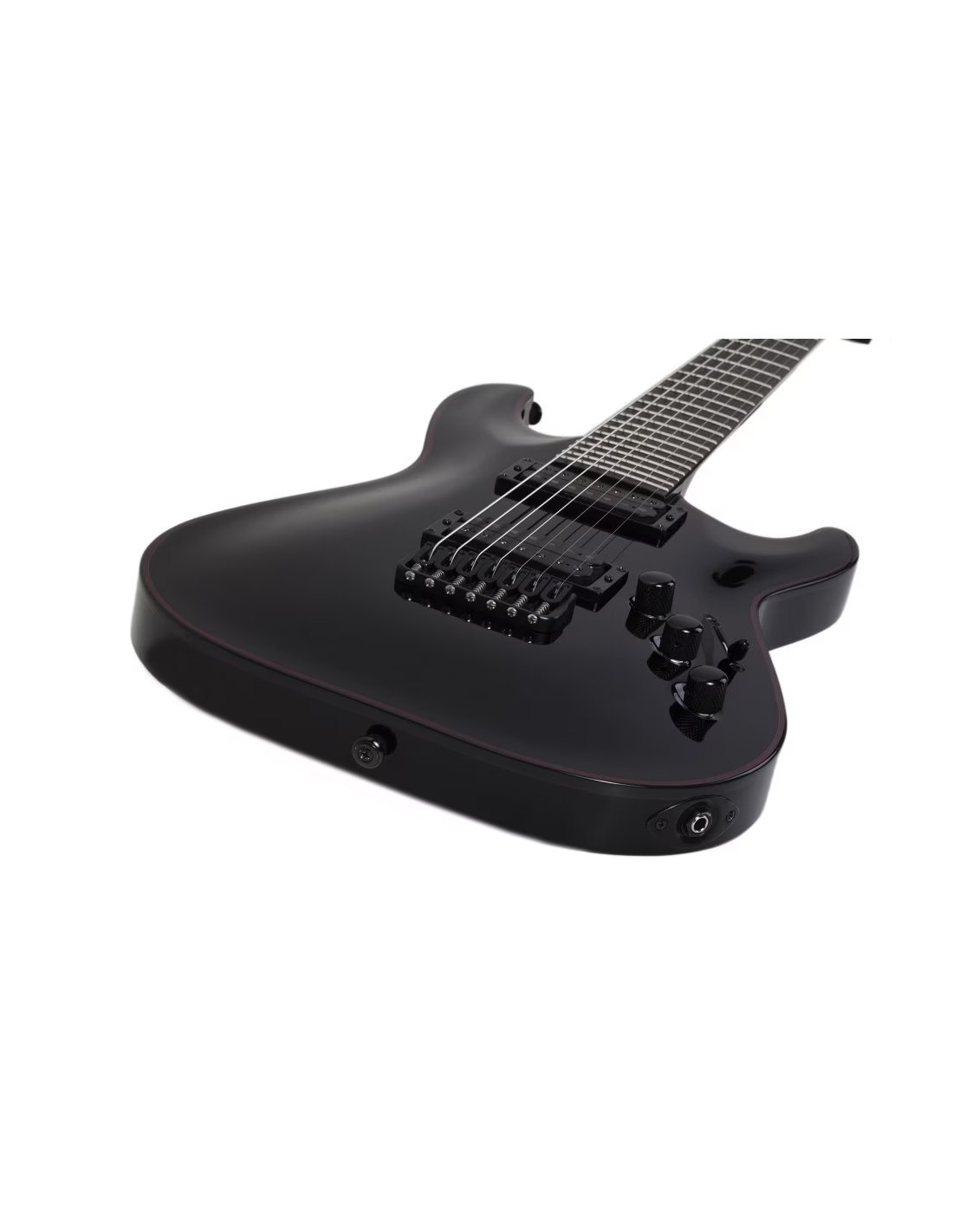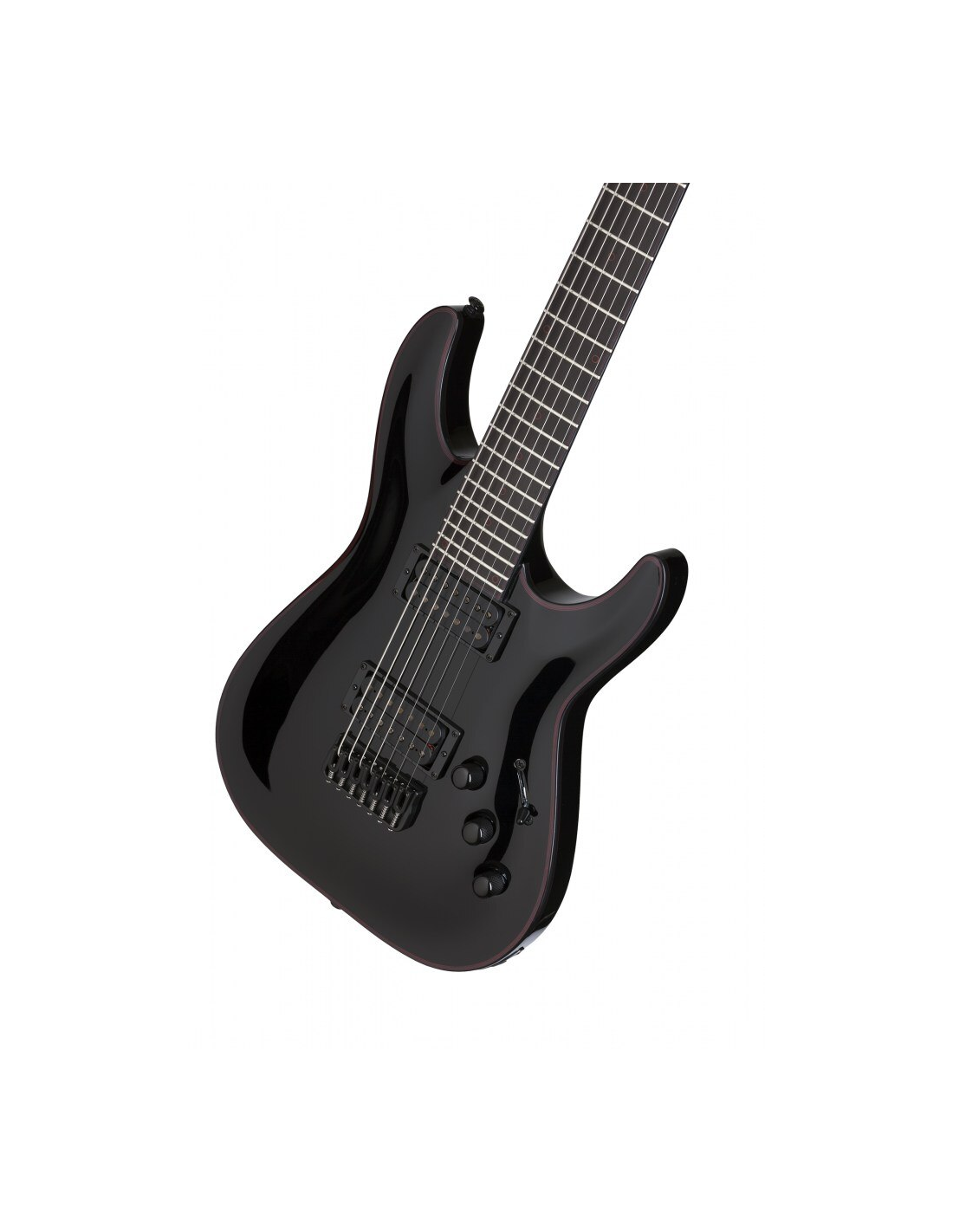 SCHECTER BLACKJACK C-7 BLACK è una chitarra elettrica solid body a 7 corde, modello Schecter C-7 BlackJack, con corpo in Mogano e Top Arched, manico in mogano 3 pezzi con rinforzo in fibra di carbonio e profilo Thin-C, tastiera in Ebano a raggio composito 12"- 16" con 24 tasti X-Jumbo Stainless Steel e intarsi Pearloid Lines, capotasto Graph Tech XL Black Tusq, Trus Rod a doppia azione, hardware Black Chrome, meccaniche Schecter Locking e ponte fisso TonePros TP7 TOM 7-String w/ String Thru Body. L'elettronica a configurazione HH consiste in 2 pickup Humbucker Lundgren M7 al ponte e al manico con 2 controlli Master Volume, Master Tone con push/pull e selettore pickup a 3 vie.