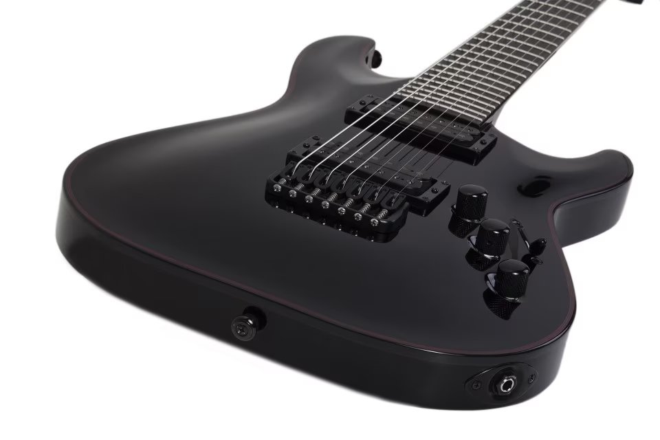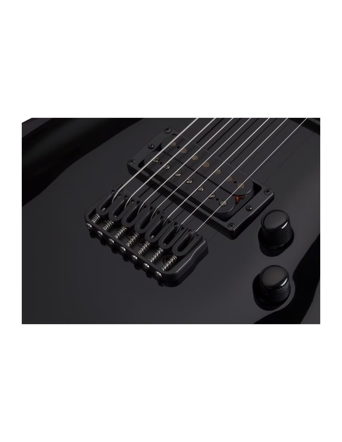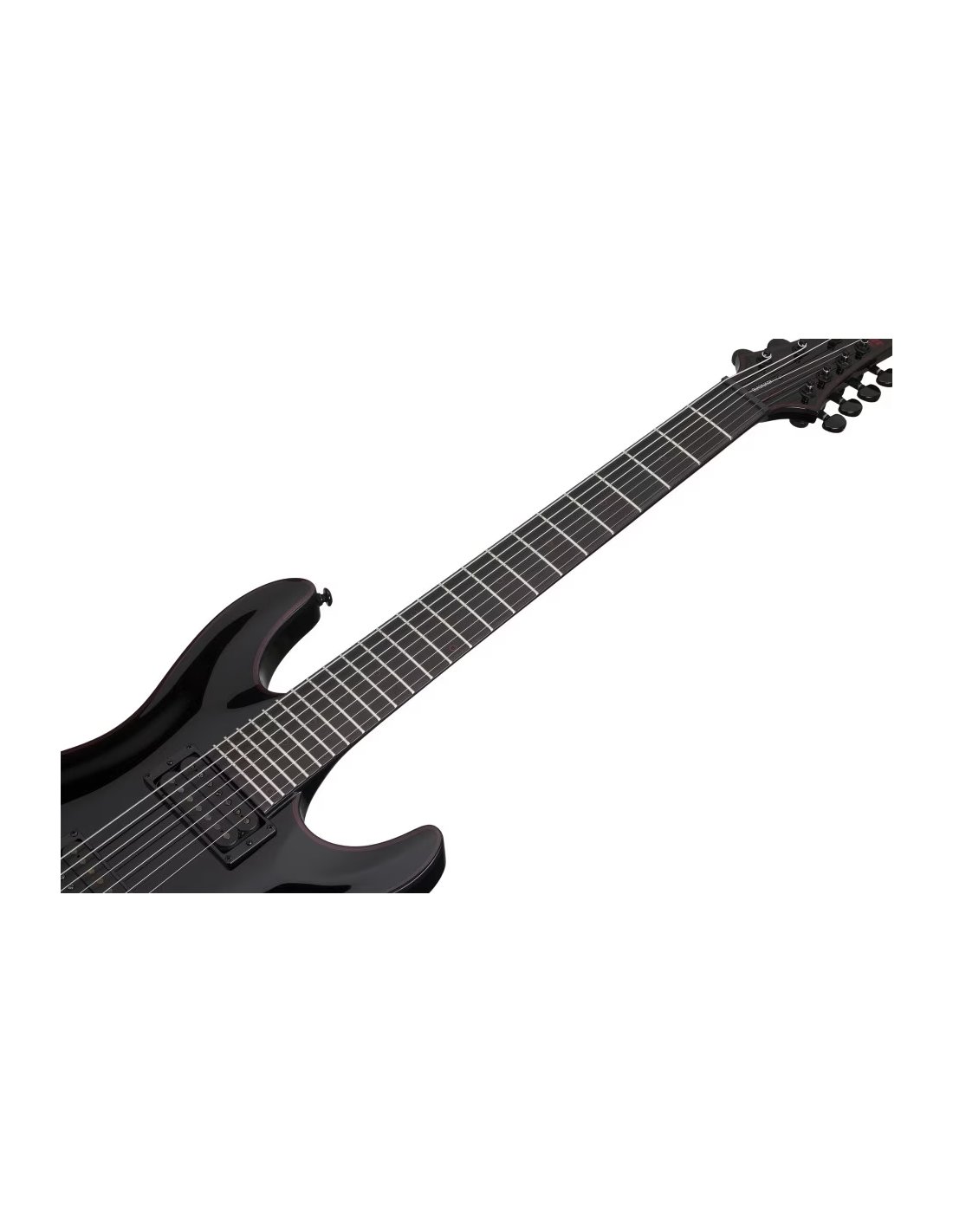 SCHECTER BLACKJACK C-7 BLACK è una chitarra elettrica solid body a 7 corde, modello Schecter C-7 BlackJack, con corpo in Mogano e Top Arched, manico in mogano 3 pezzi con rinforzo in fibra di carbonio e profilo Thin-C, tastiera in Ebano a raggio composito 12"- 16" con 24 tasti X-Jumbo Stainless Steel e intarsi Pearloid Lines, capotasto Graph Tech XL Black Tusq, Trus Rod a doppia azione, hardware Black Chrome, meccaniche Schecter Locking e ponte fisso TonePros TP7 TOM 7-String w/ String Thru Body. L'elettronica a configurazione HH consiste in 2 pickup Humbucker Lundgren M7 al ponte e al manico con 2 controlli Master Volume, Master Tone con push/pull e selettore pickup a 3 vie.