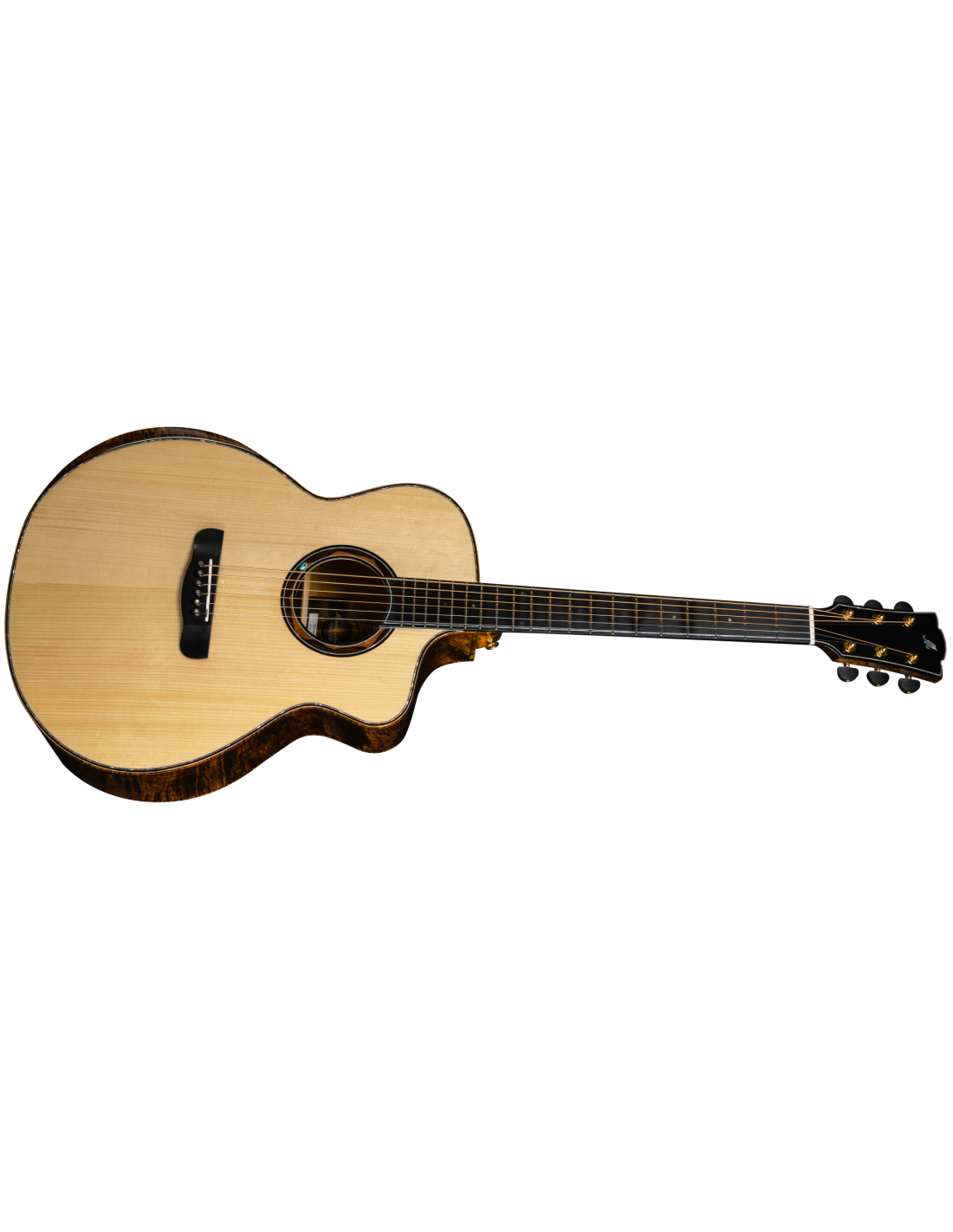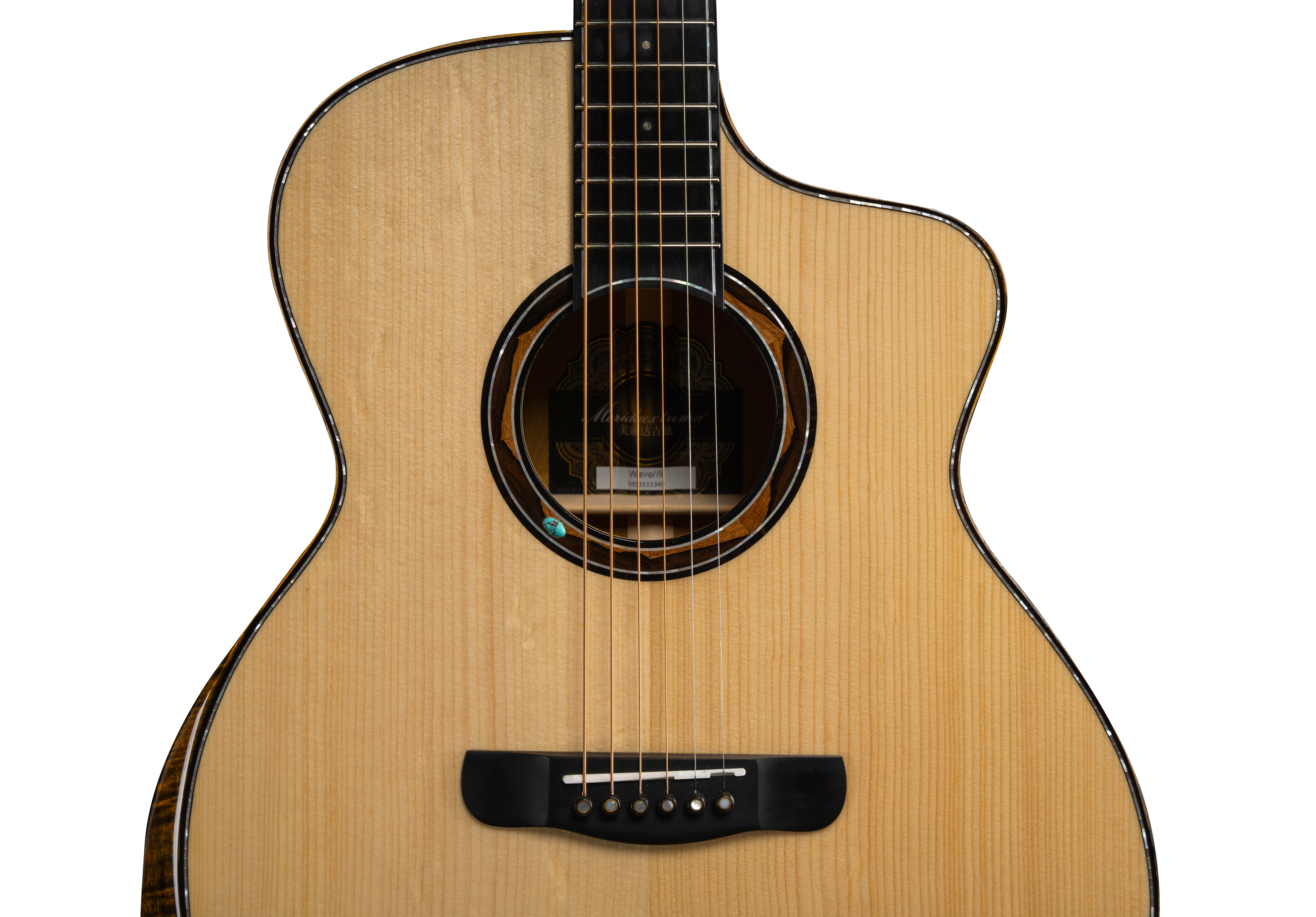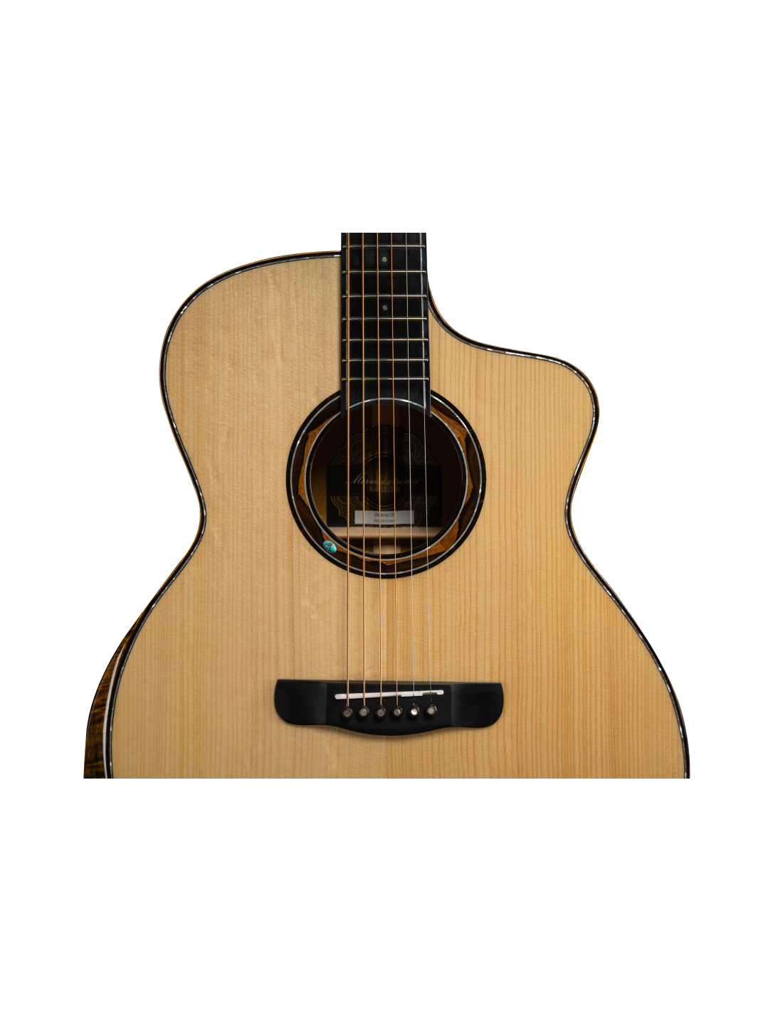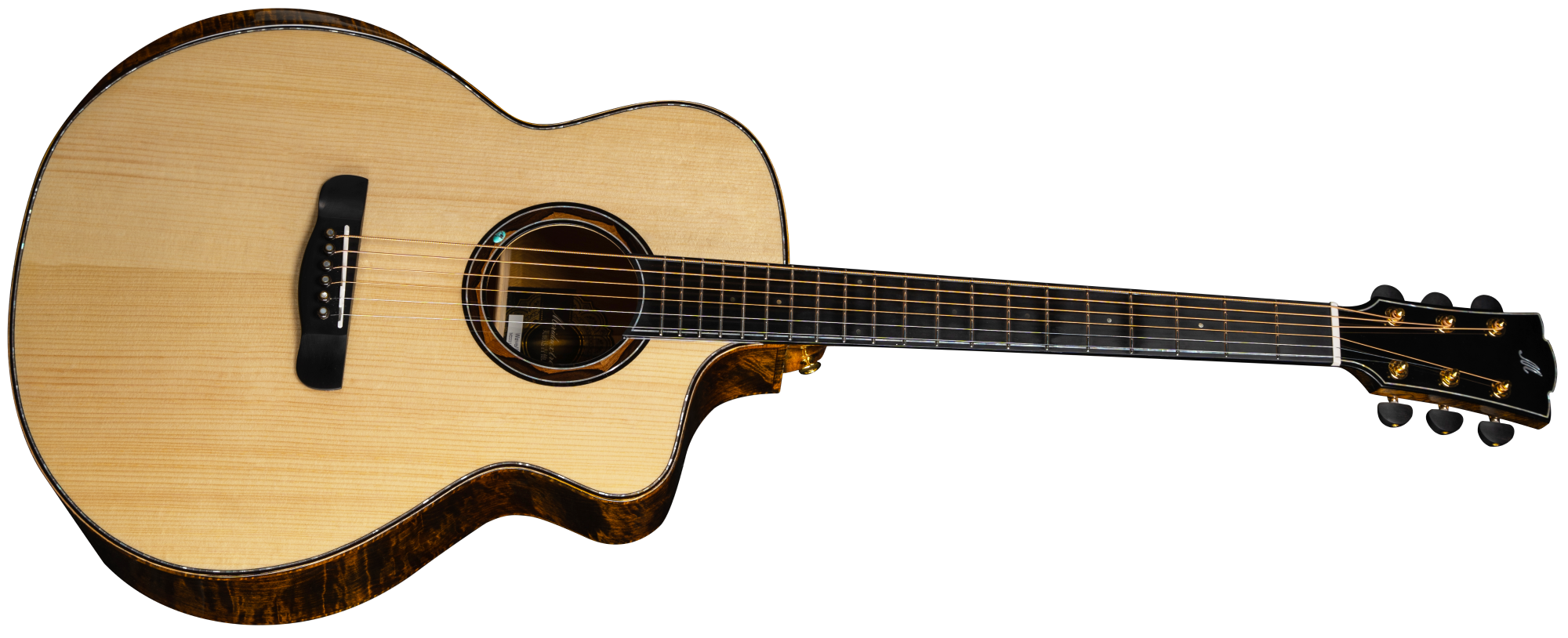 MERIDA WAVE-EH è una chitarra acustica formato Grand Concert a spalla mancante, con top in abete massello europeo a finitura gloss, fondo e fasce in Gold Nanmu massello, manico in acero fiammato con tastiera in Omega laminato, capotasto da 43mm in osso, corde Exp16 premontate, meccaniche dorate con pin in ebano.