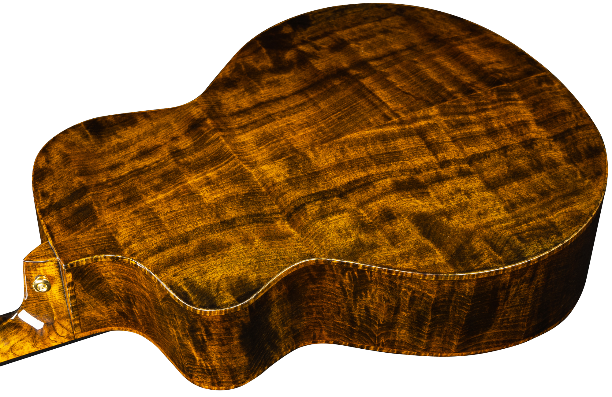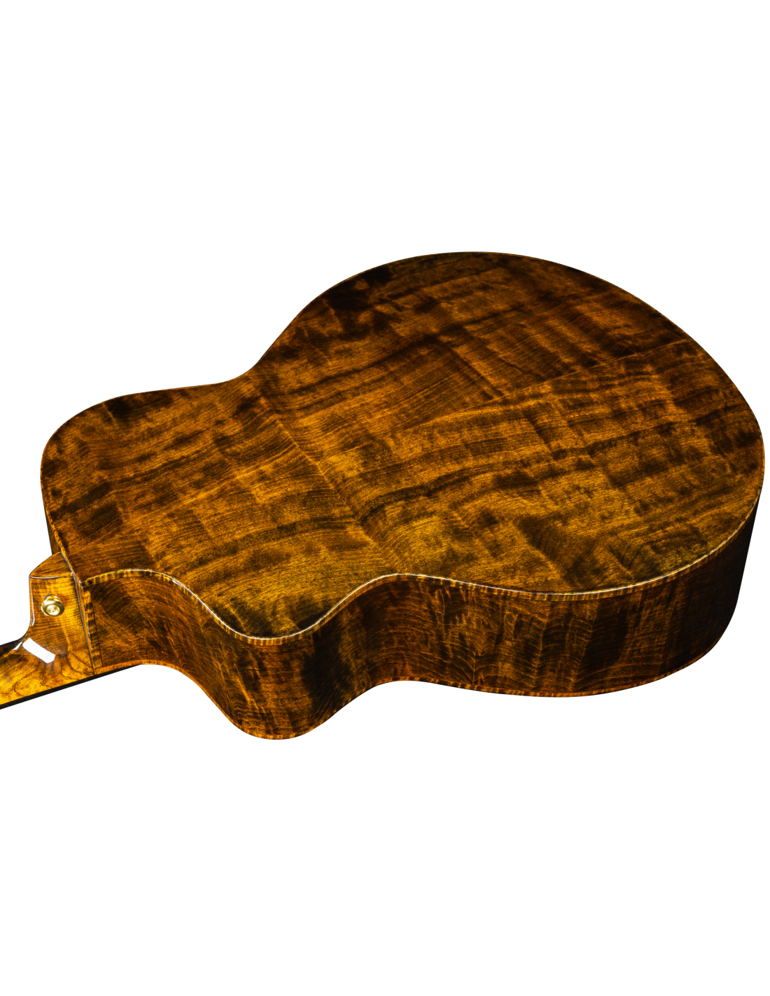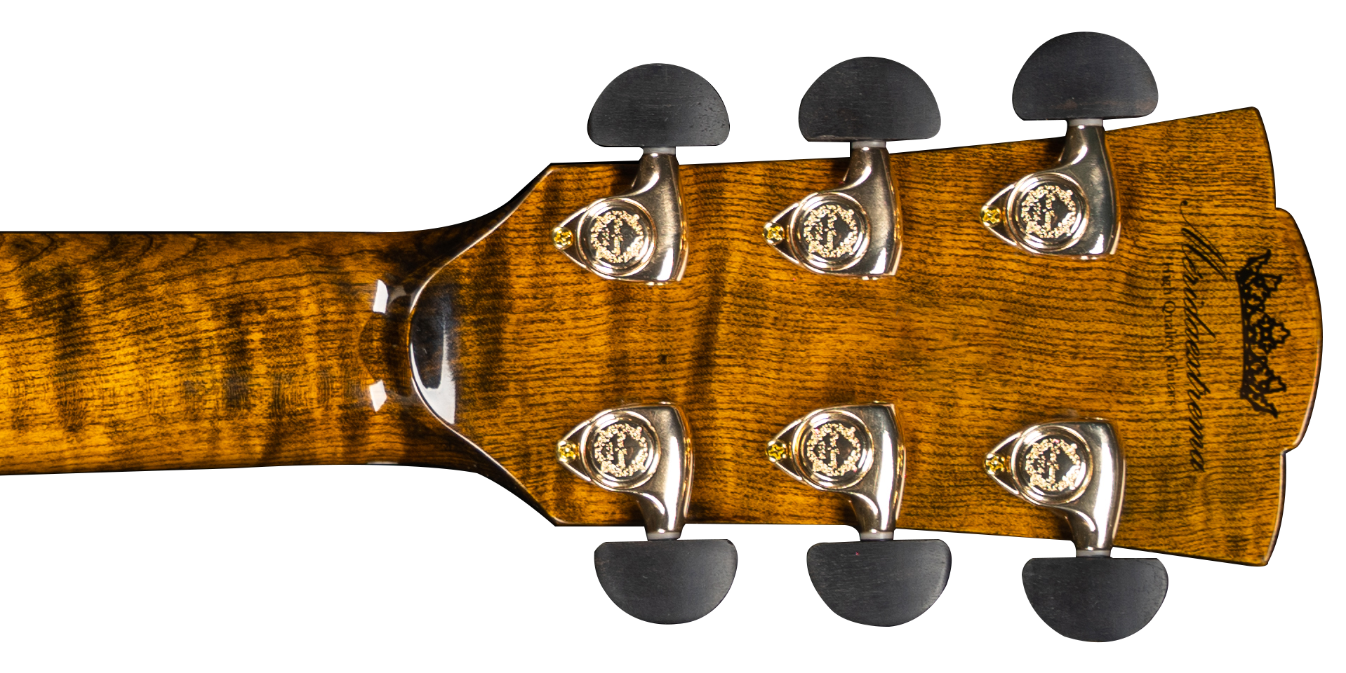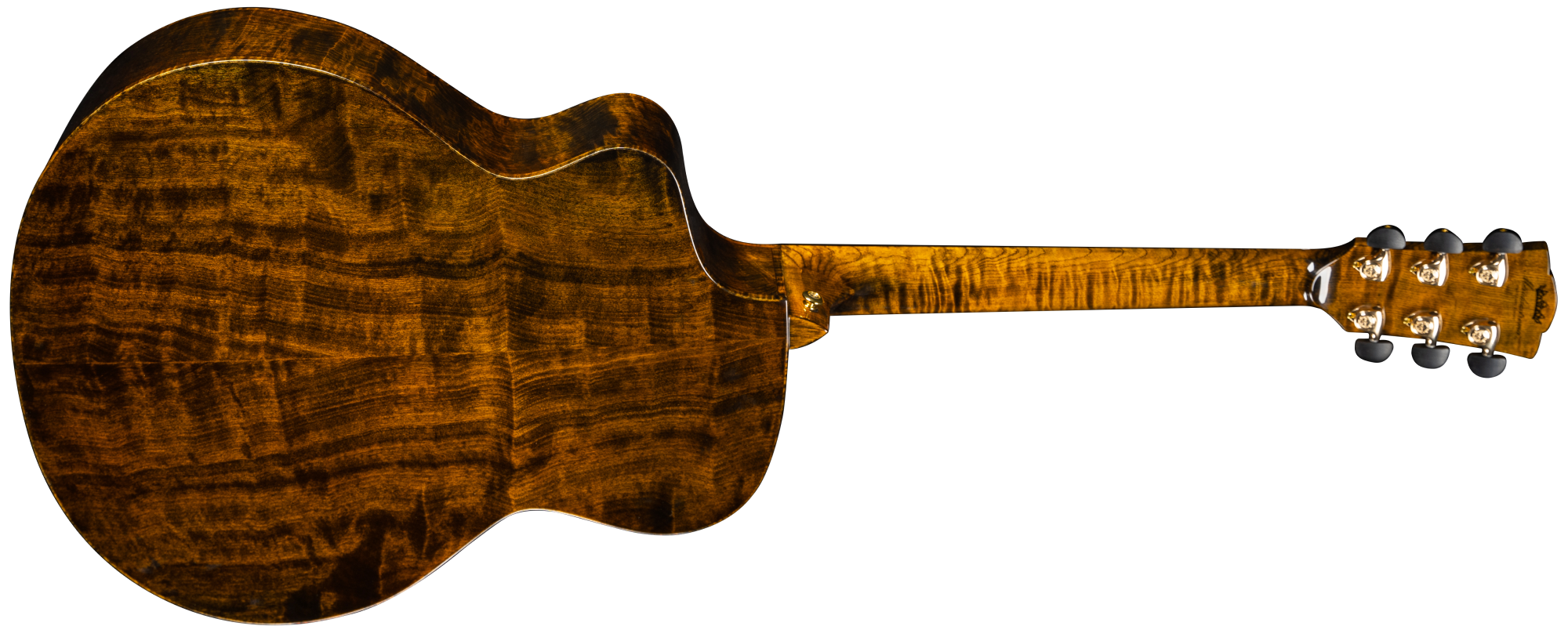 MERIDA WAVE-EH è una chitarra acustica formato Grand Concert a spalla mancante, con top in abete massello europeo a finitura gloss, fondo e fasce in Gold Nanmu massello, manico in acero fiammato con tastiera in Omega laminato, capotasto da 43mm in osso, corde Exp16 premontate, meccaniche dorate con pin in ebano.