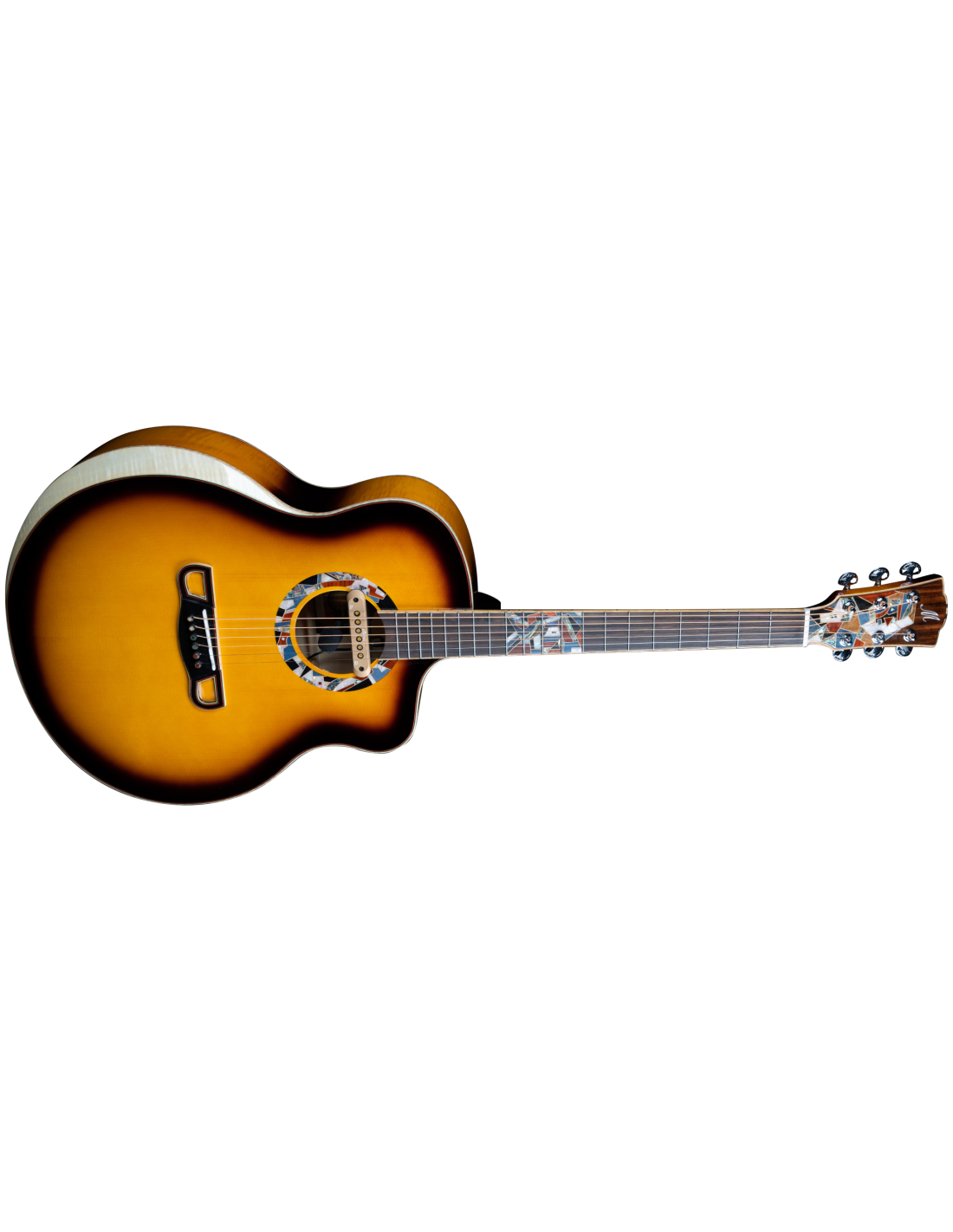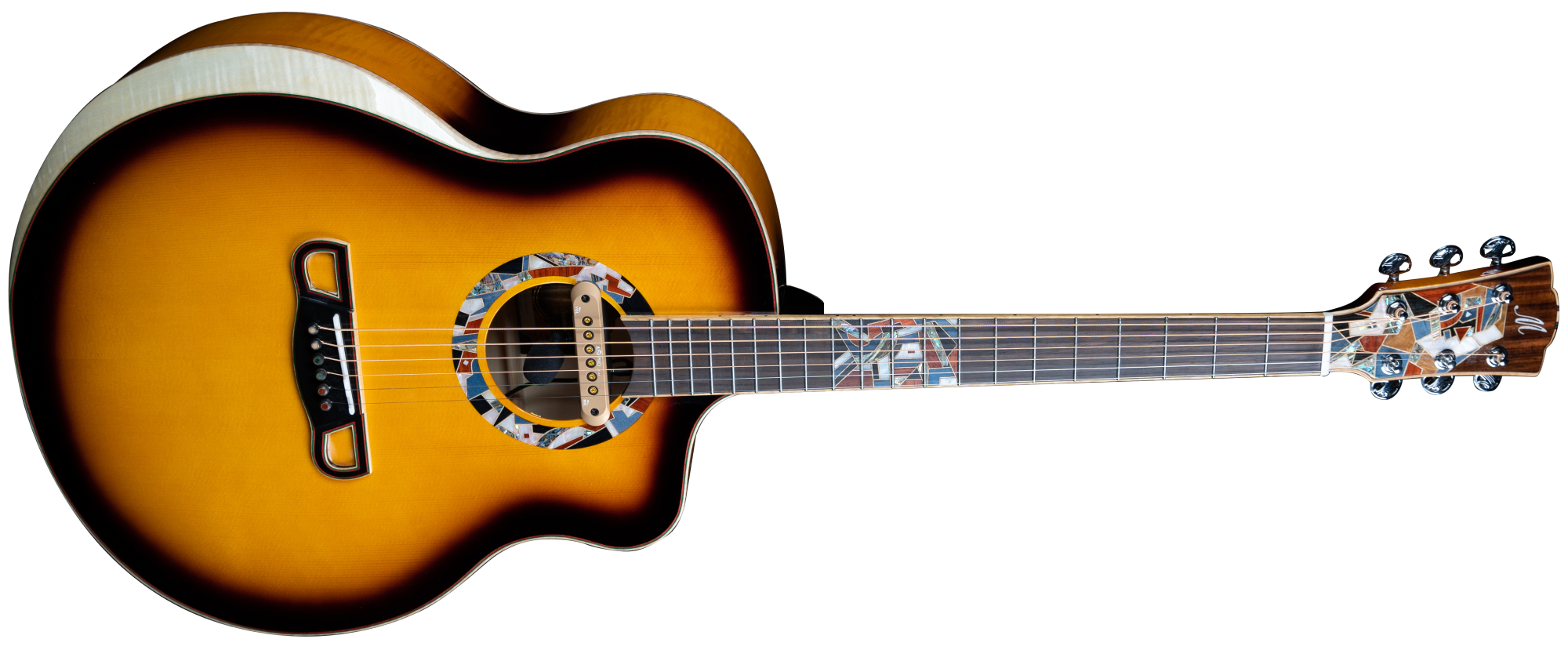 MERIDA CHANCE-SB EQ JUMBO è una chitarra acustica formato Jumbo a spalla mancante, con top in abete massello europeo a finitura gloss, fondo e fasce in Acero fiammato massello, manico in acero monopezzo con tastiera in Omega laminato, capotasto da 43mm in osso, corde Exp16 premontate, meccaniche cromate