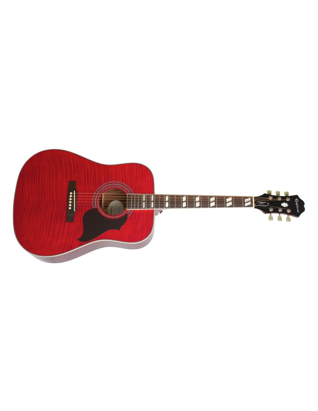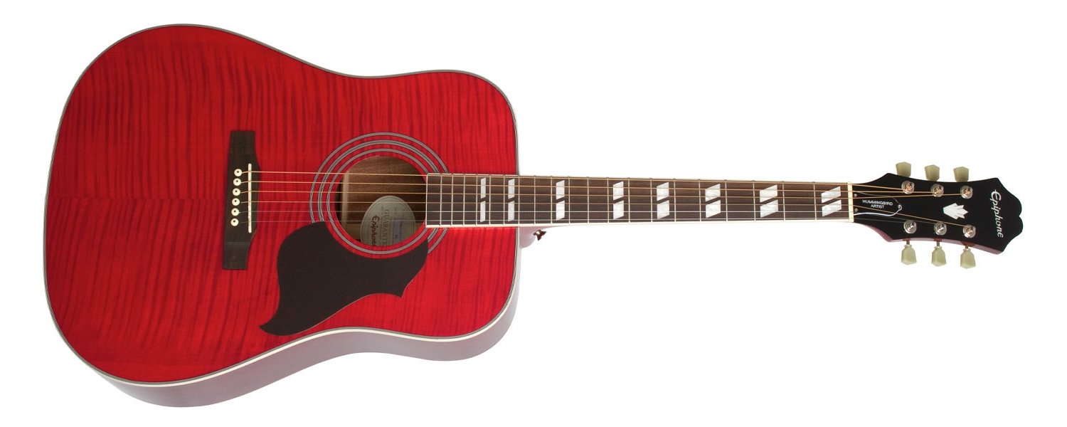 Chitarra Acustica Epiphone Hummingbird Artist colore WINE RED. La Epiphone Hummingbird Artist è una chitarra acustica a 6 corde. Le caratteristiche tecniche includono fondo e fasce in mogano, top in acero fiammato, manico in mogano con profilo 1960's SlimTaper, tastiera in palissandro con intarsi split parallelogram.