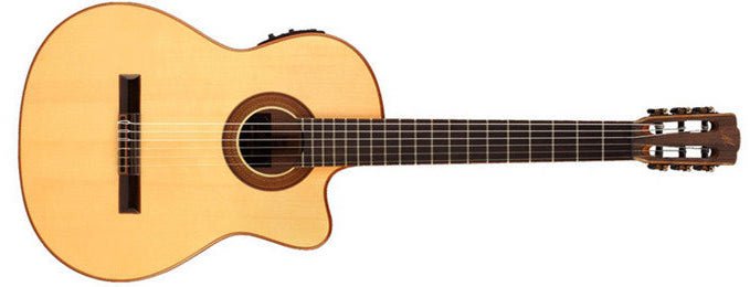 MERIDA T-45 CEQ è una chitarra classica elettrificata formato 4/4 a spalla mancante, con top in Abete Spruce a finitura gloss, fondo e fasce in Mogano massello, manico in Mogano con tastiera in Palissandro, capotasto da 52mm in osso, corde CJ Savarez premontate, meccaniche Black ed elettronica Fishman ISY-201 con accordatore integrato.
