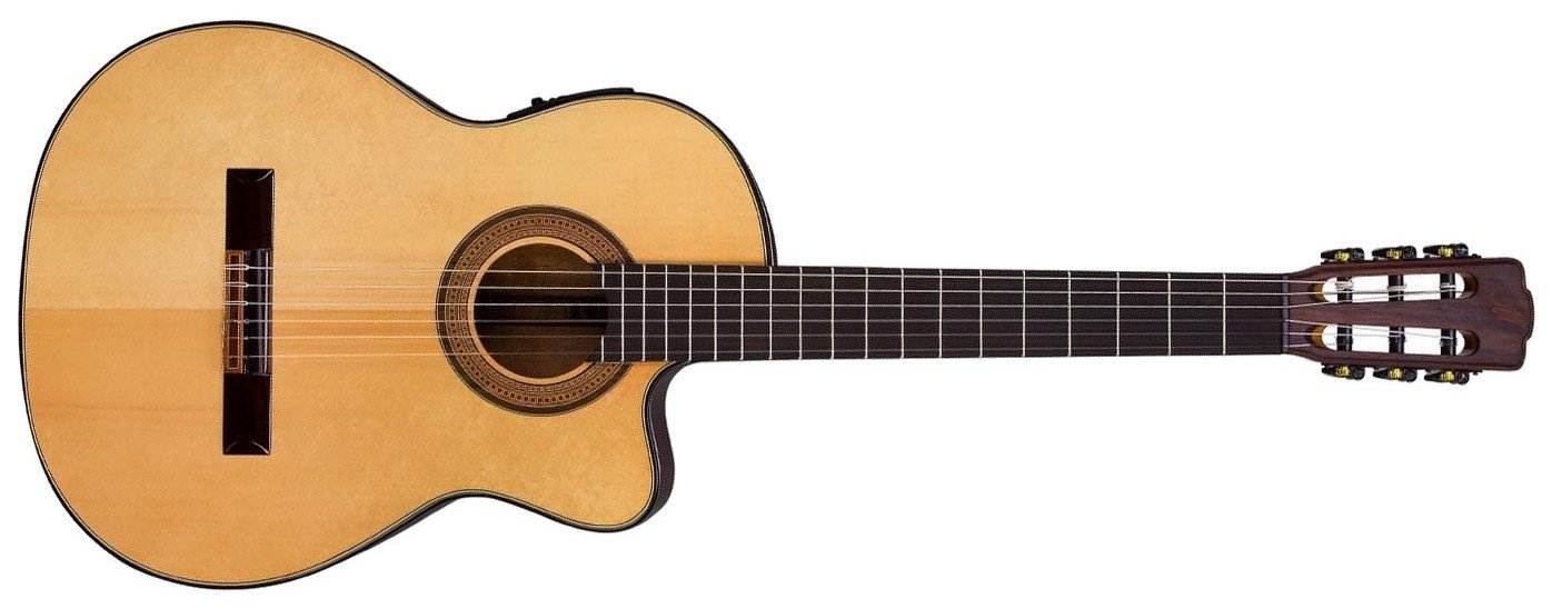 MERIDA T5CES è una chitarra classica elettrificata formato 4/4 a spalla mancante, con top in abete Spruce con finitura gloss, fondo e fasce in Sapele, manico in mogano con tastiera in palissandro, capotasto da 52mm in osso, corde CJ Savarez premontate, meccaniche dorate con black button, elettronica Fishman ISY201 con accordatore integrato.