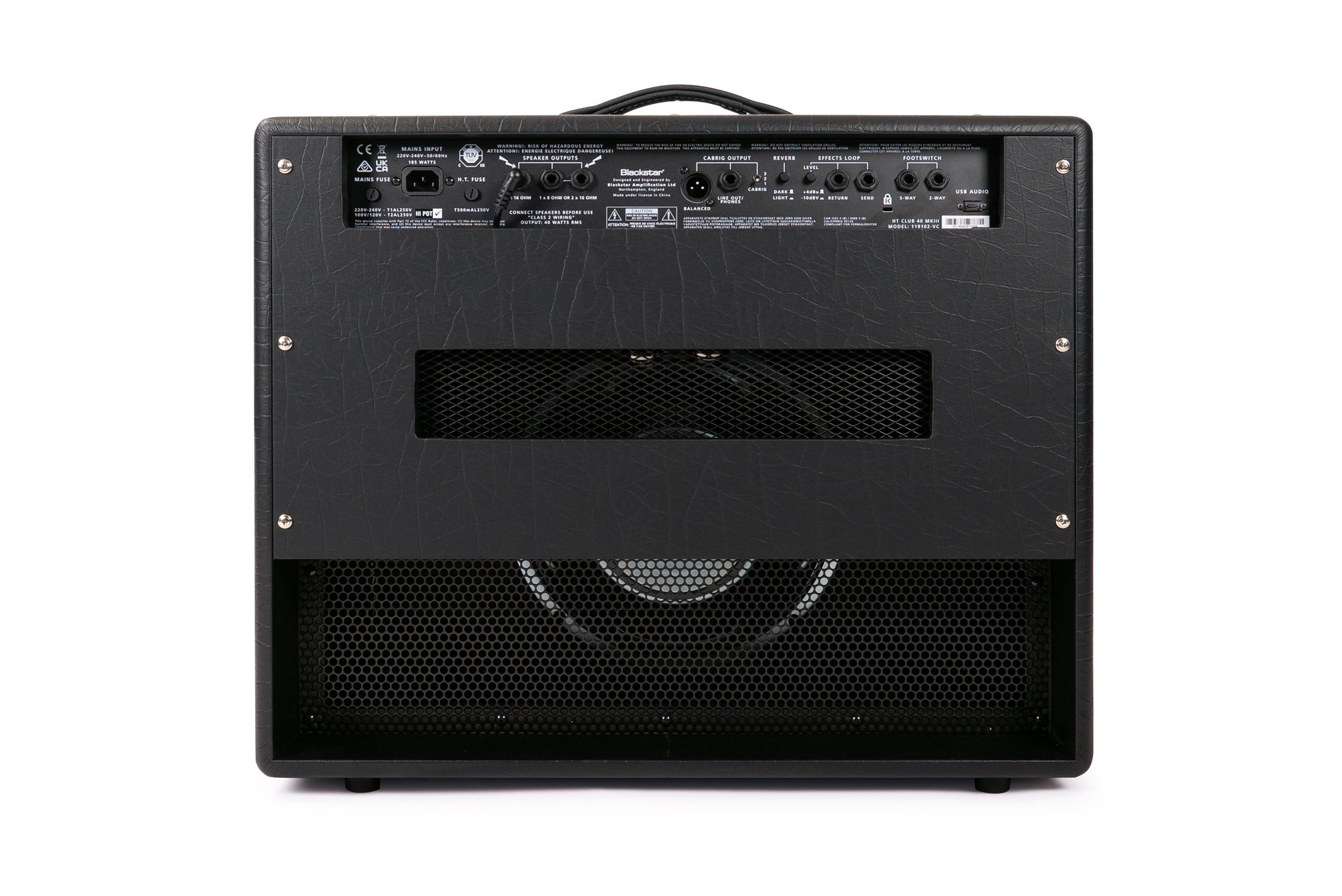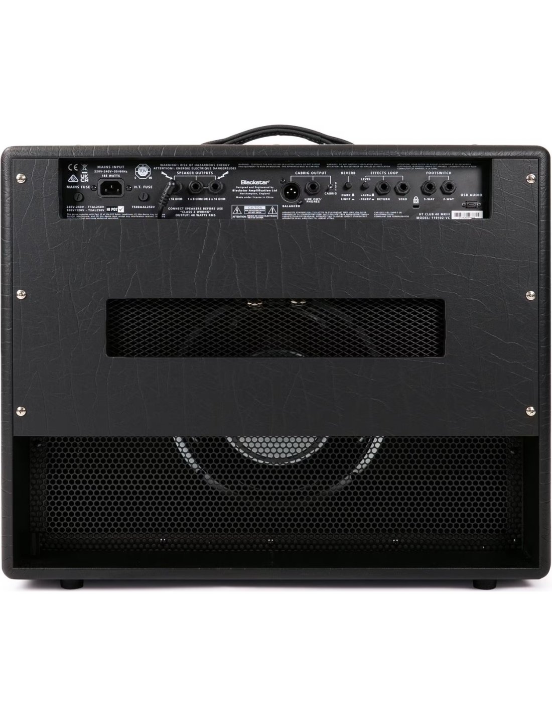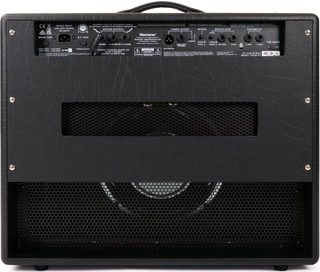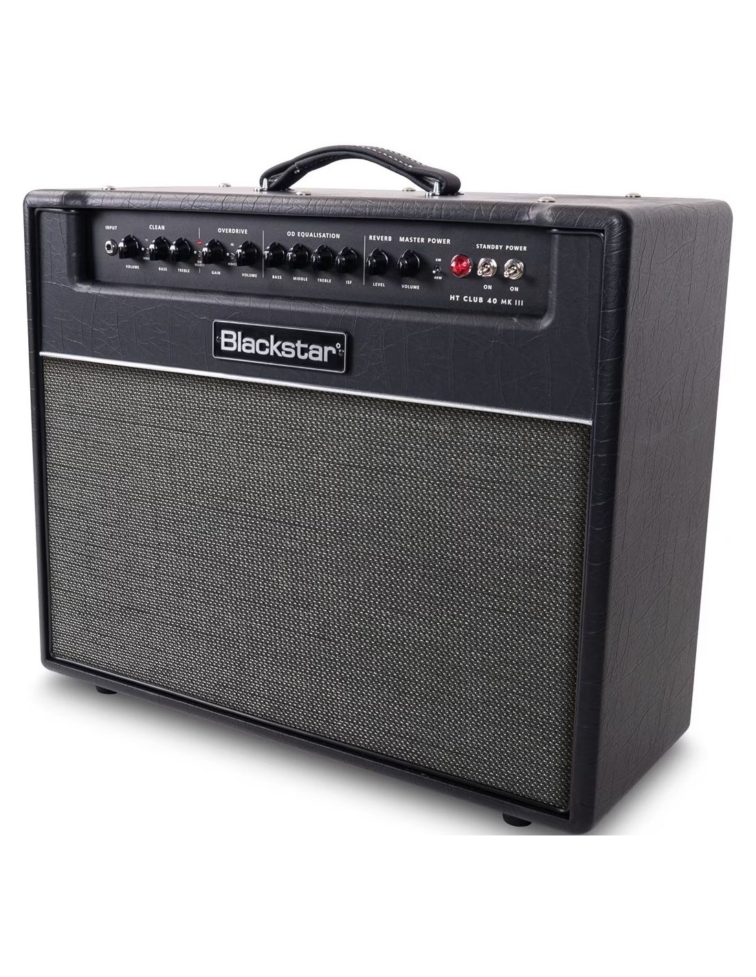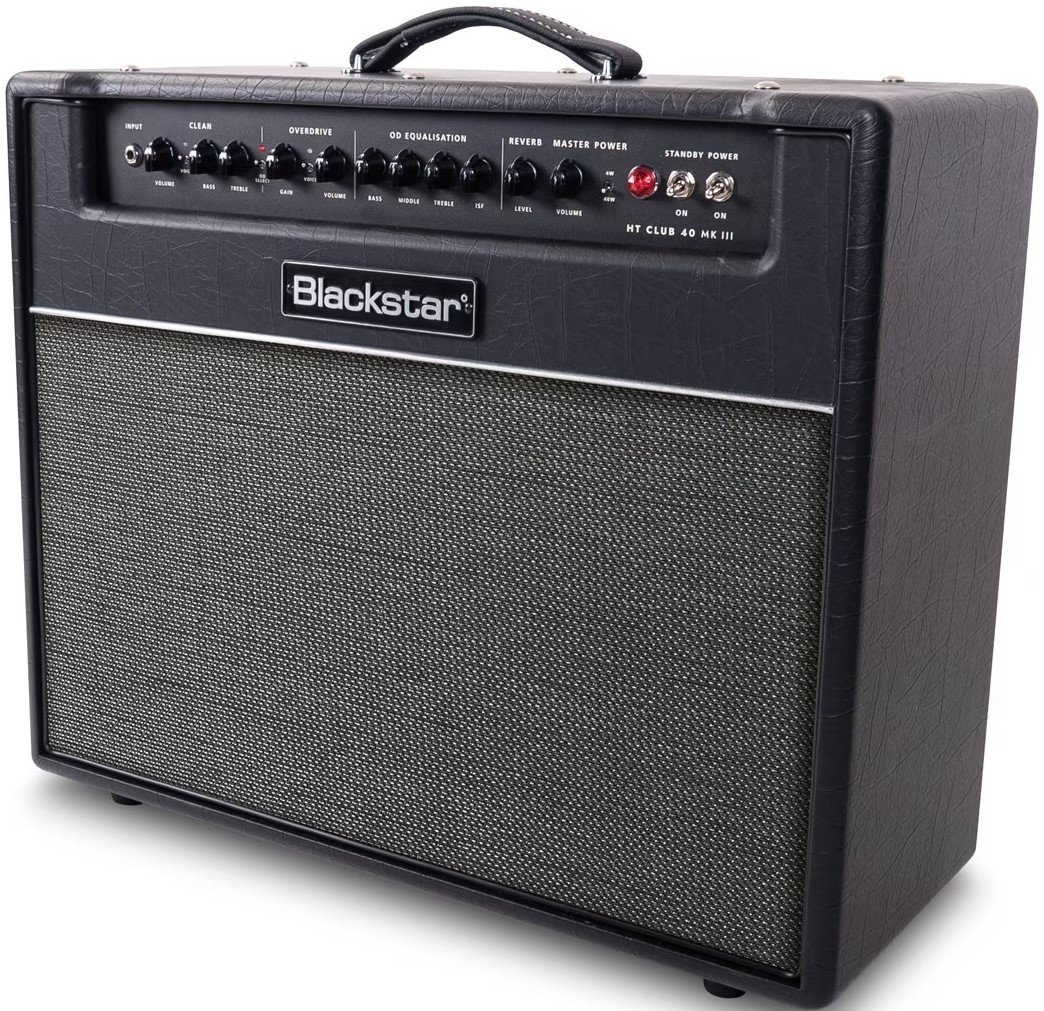 BLACKSTAR HT-40 MKIII. Amplificatore combo valvolare per chitarra a 2 canali con 40W di potenza. Le caratteristiche tecniche includono singolo speaker Celestion da 12", 2 valvole ECC83 e 2 valvole di potenza EL34, 2 canali selezionabili da footswitch: Boutique Clean e Overdrive, circuito brevettato ISF (Infinite Shape Feature) che regola l'equalizzazione tramite un singolo encoder, riverbero digitale integrato con switch Dark/Light, funzione Power Reduction per ridurre i 40W di potenza del 10%, funzione di emulazione di cabinet a 2 voci selezionabili tramite switch: 1x12" o 4x12", Eq a 2 bande sul canale Clean e a 3 bande sul canale Overdrive. Presenta connessioni jack 1/4" per ingresso footswitch, FX send/return, line out/phones e uscite speaker, connessione XLR per la direct out, slot USB per la registrazione audio.