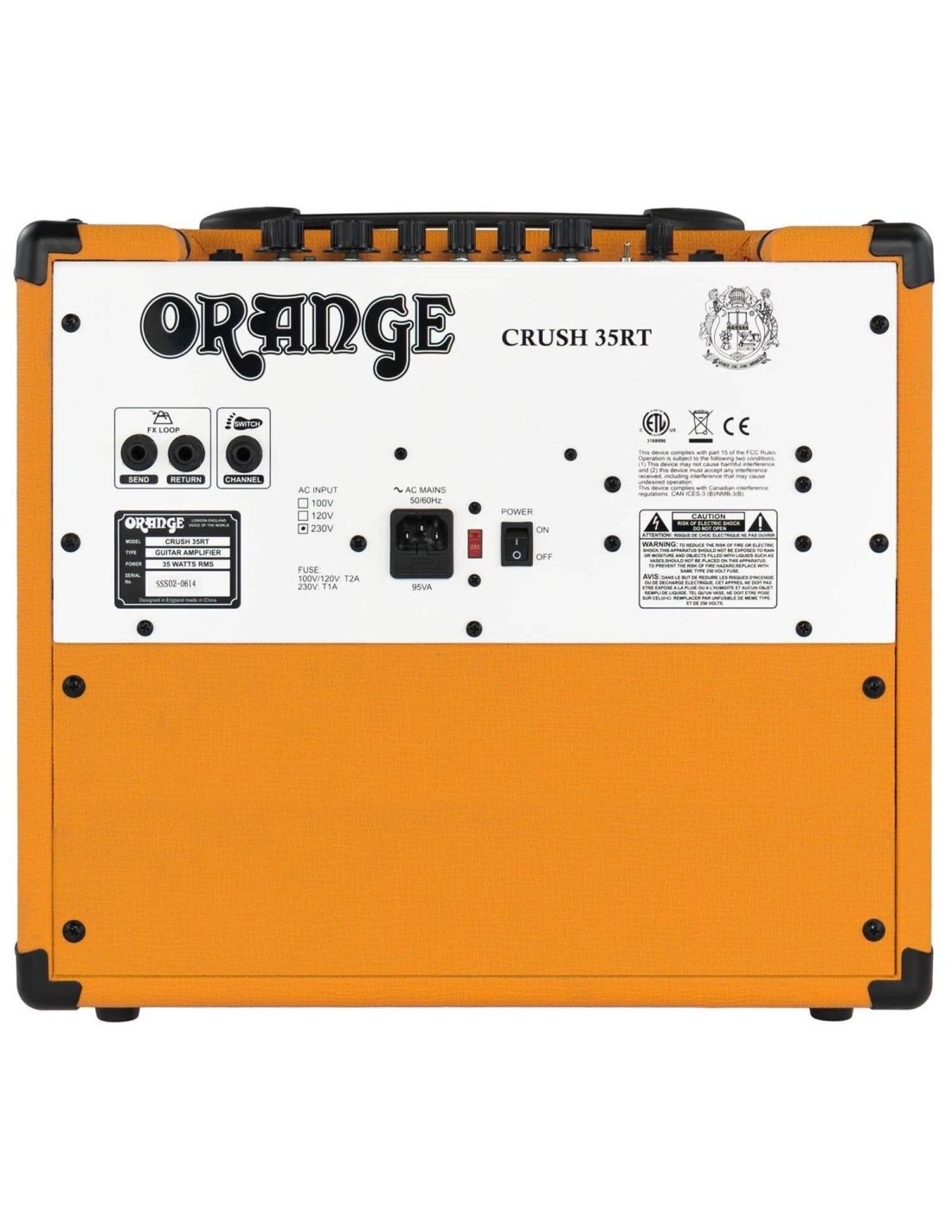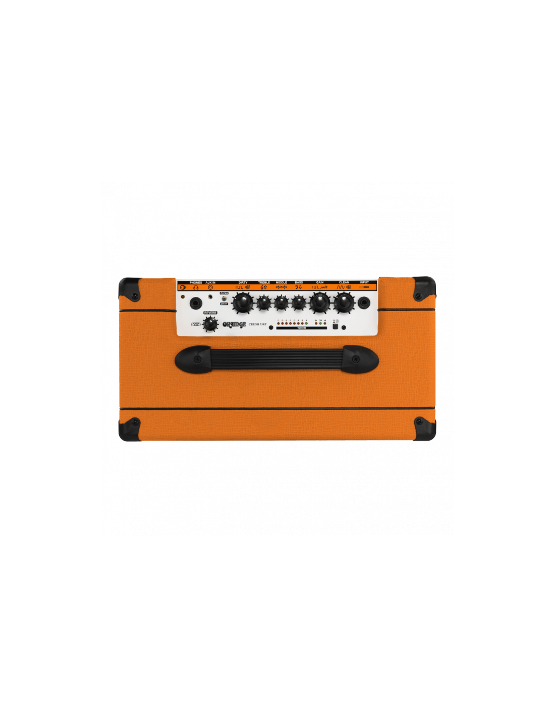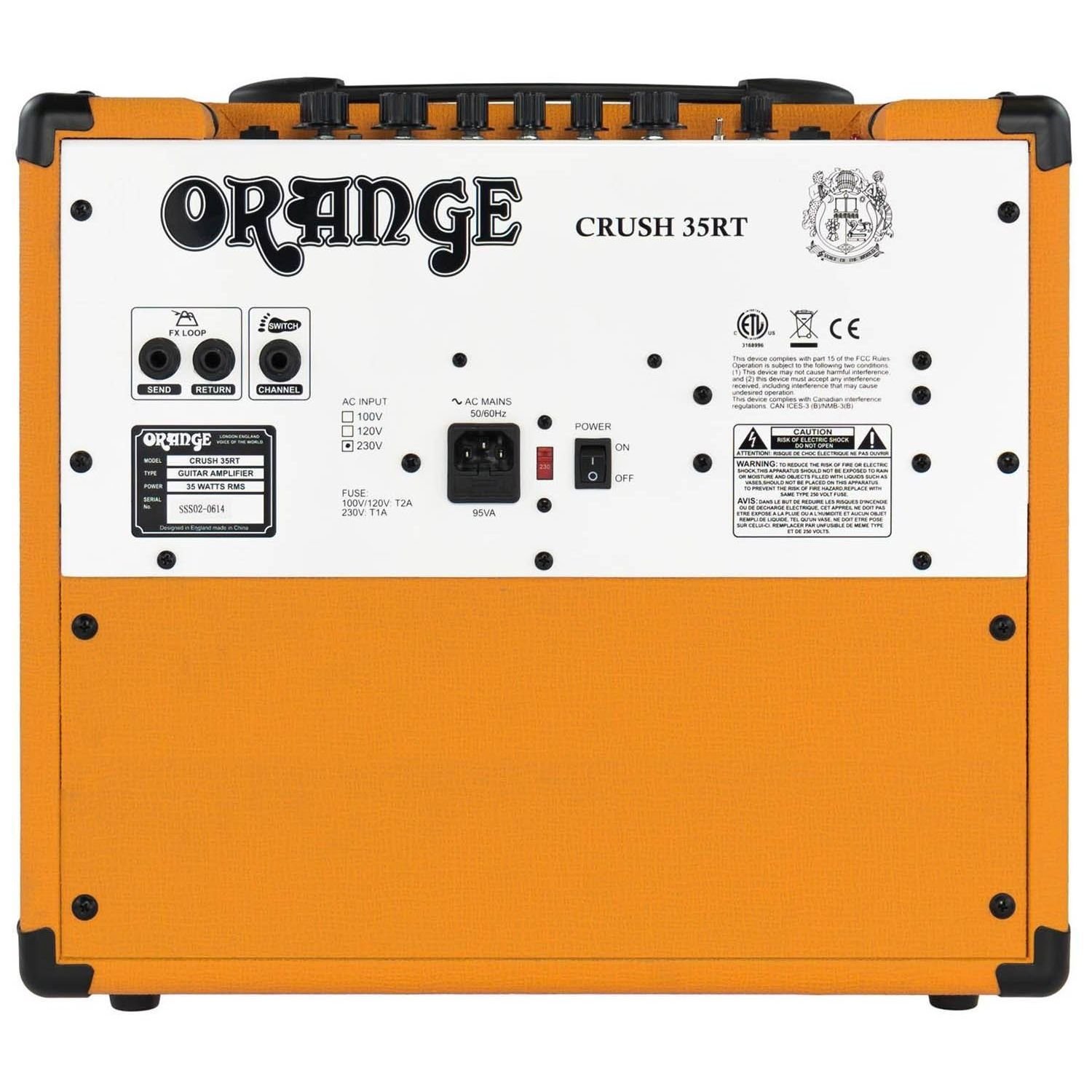 Amplificatore per Chitarra Elettrica Orange Crush 35RT. L'Orange Crush 35RT è un amplificatore solid state per chitarra elettrica da 35 watt. E’ dotato di 2 canali (Clean/Dirty), 3 band EQ, reverb, tuner, uscita cuffie, ingresso aux in, effect loop, cabinet simulation, 1 speaker da 10”.