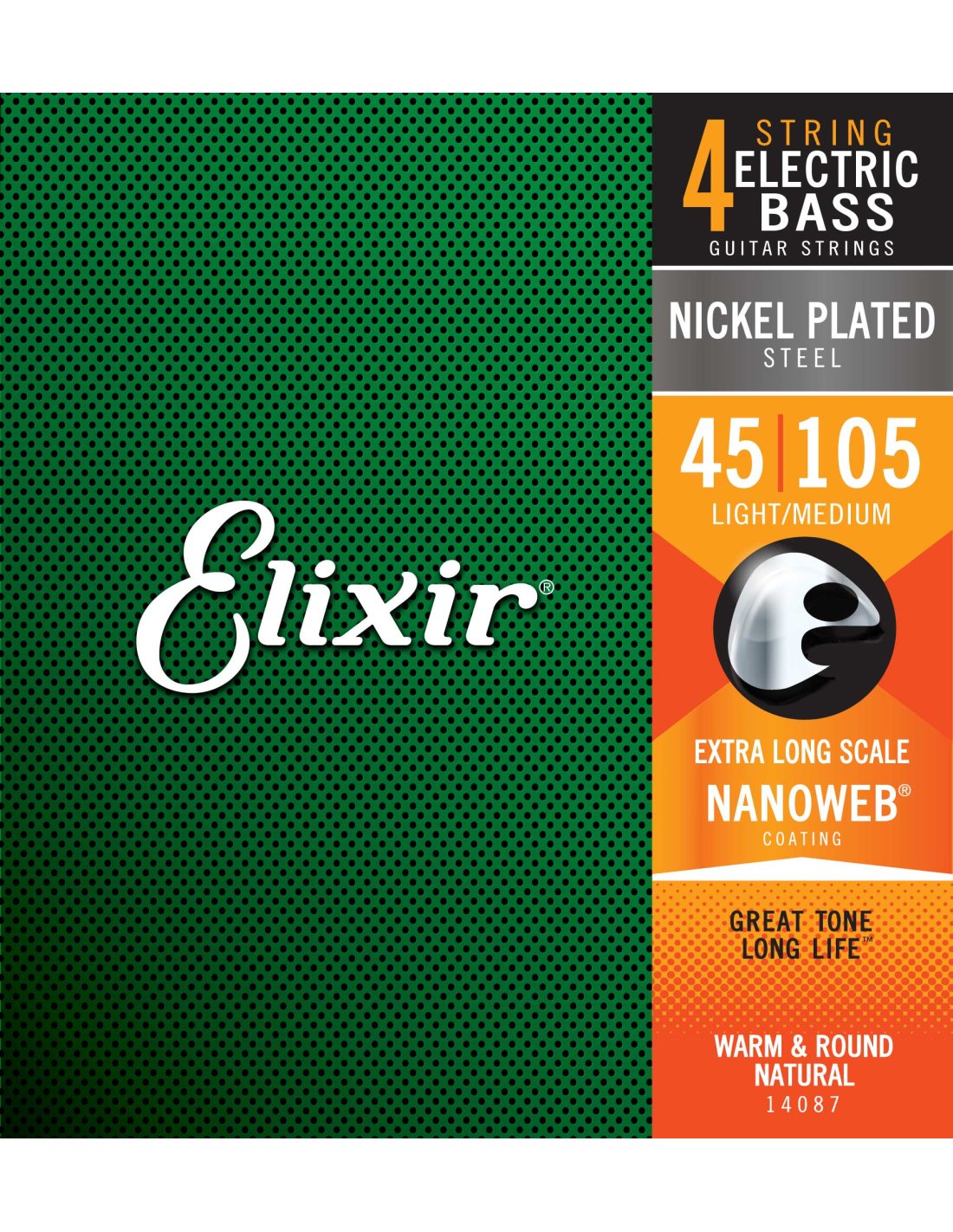 Corde per basso elettrico con avvolgimento a sezione rotonda in acciaio nickelato. Utilizzate per un suono pieno e rotondo, con incredibile pulizia e presenza mid-range. Rivestimento NANOWEB™, appositamente studiato per il basso, offre un feeling naturale e morbido, oltre ad incrementare il grip. La nostra tecnologia di rivestimento protegge dalla corrosione e dall'accumulo di sporcizia, prolungando la qualità sonora più di ogni altra corda, coated o uncoated, sul mercato. (Elixir Strings player survey). Il rivestimento riduce anche lo scricchiolio delle corde. Extra Scala Lunga, Scalatura Light/Medium: .045 .065 .085 .105