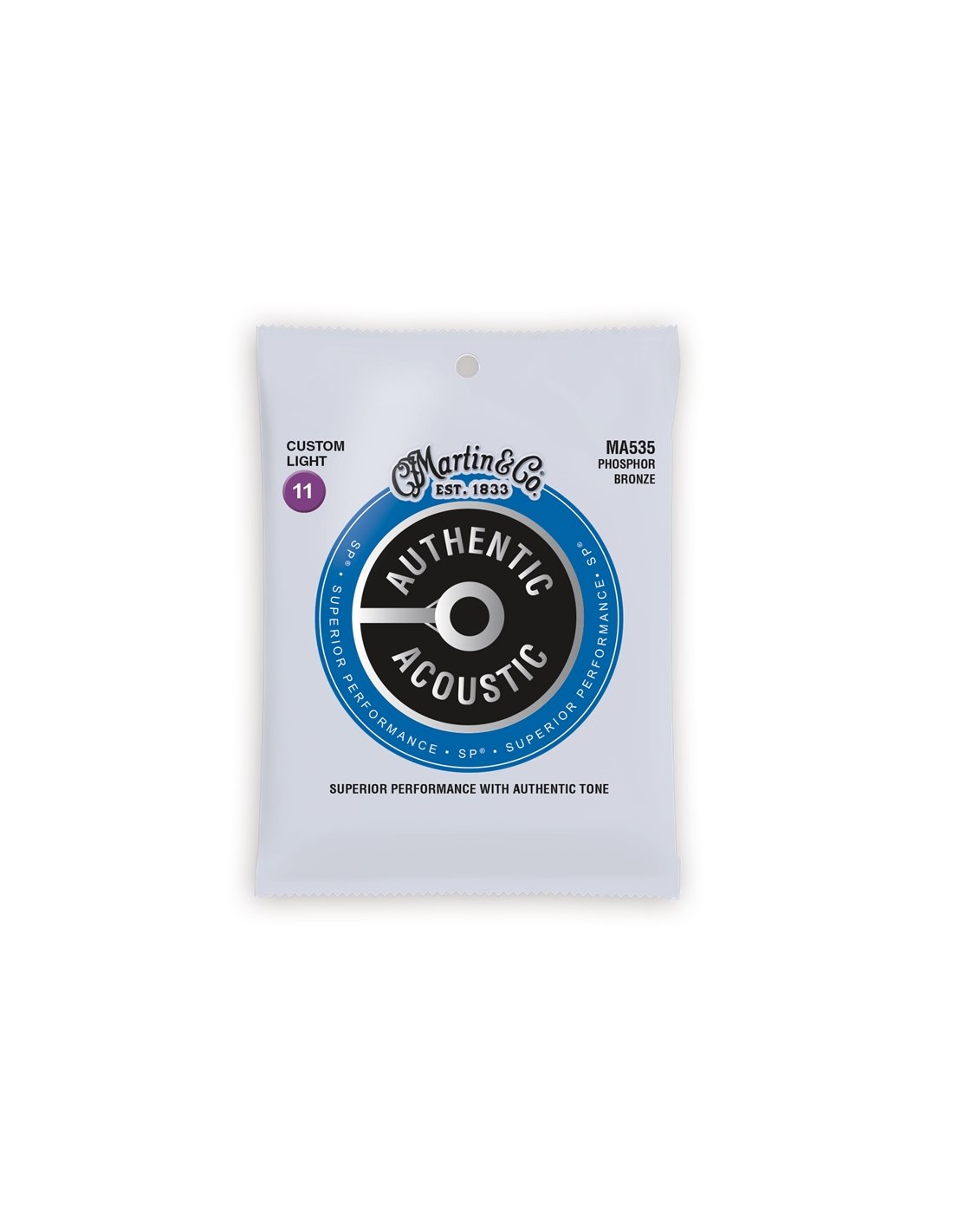 Corde per Chitarra Acustica Martin MA535 Authentic Custom Light Ph/Bronze 11/52. Le Martin MA535 Authentic Custom Light Ph/Bronze 11/52 sono un set di corde per chitarra acustica phosphor bronze con scalatura custom light .011 .015 .023w .032w .042w .052w.