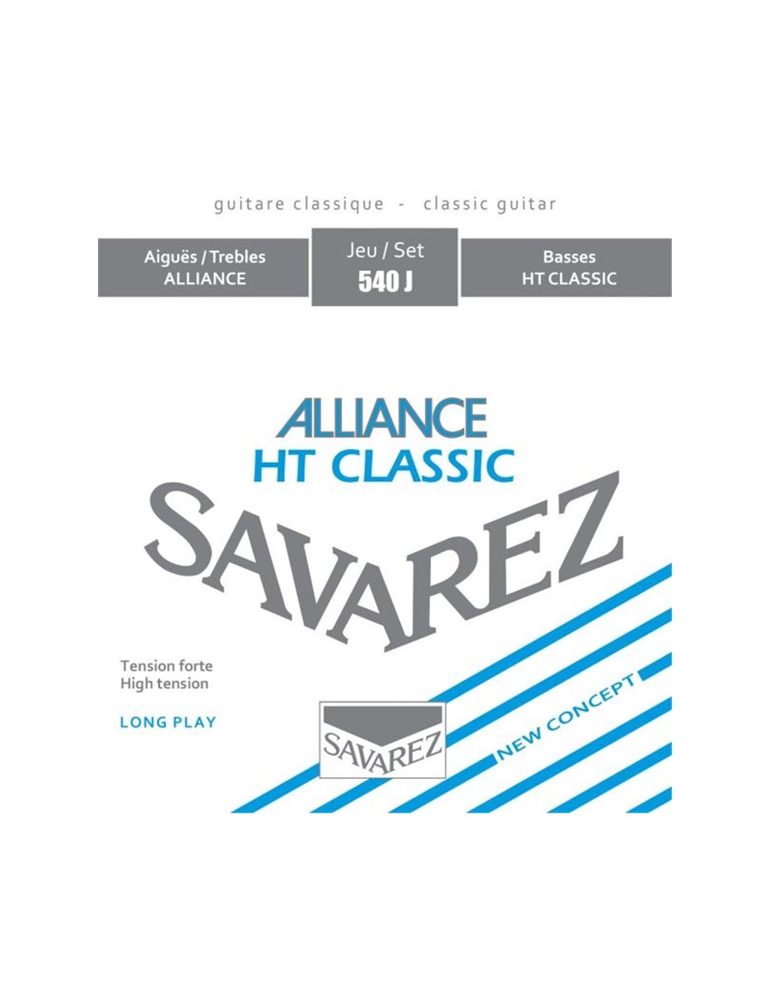 Corde per Chitarra Classica Savarez 540J. Le Savarez 540J sono un set di corde per chitarra classica con HT Classic basses silverplated wound, KF Alliance trebles carbon, high tension, scalatura .025 .028 .034 .030 .036 .044.