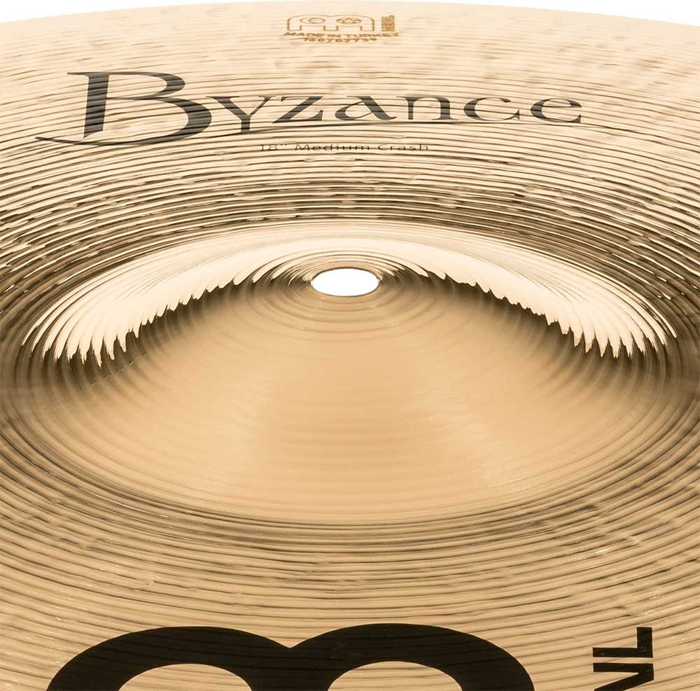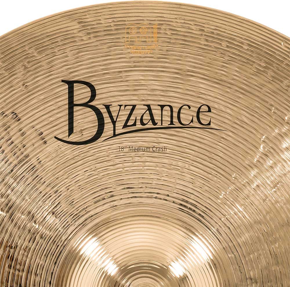 'Crash 18'' Medium, Serie Byzance Brilliant. I piatti della serie Byzance Brilliant sono prodotti artigianalmente nella nostra fabbrica in Turchia da specialisti e rispettando la tradizione in tutto il processo. Tutti i piatti sono realizzati con dischi in lega di bronzo B20. Varie tecniche sono coinvolte nel processo, sia la martellatura che la tornitura. Oltre a questo ricevono una laccatura lucida che conferisce loro un suono più esplosivo e una spettacolare finitura lucida.