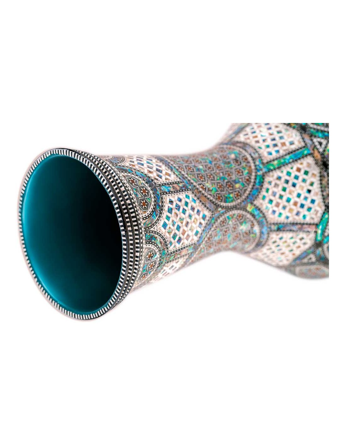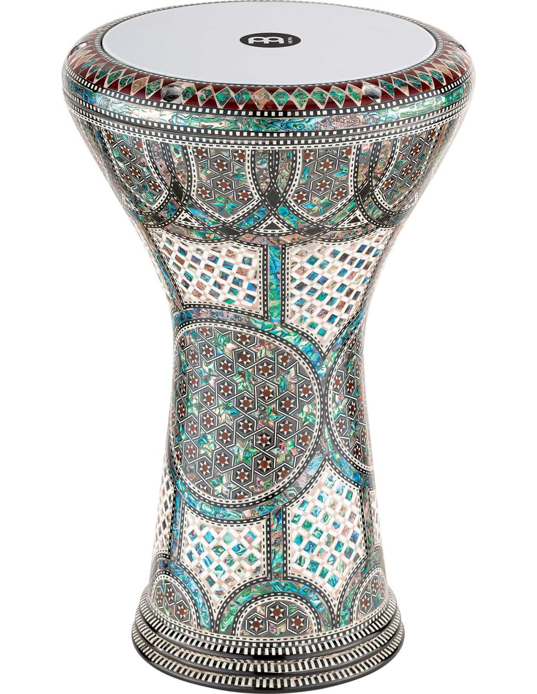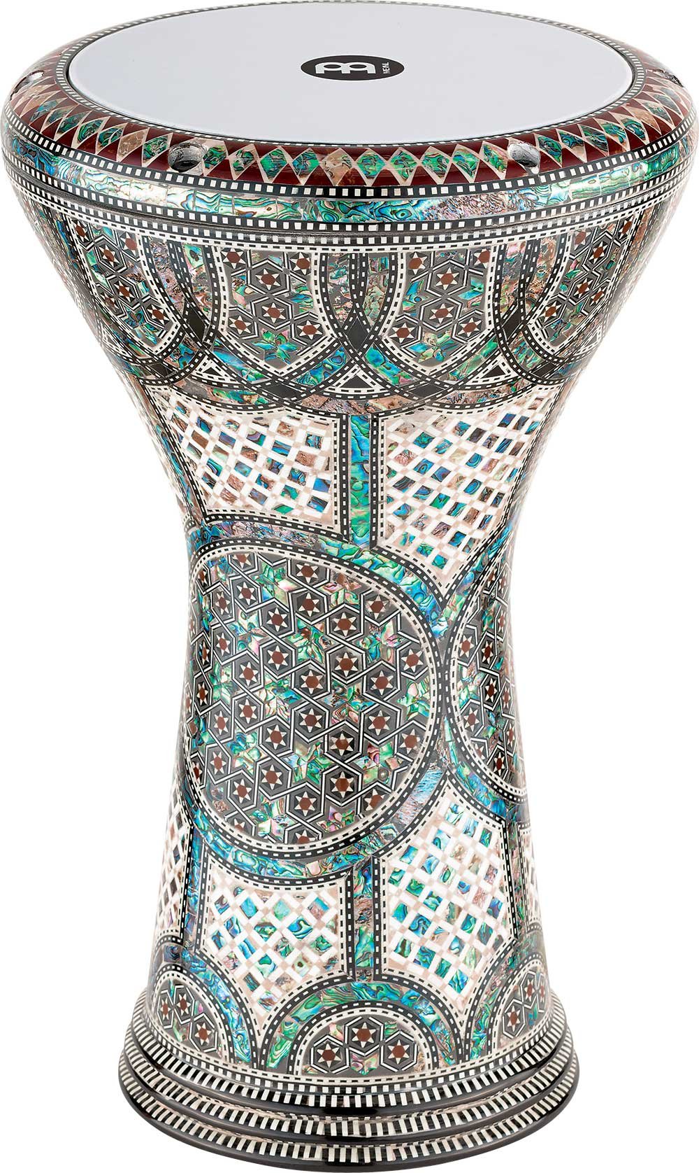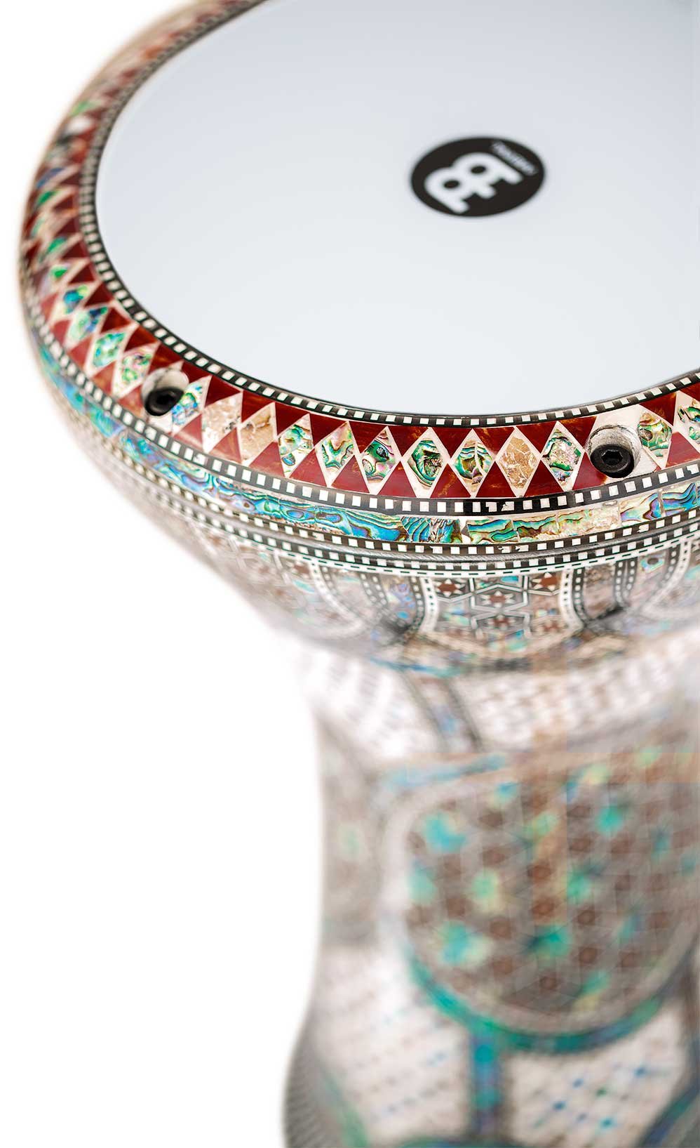 MEINL AEED3 è un Doumbek egiziano da 8,75", realizzato in alluminio pressofuso con finitura a mosaico egiziano ed intarsi in madreperla, della serie Meinl Artisan Edition. Presenta pelle battente sintetica bianca premontata con sistema di regolazione della tensione a vite