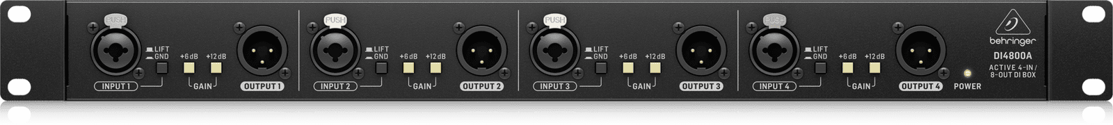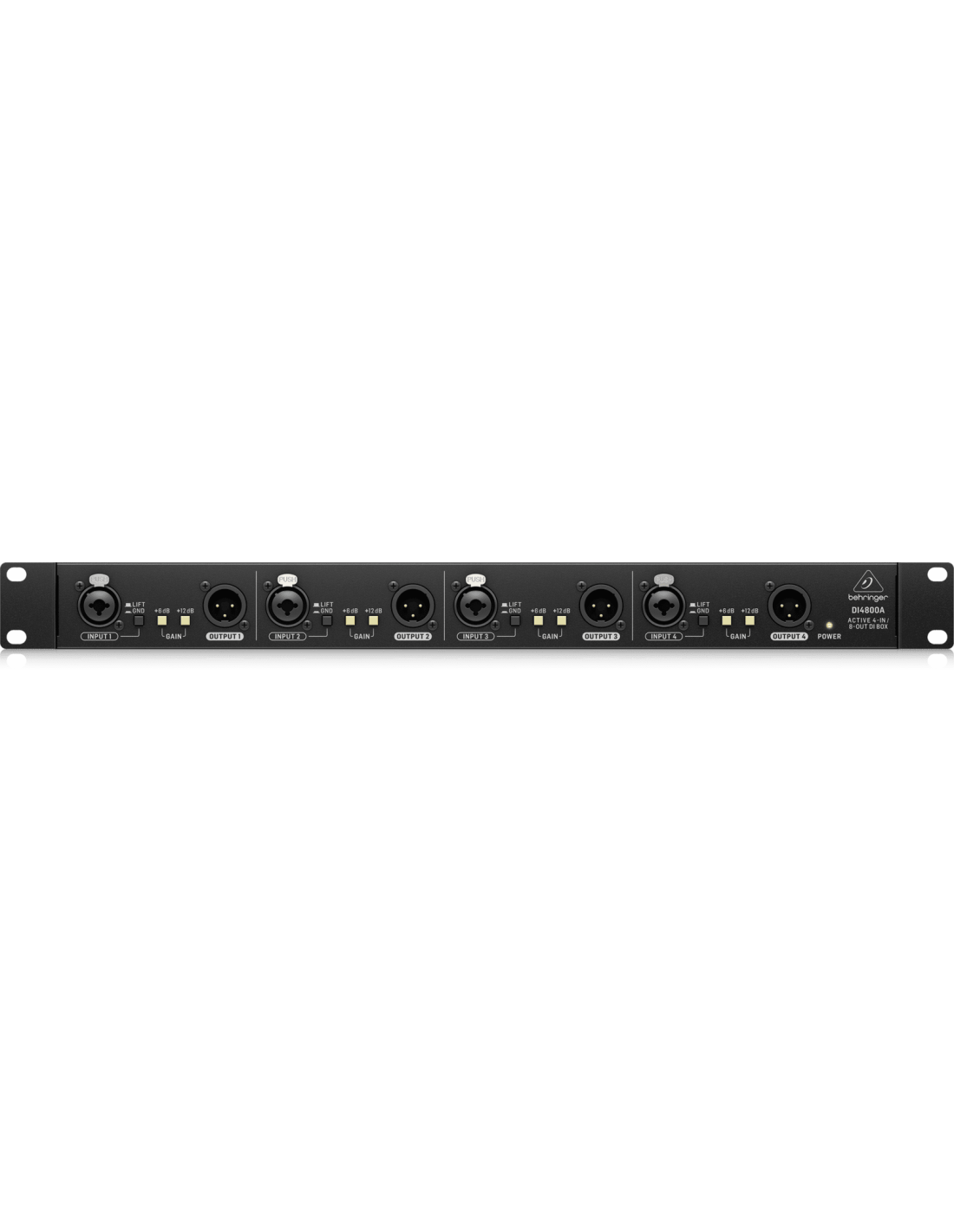BEHRINGER DI4800A è una D.I. box attiva 4 canali a rack. Nella parte anteriore, ogni canale presenta input combo XLR/TRS e uscite XLR che si sommano alle 4 uscite XLR presenti sul pannello posteriore, per 8 uscite bilanciate in totale; ogni uscita presenta un tasto di attenuazione a -20db. Doppio Gain switch per boostare il gain di +6db, +12db, interruttore Ground lift.