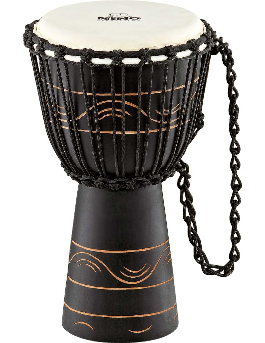 Gli originali djembe in legno Nino, in stile africano e con sistema di accordatura a corda, sono tagliati da un unico pezzo di mogano massiccio proveniente da una piantagione. Questi strumenti di grande qualità sono realizzati a mano, con una grande attenzione ai dettagli, per fornire un suono eccezionale. Realizzato in mogano. Misura S.