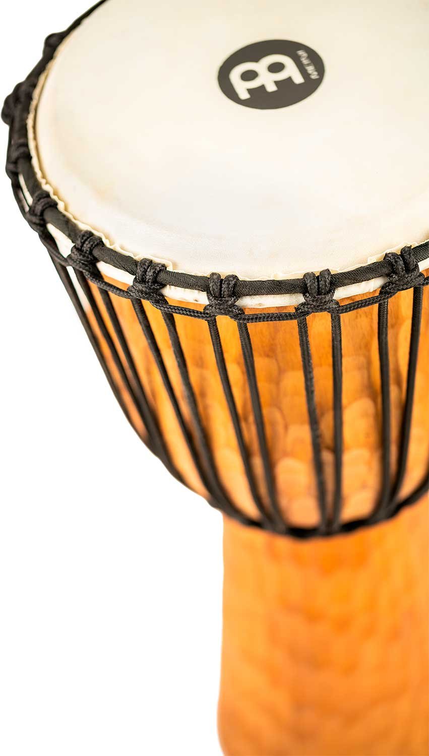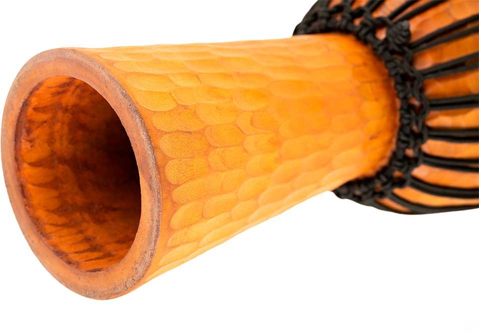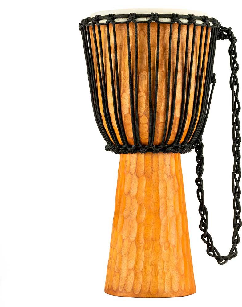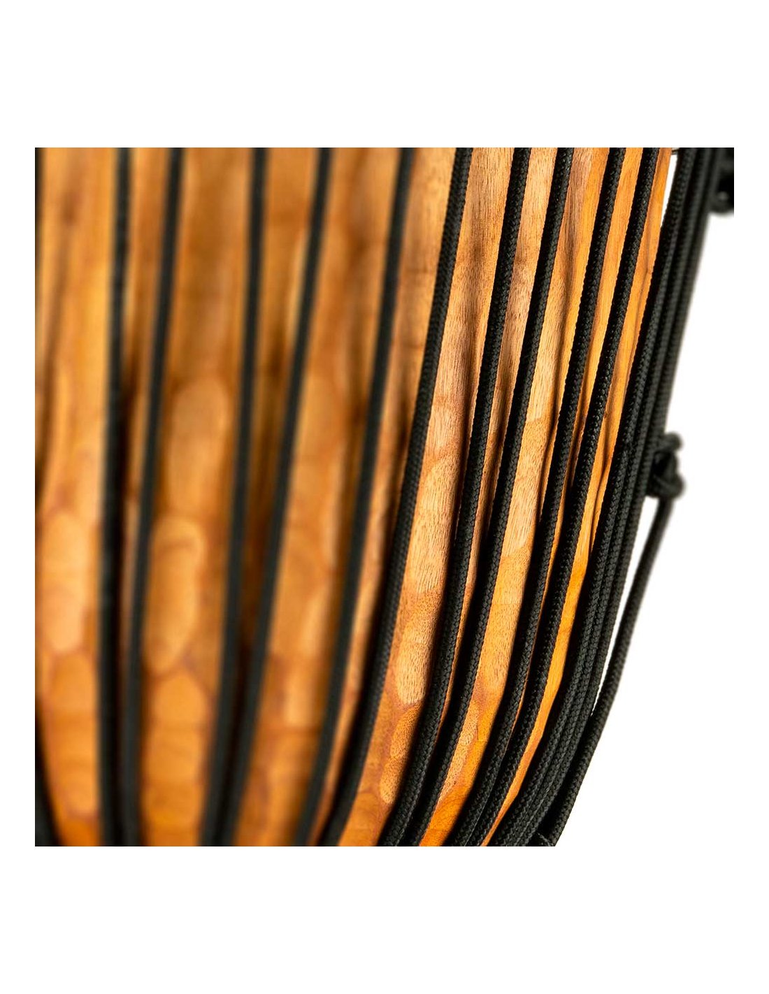 'Djembe in legno da 12''''. Questi Djembes sono ricavati da un solido pezzo di legno di mogano coltivato in piantagione, e sono intagliati a mano con un motivo di increspatura orizzontale che suggerisce un fiume che scorre. Questo rende anche il djembe facile da fissare tra le ginocchia. La testa del tamburo in pelle di capra selezionata a mano è accordata con il tradizionale sistema di corde del Mali.