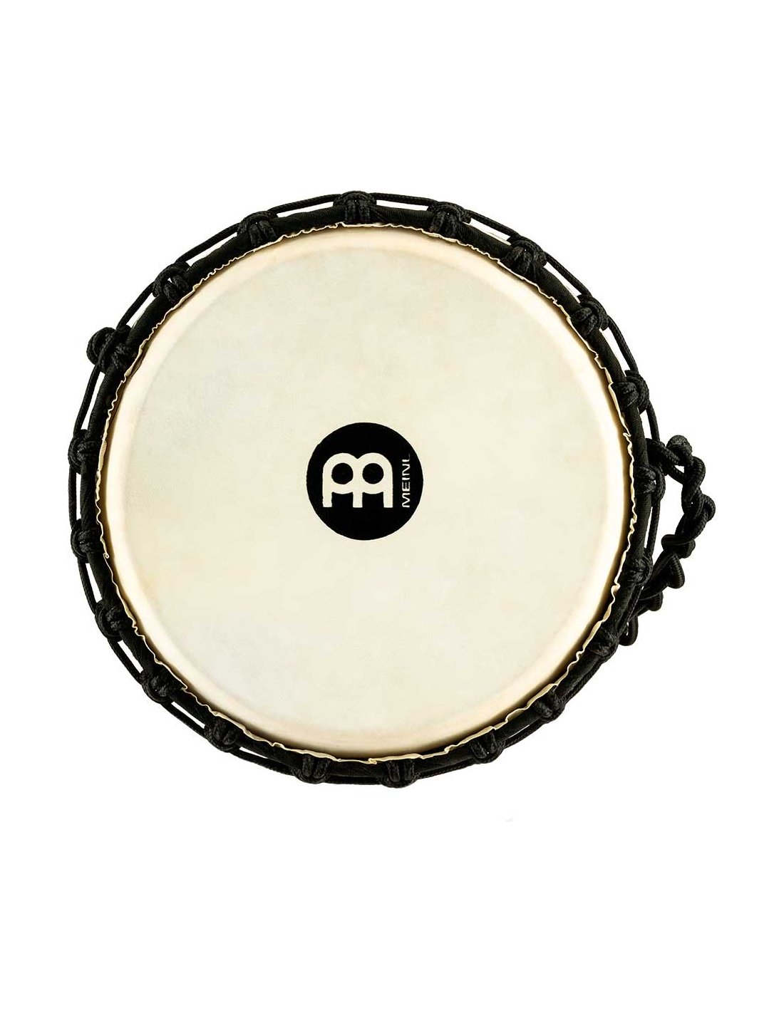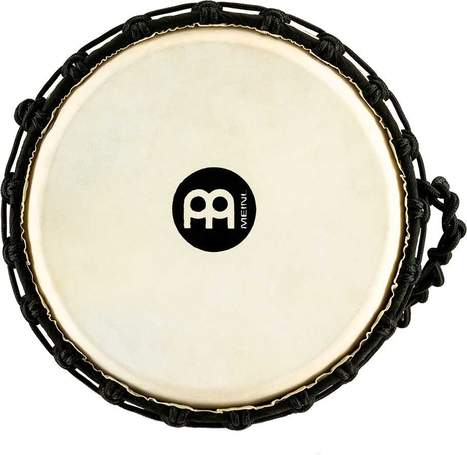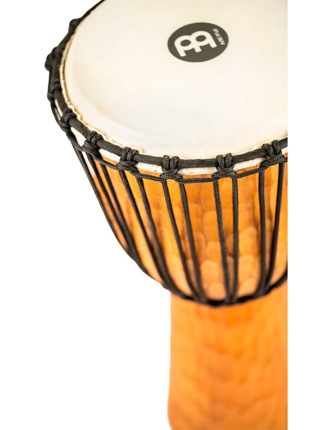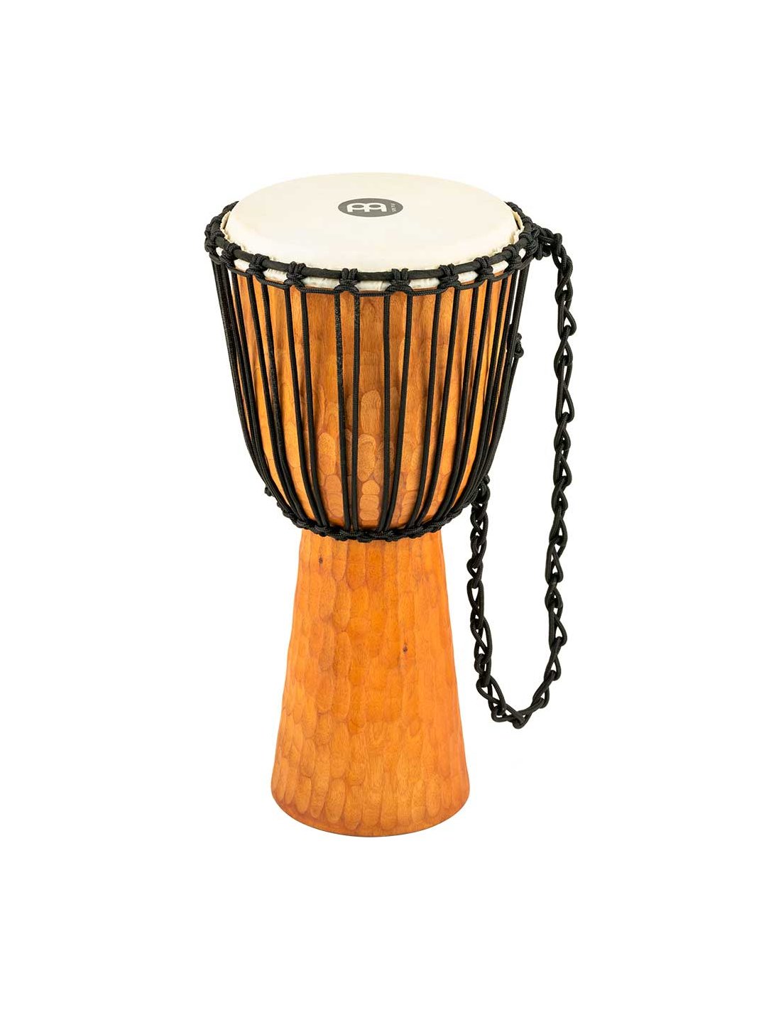 'Djembe in legno da 12''''. Questi Djembes sono ricavati da un solido pezzo di legno di mogano coltivato in piantagione, e sono intagliati a mano con un motivo di increspatura orizzontale che suggerisce un fiume che scorre. Questo rende anche il djembe facile da fissare tra le ginocchia. La testa del tamburo in pelle di capra selezionata a mano è accordata con il tradizionale sistema di corde del Mali.